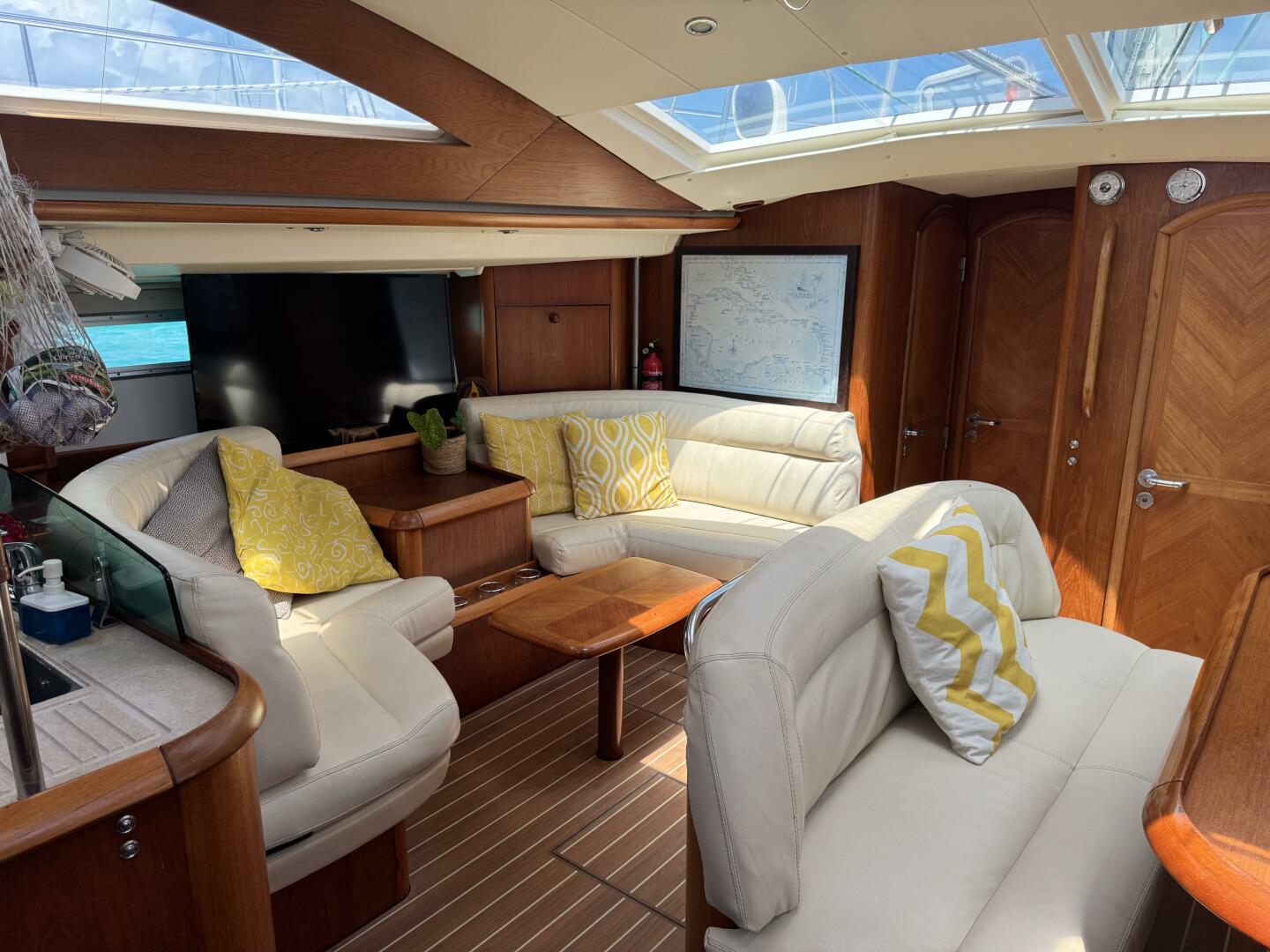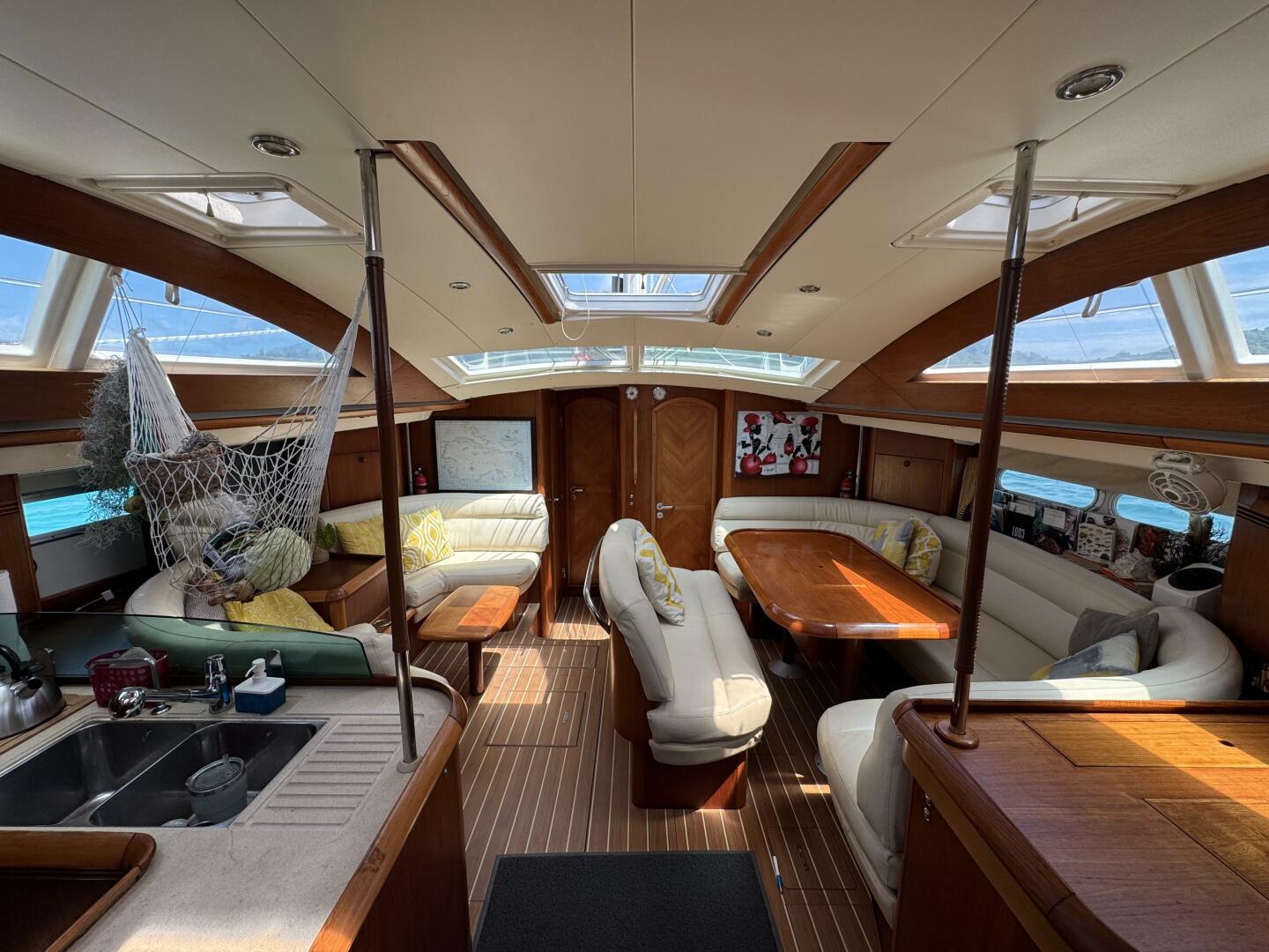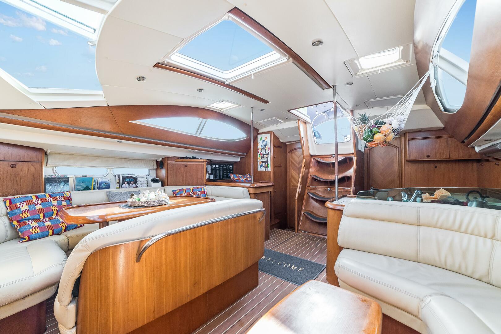 The deck layout is clean and efficient, with all lines led aft for easy single or shorthanded sailing. Her large, protected cockpit offers plenty of seating and is ideal for both sailing and entertaining. Twin helms provide excellent visibility and control.