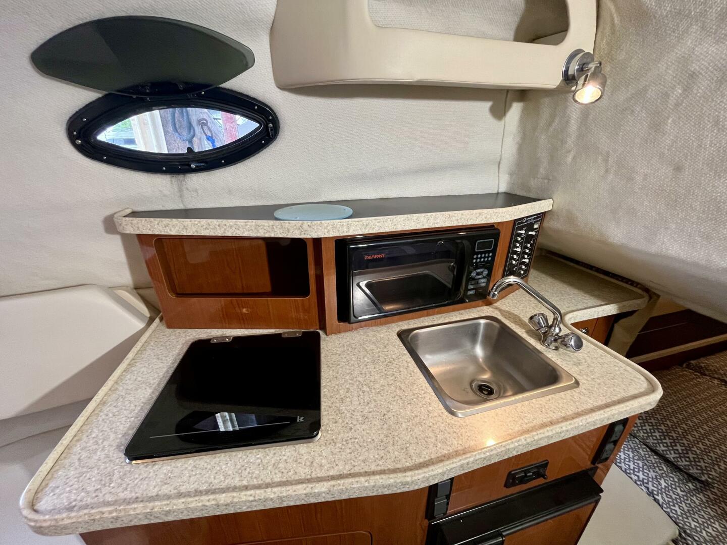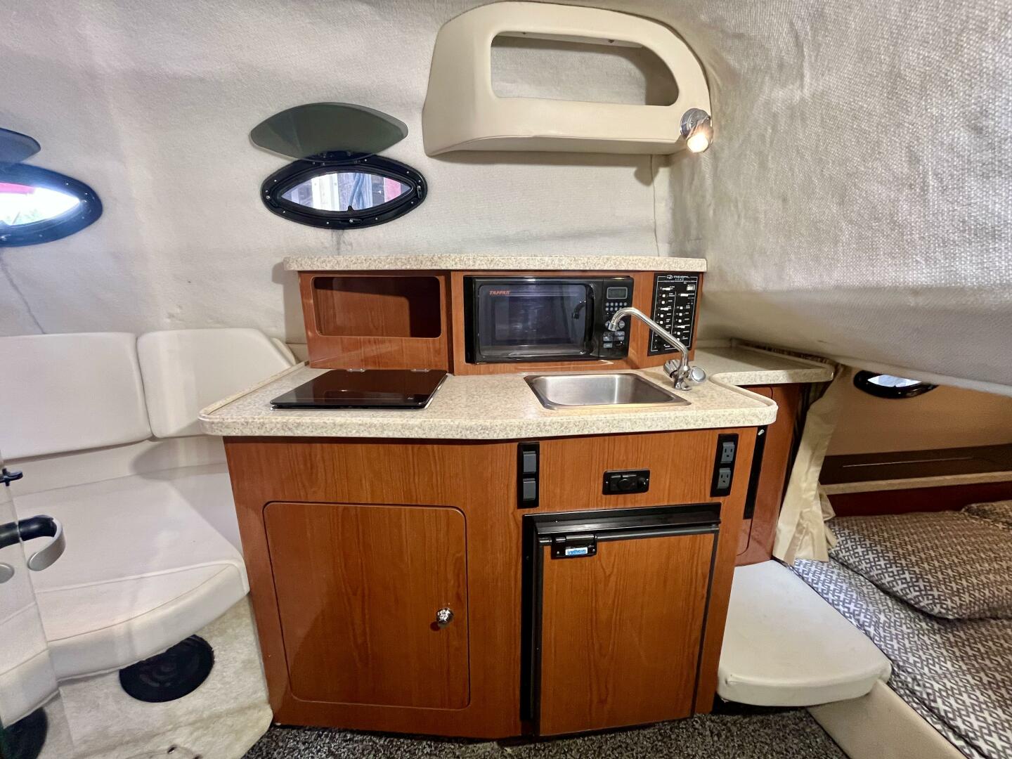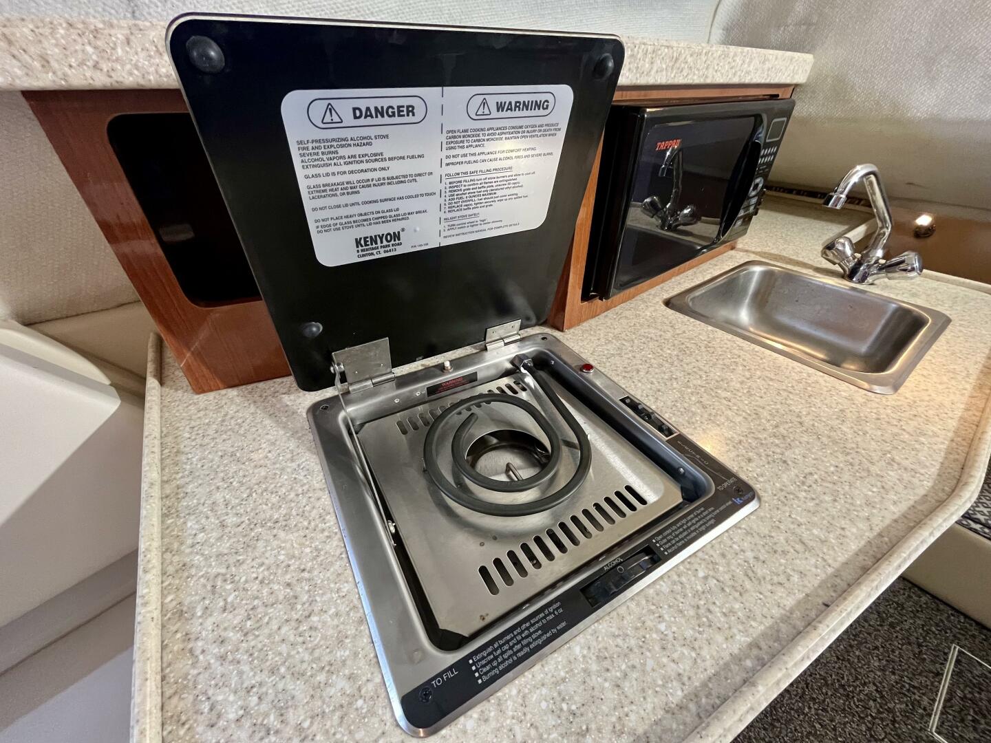 Below deck, the cabin provides comfortable overnight accommodations for four people. It includes a forward V-berth that converts into a dinette, as well as an aft mid-cabin berth. The galley is compact but functional, featuring a single-burner stove, microwave, refrigerator, and sink. The enclosed head comes with a marine toilet, sink, and shower.