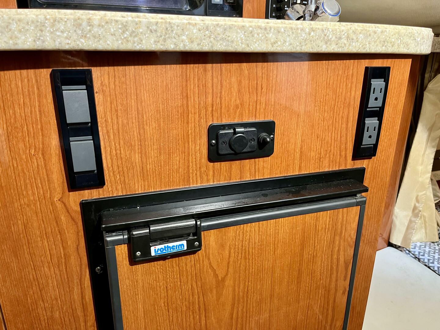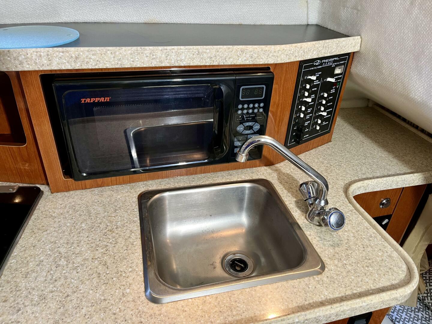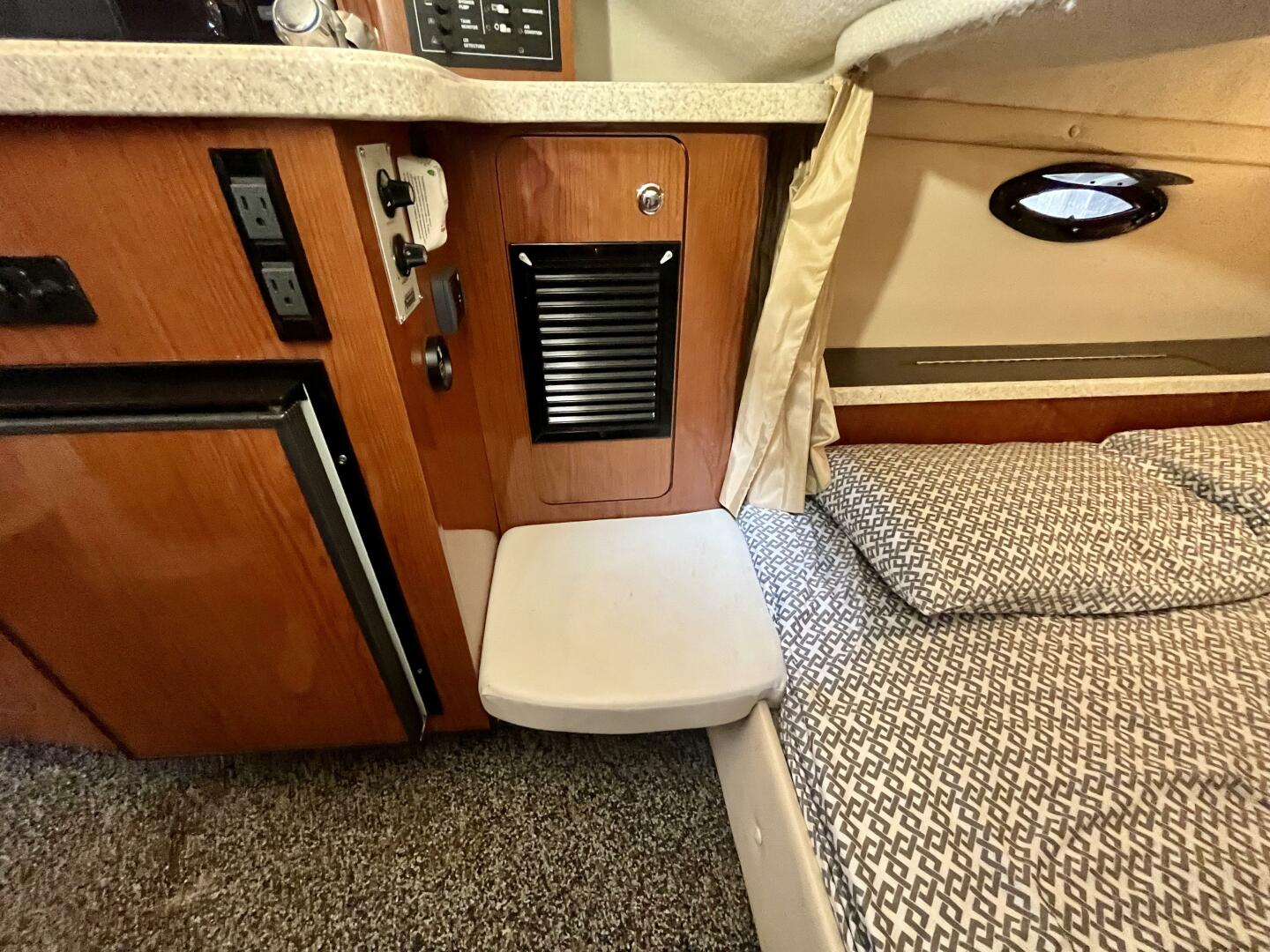 Below deck, the cabin provides comfortable overnight accommodations for four people. It includes a forward V-berth that converts into a dinette, as well as an aft mid-cabin berth. The galley is compact but functional, featuring a single-burner stove, microwave, refrigerator, and sink. The enclosed head comes with a marine toilet, sink, and shower.