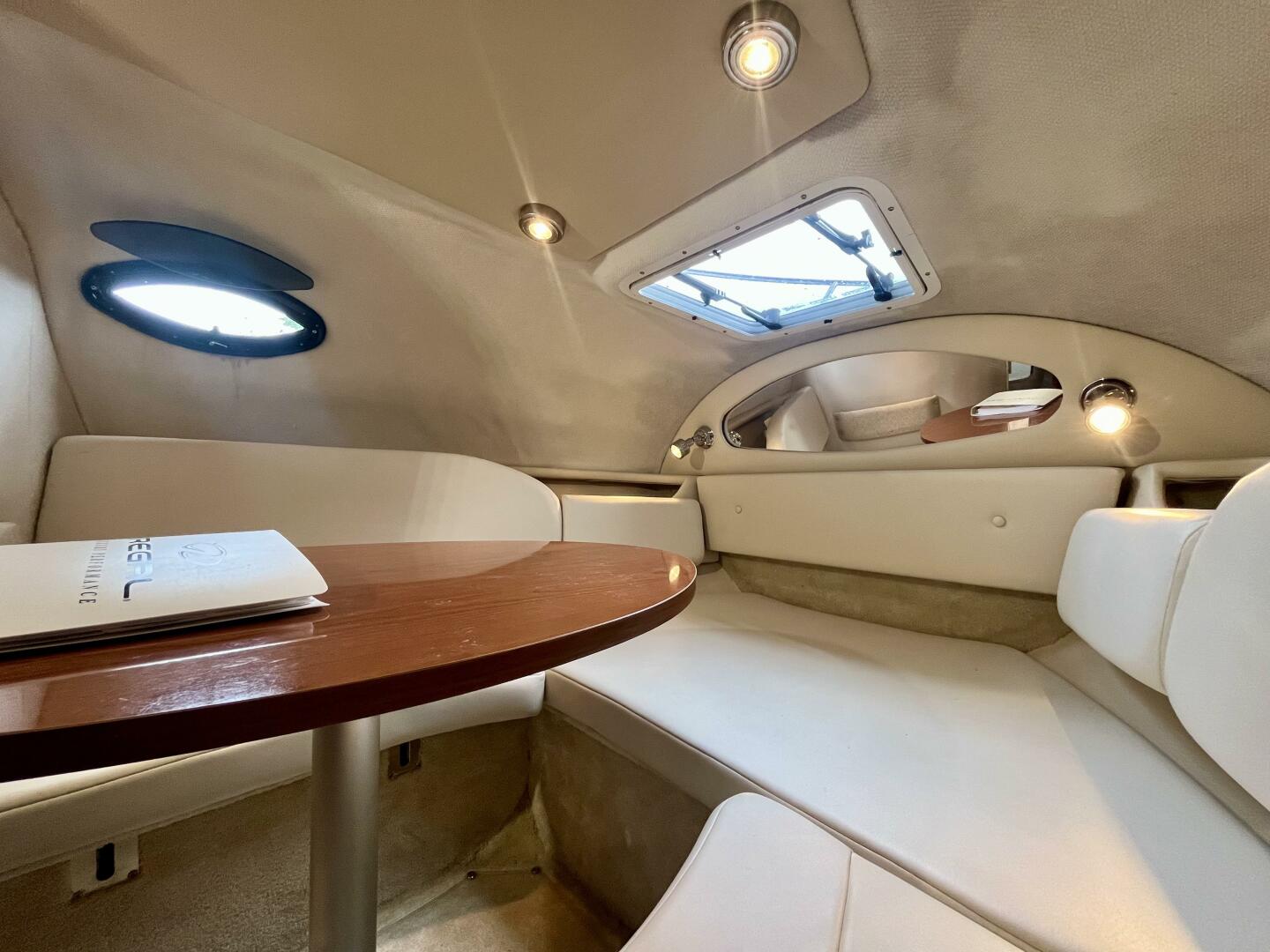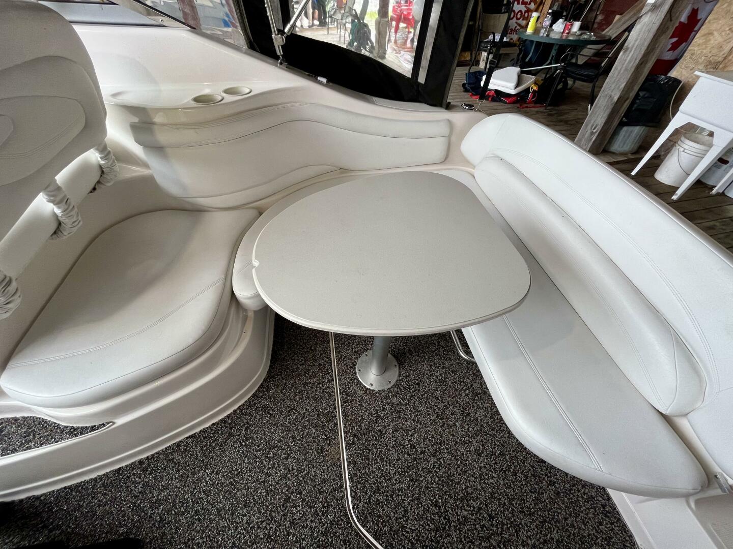 The cockpit layout features wraparound seating with a removable table, making it ideal for socializing. A wet bar with storage enhances onboard convenience.