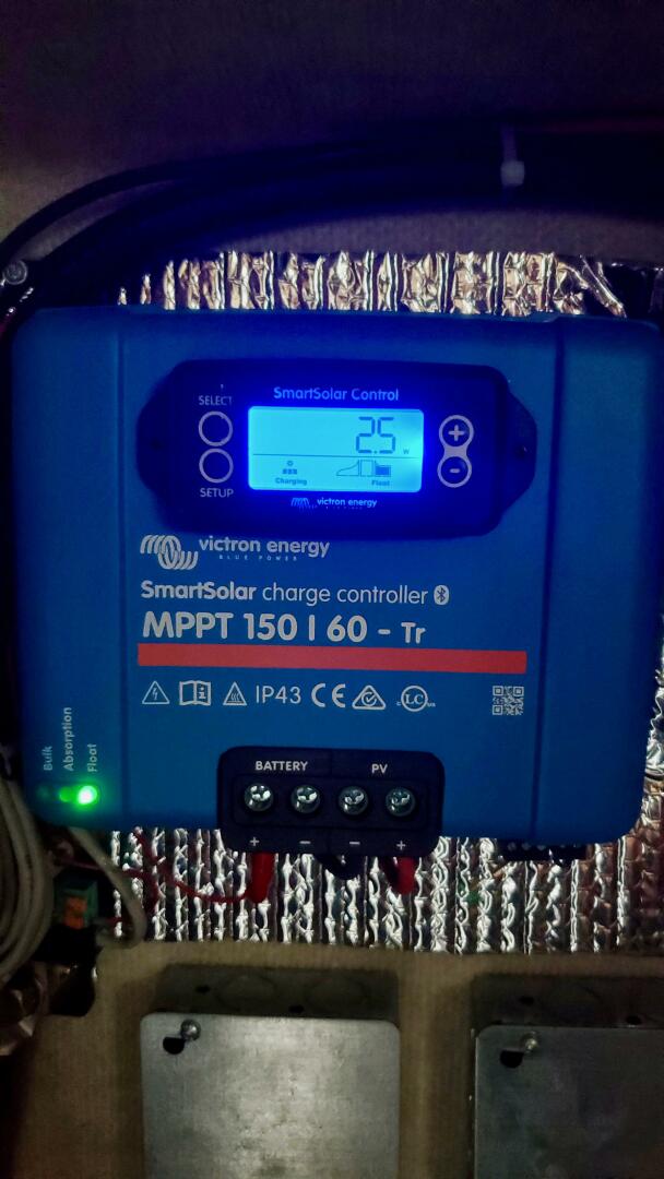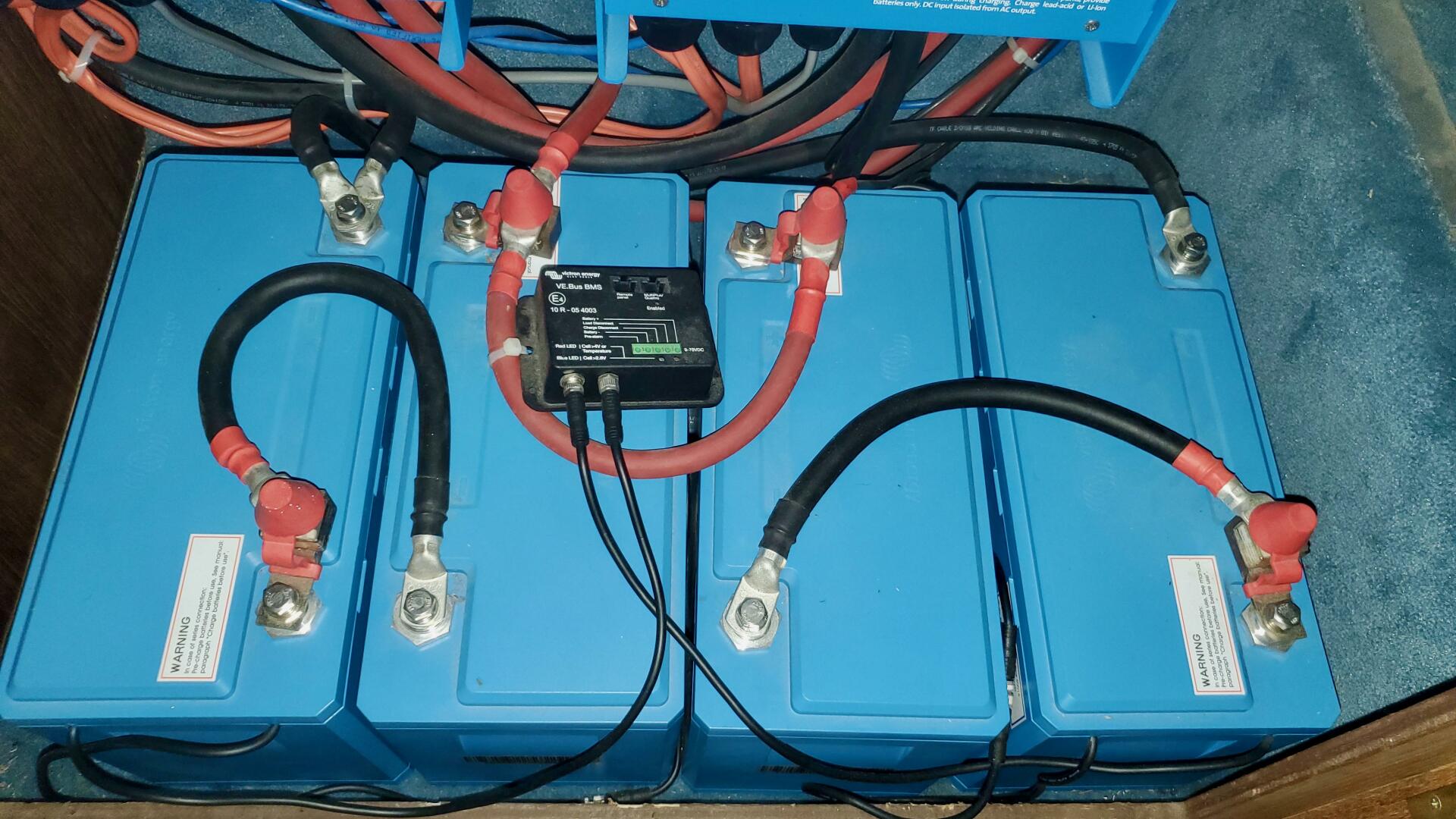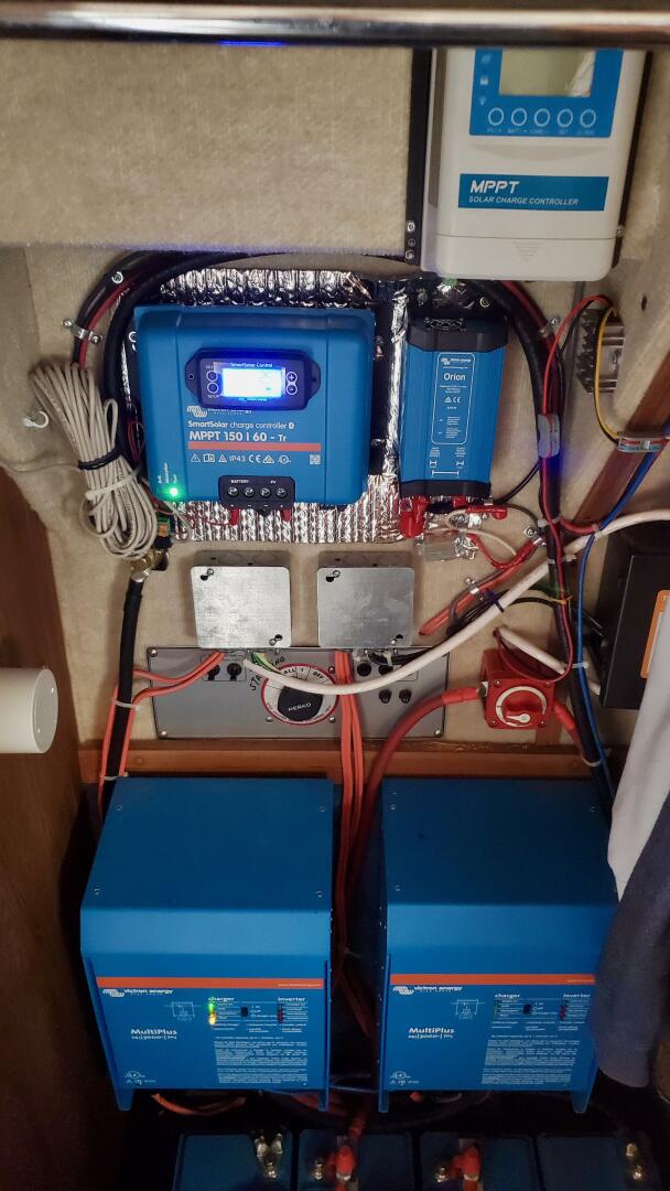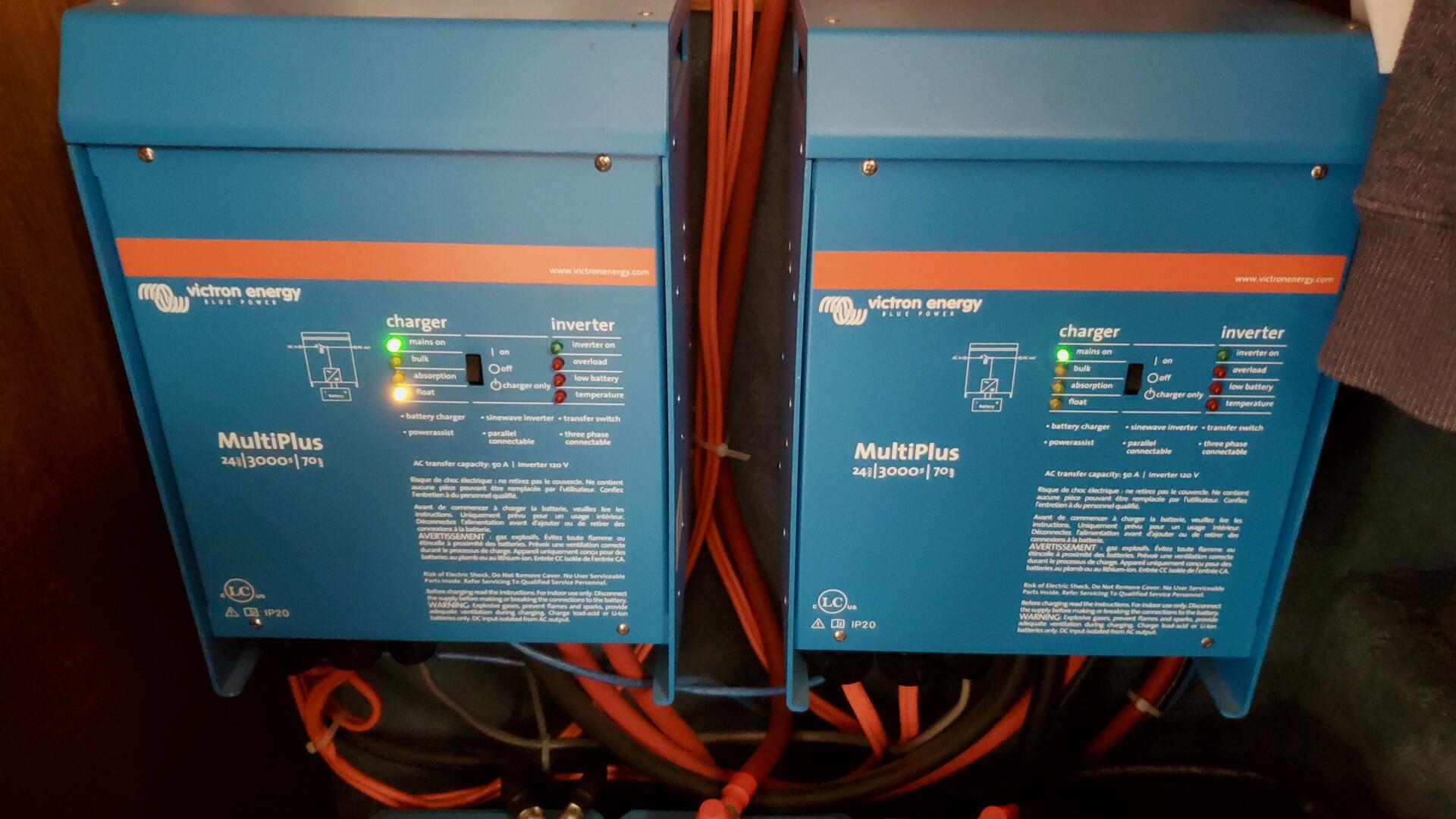 Electrical: 6 batteries (2 lead‑acid, 4 lithium), dual Victron Multiplus 3,000 W inverters/chargers, 1,095 W solar panels, inverter