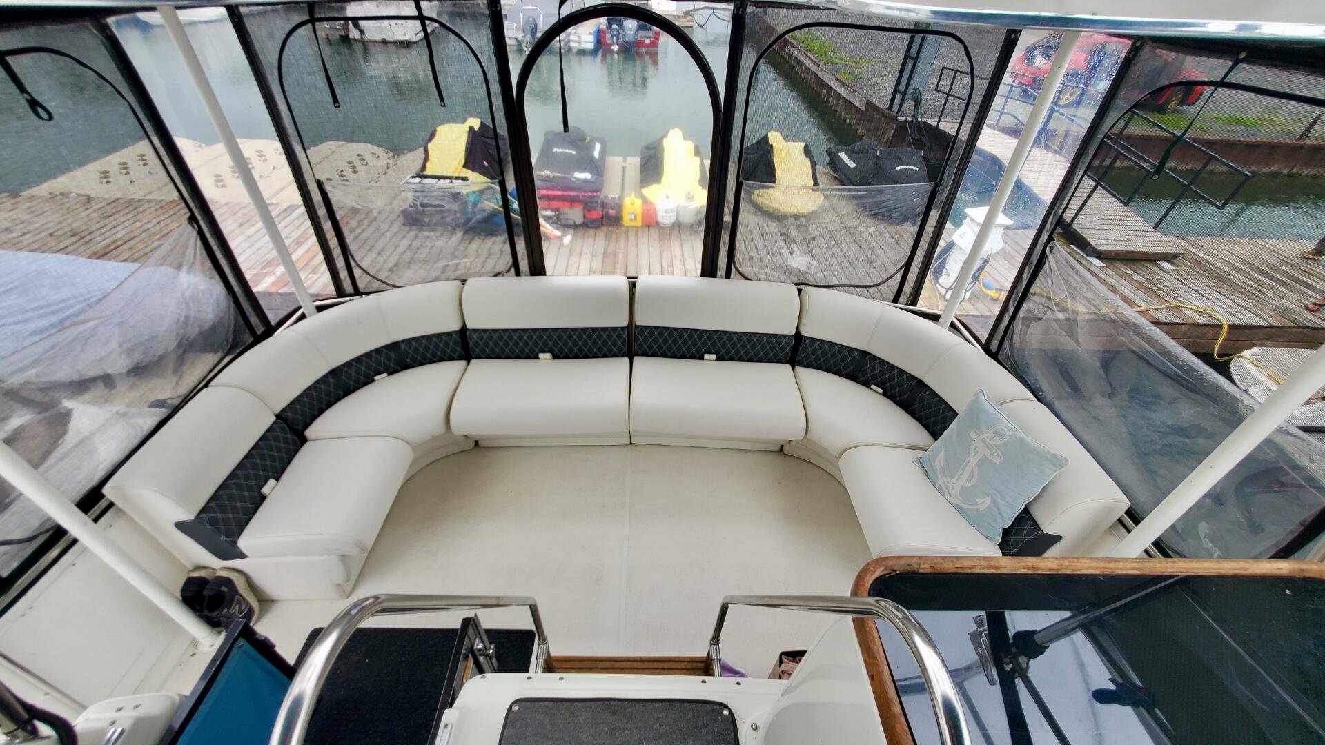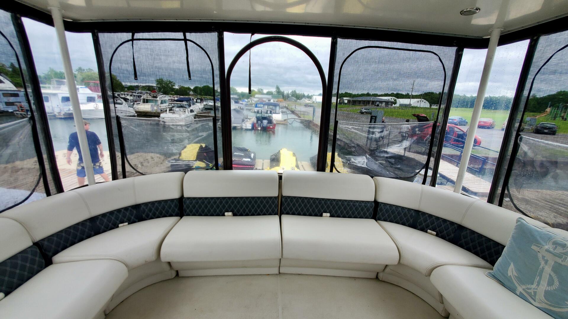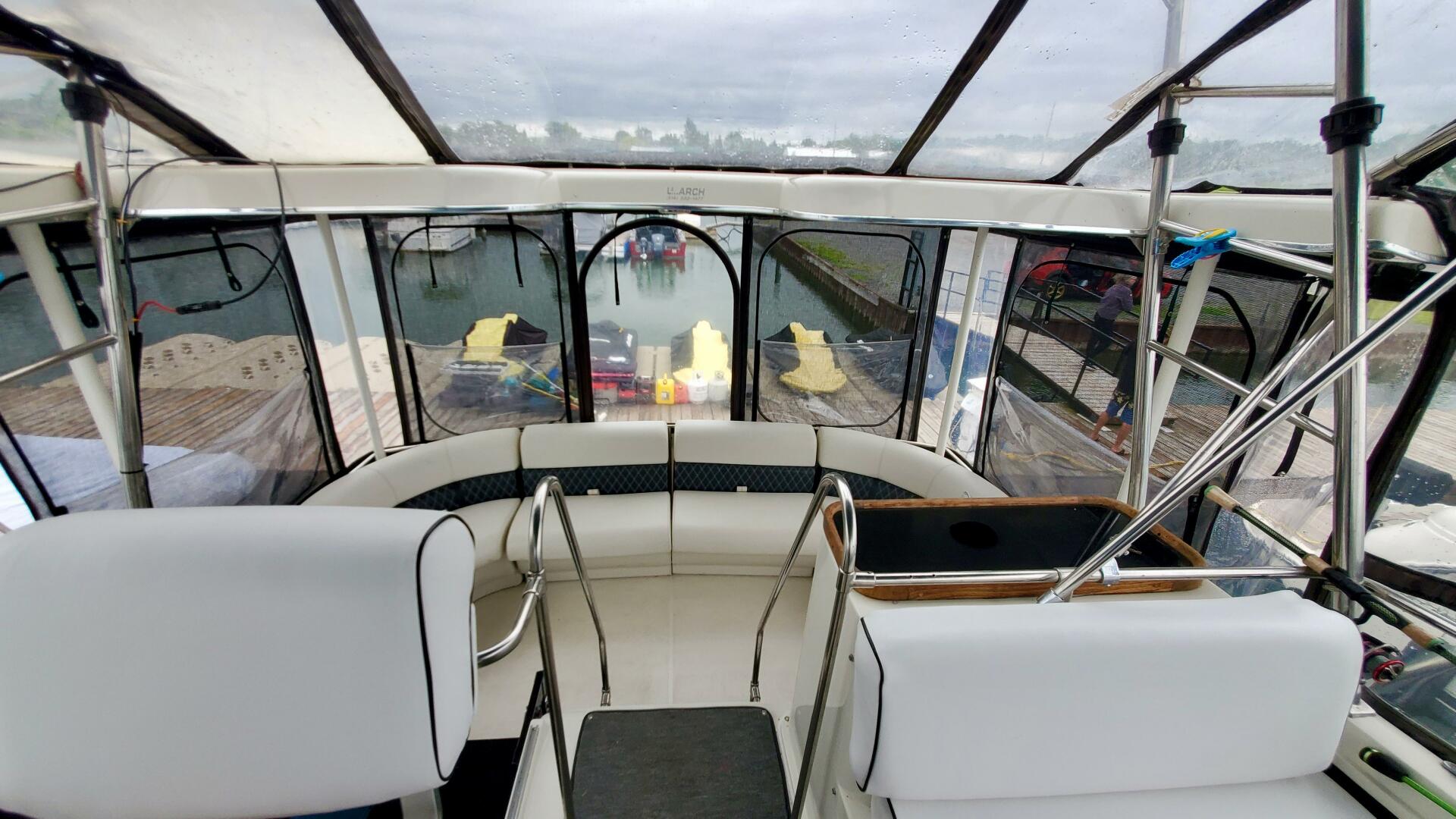 Deck: Bimini top with full enclosure, custom wrap‑around aft seating, swim platform, swim ladder