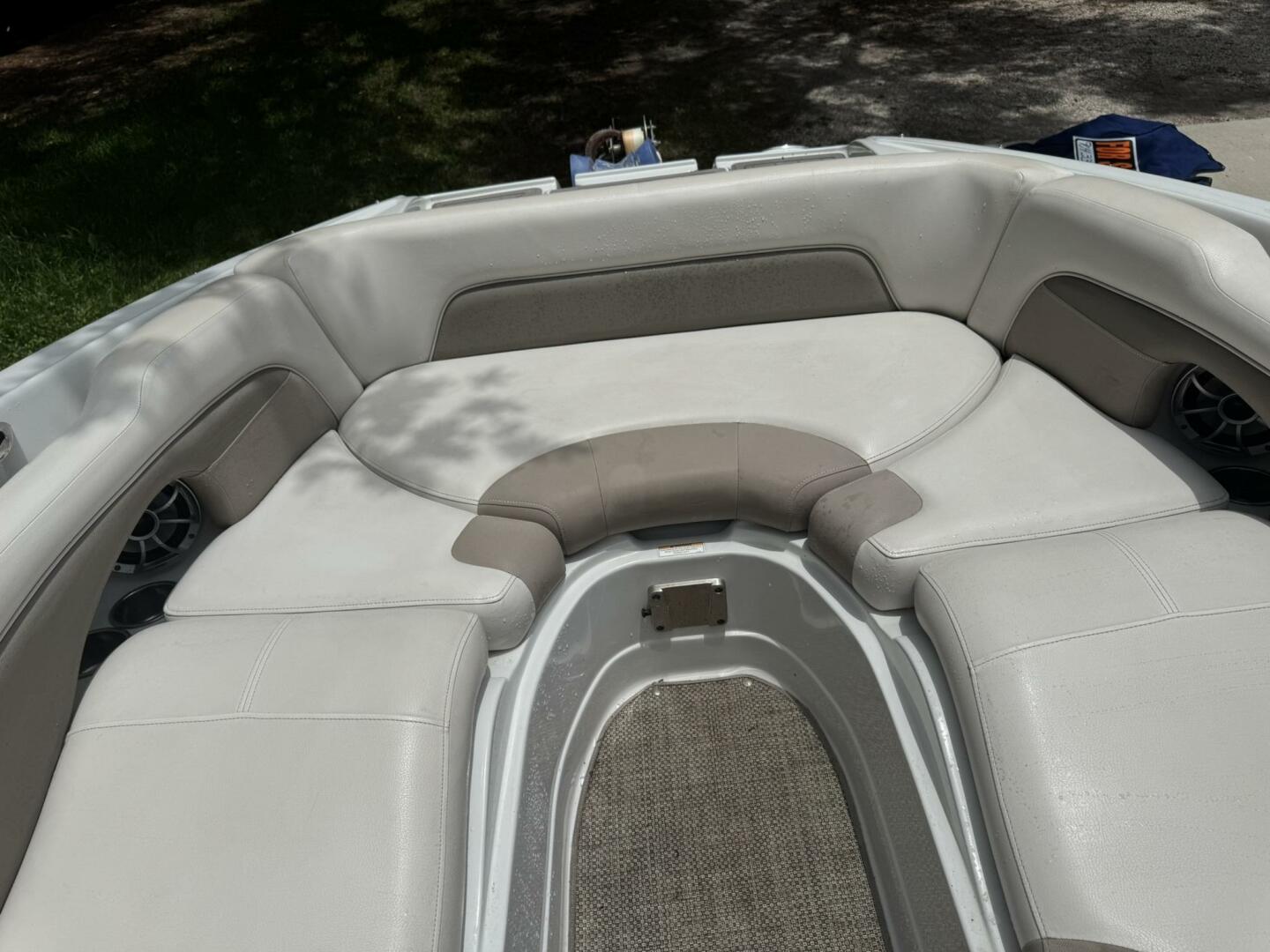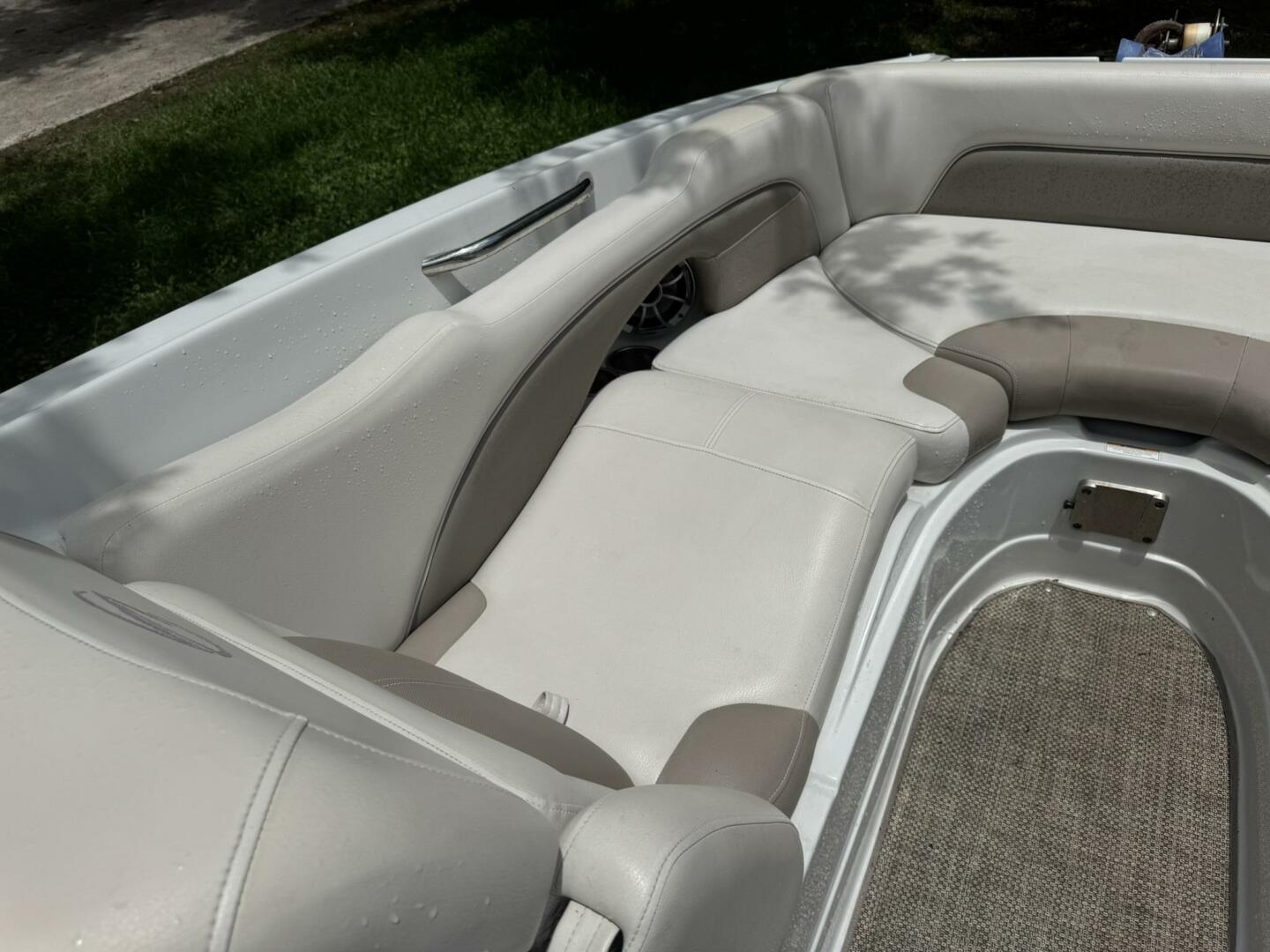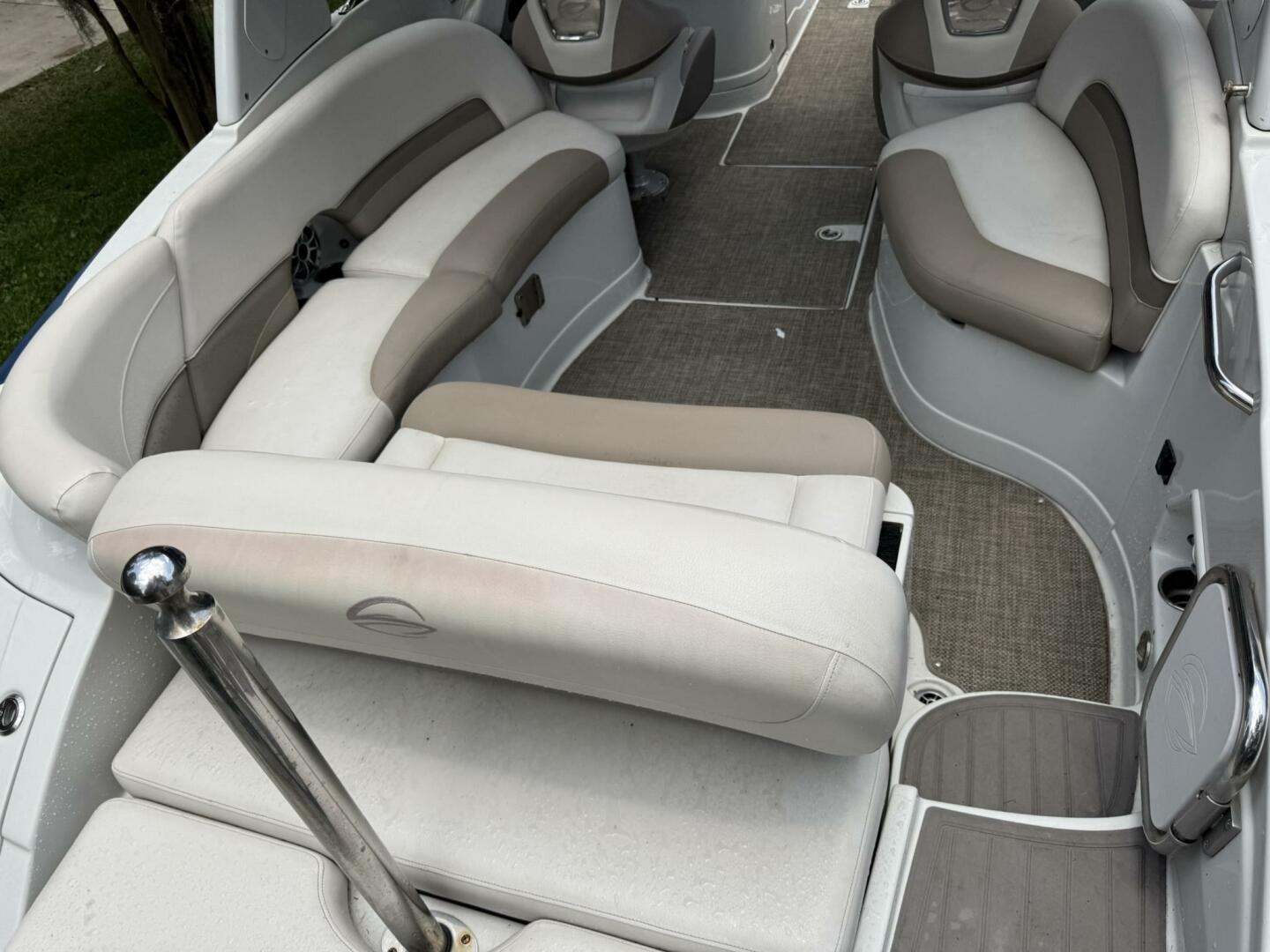 Sitting in the cockpit you’ll find a spacious J‑wrap lounge and an aft electric sunbed—ideal for family cruising or lake parties. The bow is a “hot‑tub” seating area with filler cushion, plus a walk‑thru windshield for easy access.