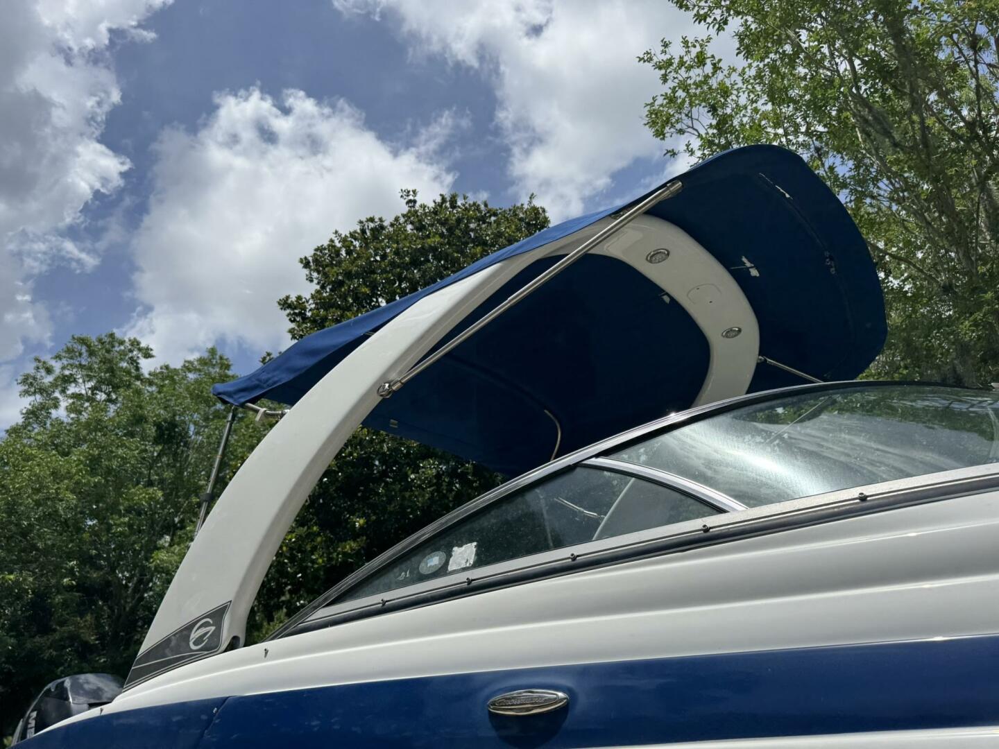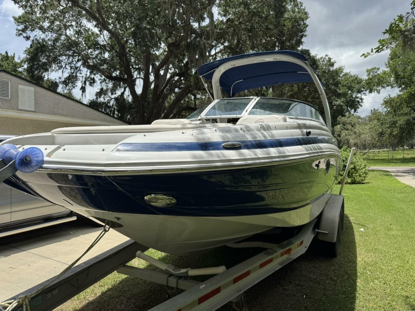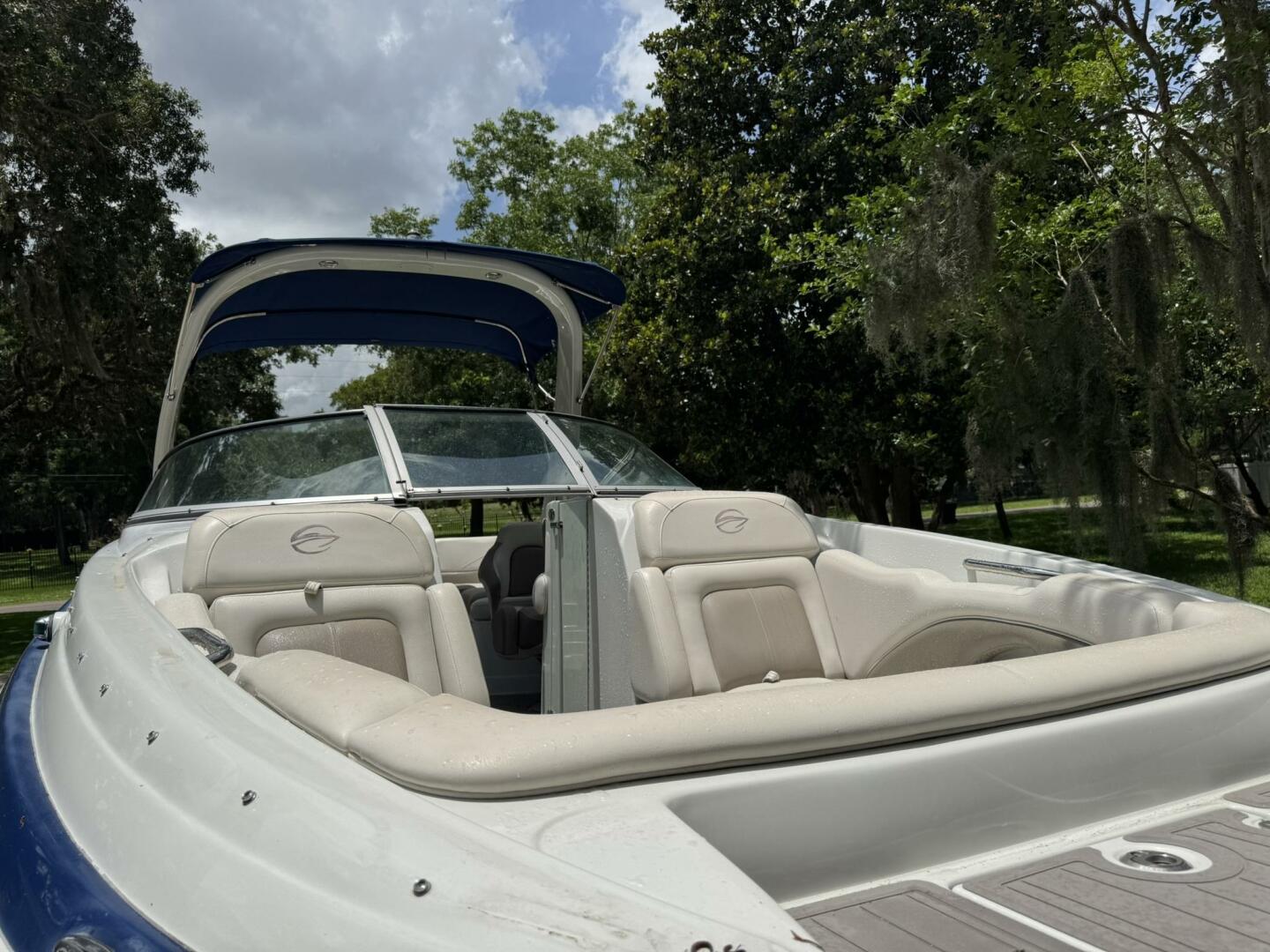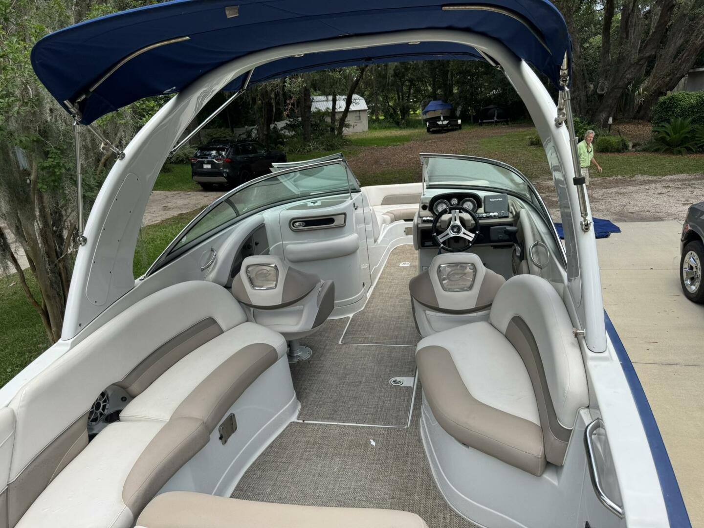 - Bimini top, snap-in carpet, stainless hardware, docking lights