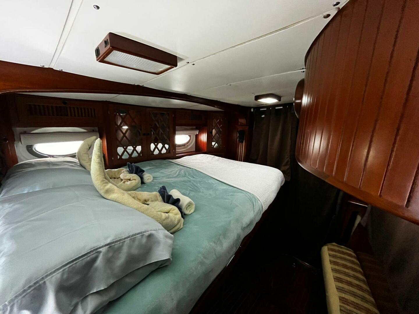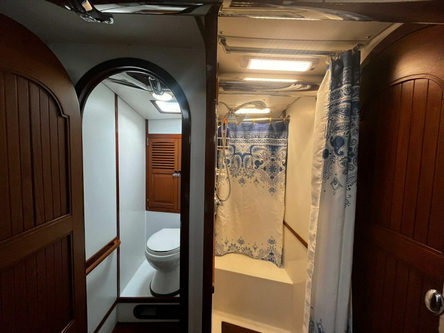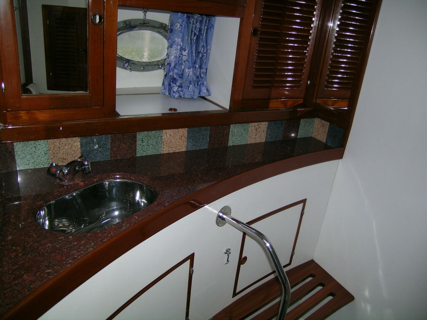 The master cabin is aft with a king size berth, (4) stainless steel opening ports on the transom with screen and shades,(1) side port light (port & starboard), (2) fans, (6) drawers under the berth, Sony TV, Alpine radio, and CD player, (1)double door hanging locker, ensuite head with granite counter & back splash, Jabsco toilet, shower, and small overhead hatch.