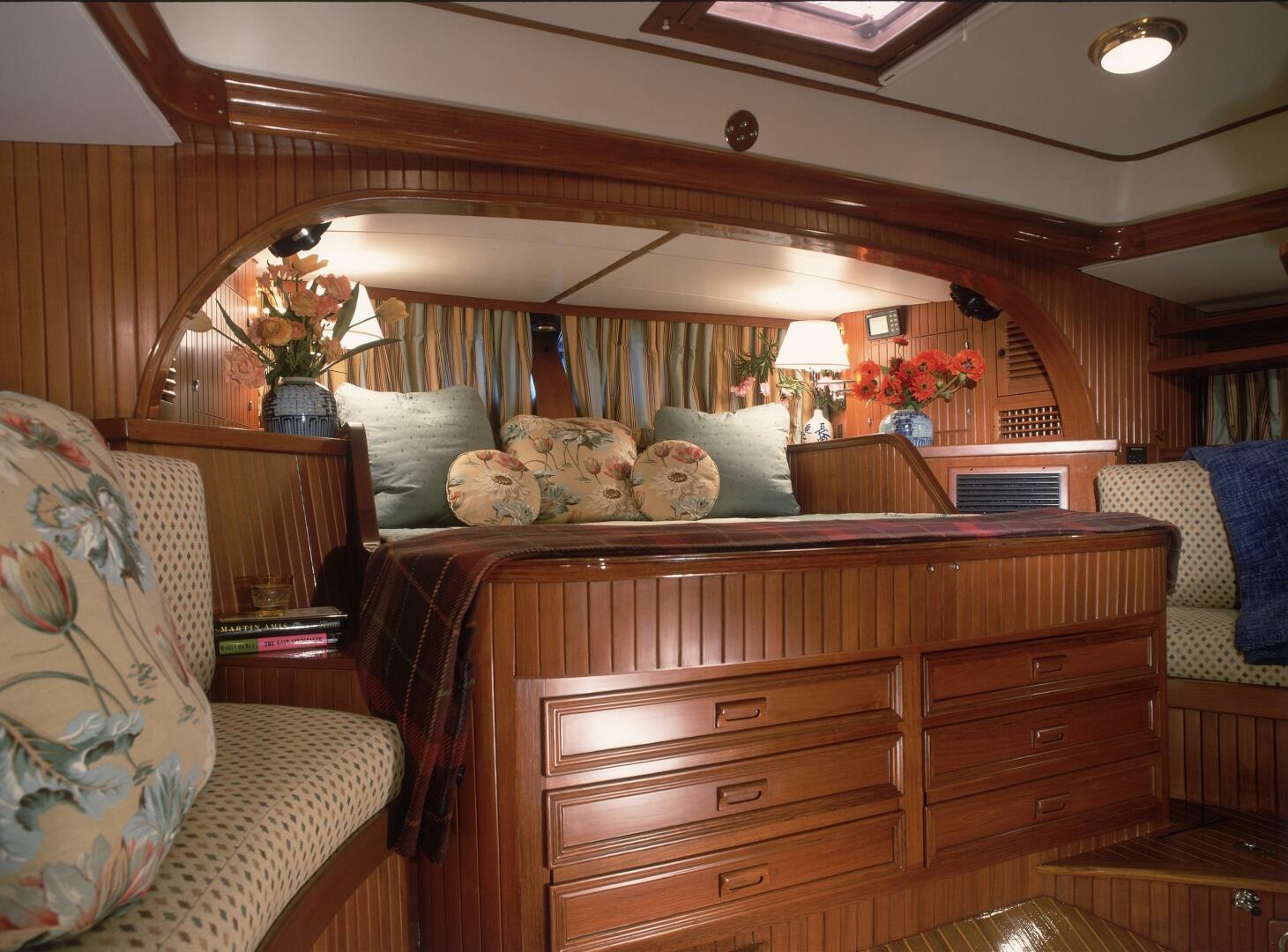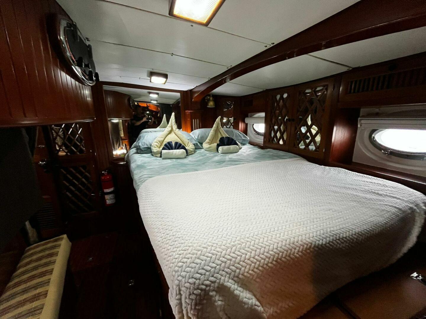 To port is the guest cabin with King berth, propane dryer beneath, electric washer beneath, overhead opening hatch, fan, and reading light.