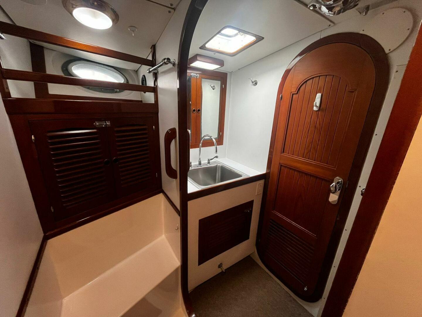 The forward head is next with extra-large sink and an overhead opening hatch to starboard. To port is the toilet with overhead opening hatch behind a closing door. Shower is separate.