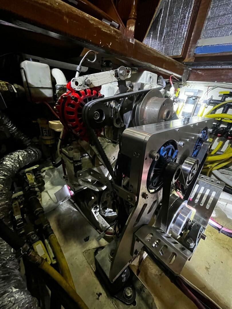 Final commissioning of the new CAD designed engine power bracket containing 2 x E series Mechman 400-amp high output alternators. This "one off “specific unit allows engine power alone to produce a DC output to supply the inverter and systems on board.