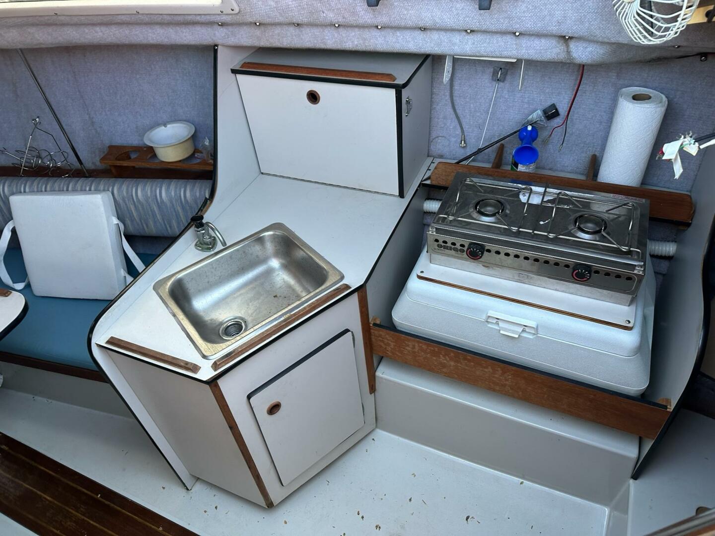 Sleeps 4, Enclosed Head, with marine head and holding tank, Galley with manual water portable cooler, 2 burner Origo 3000 stove, cabin light, fan