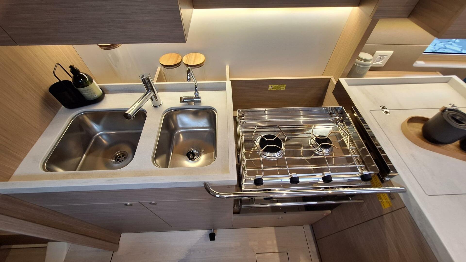 In its closed configuration, the cockpit provides a tranquil sailing experience, especially suitable for family outings. The aft seating arrangements include practical, built-in storage lockers. When at anchor, this space easily transforms into an outdoor galley with a plancha, adding to comfort and conviviality. Conversely, the open version of the cockpit offers direct, unobstructed access to the sea, perfect for swimming, snorkeling, or other water activities.