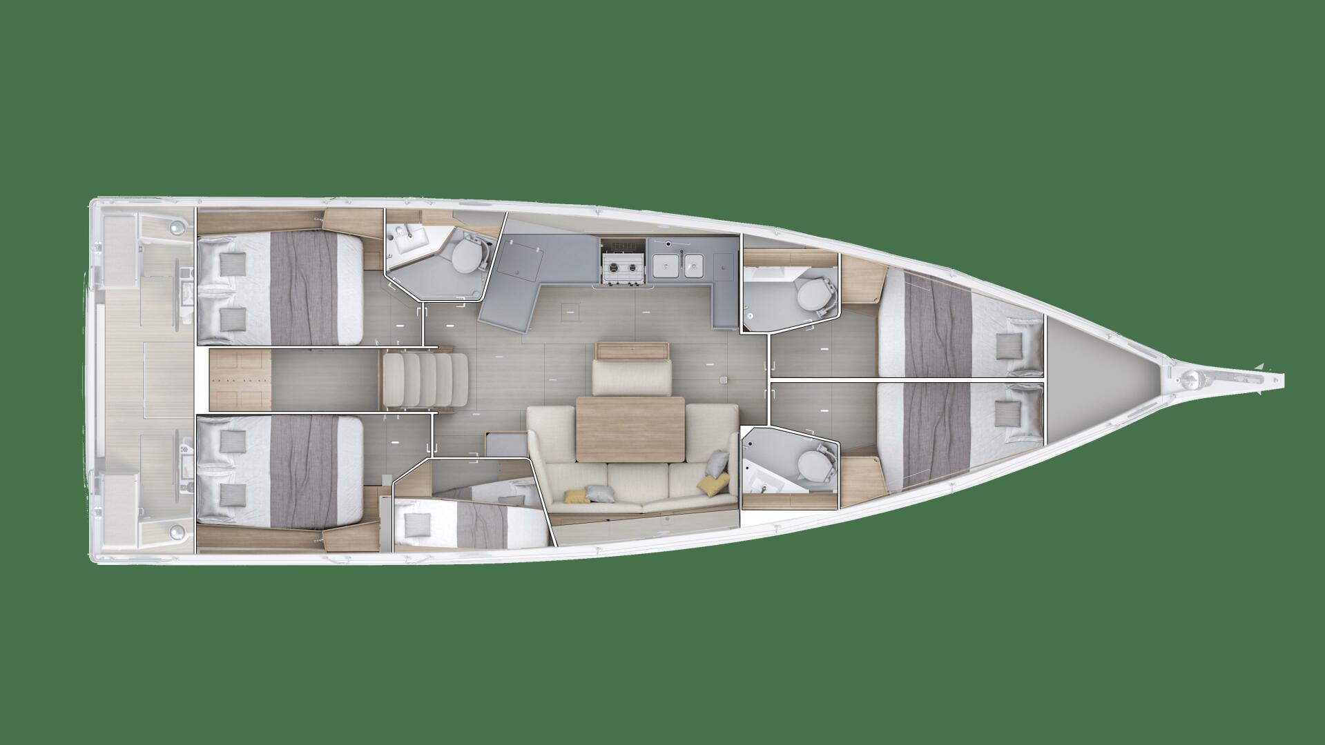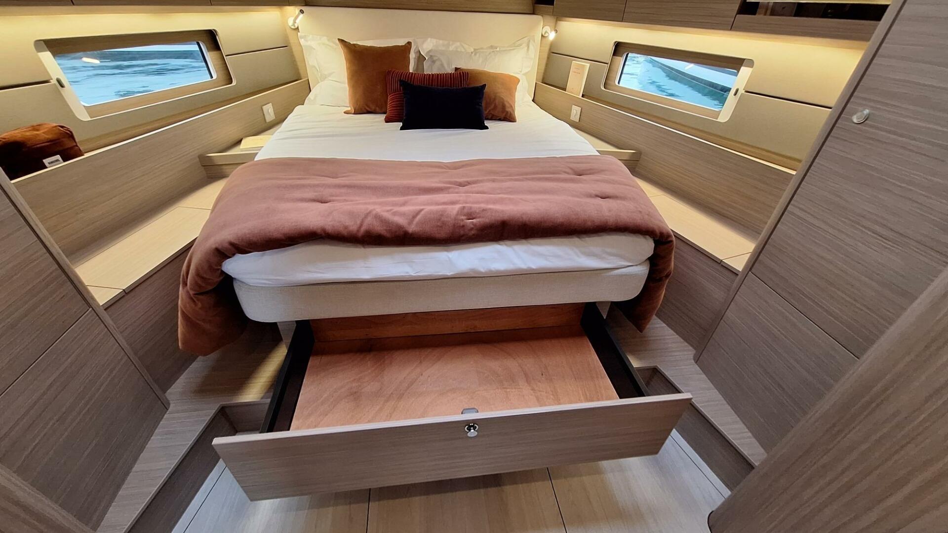 For enhanced refinement, the Elegance Pack includes a solid Alpi wood table, an upholstered bed in the main cabin, smoked glass mirrors, and pleated blinds, creating a warm and stylish atmosphere.