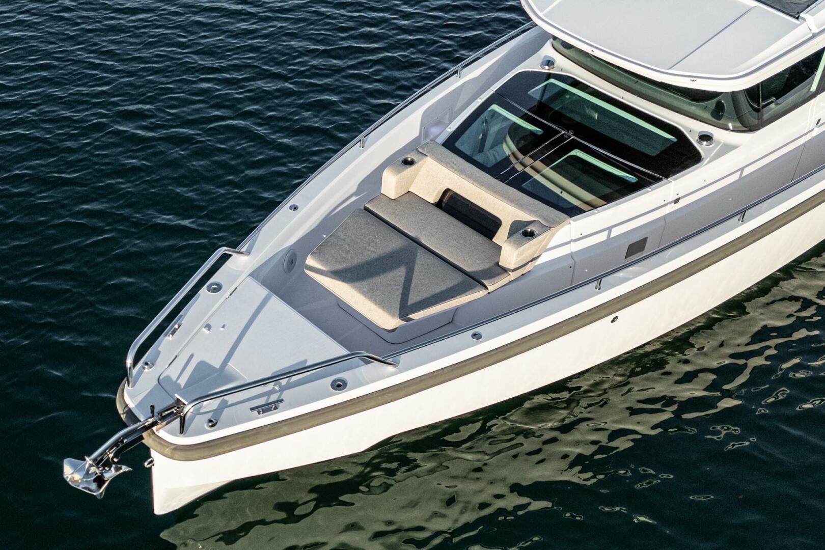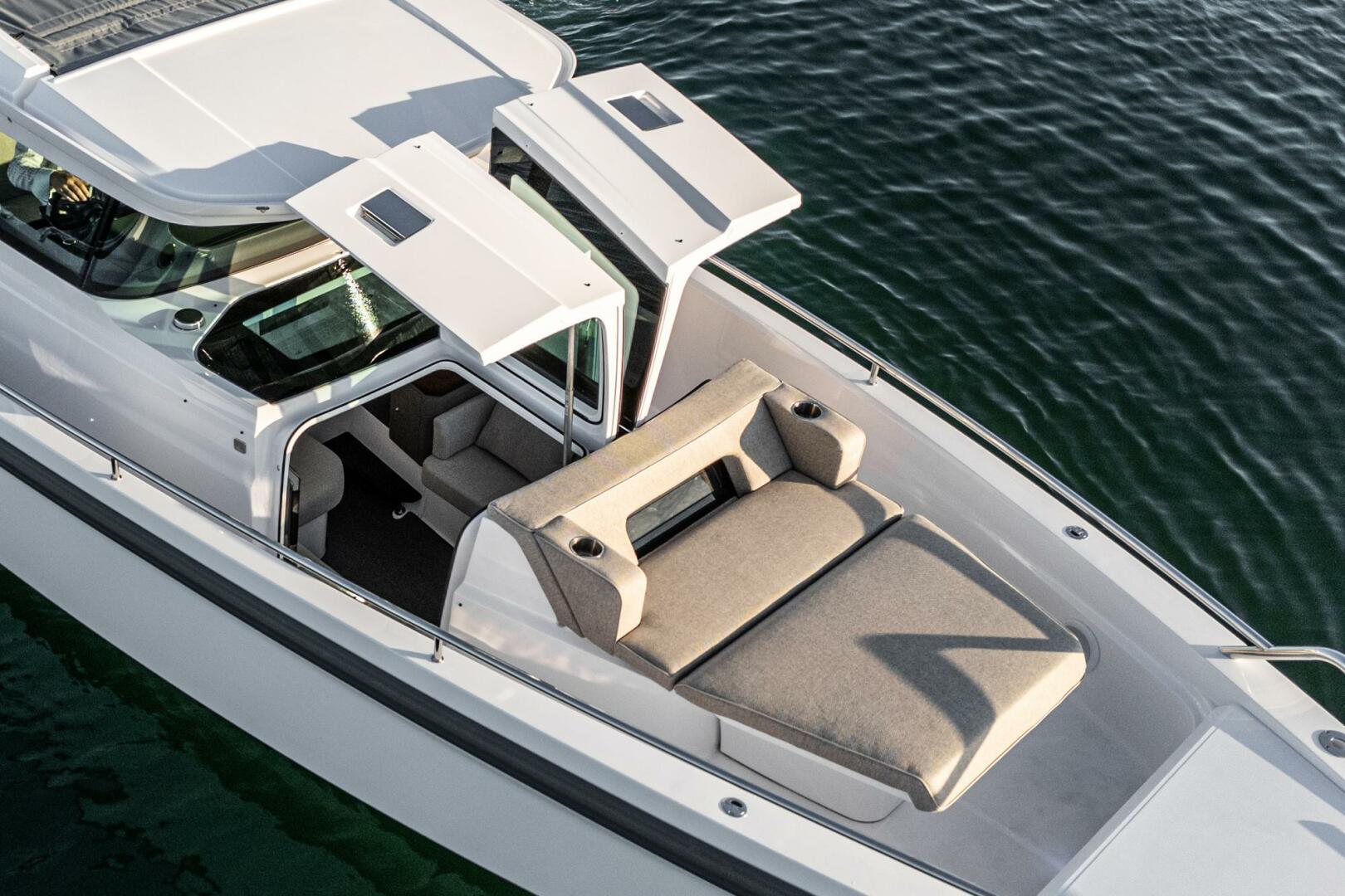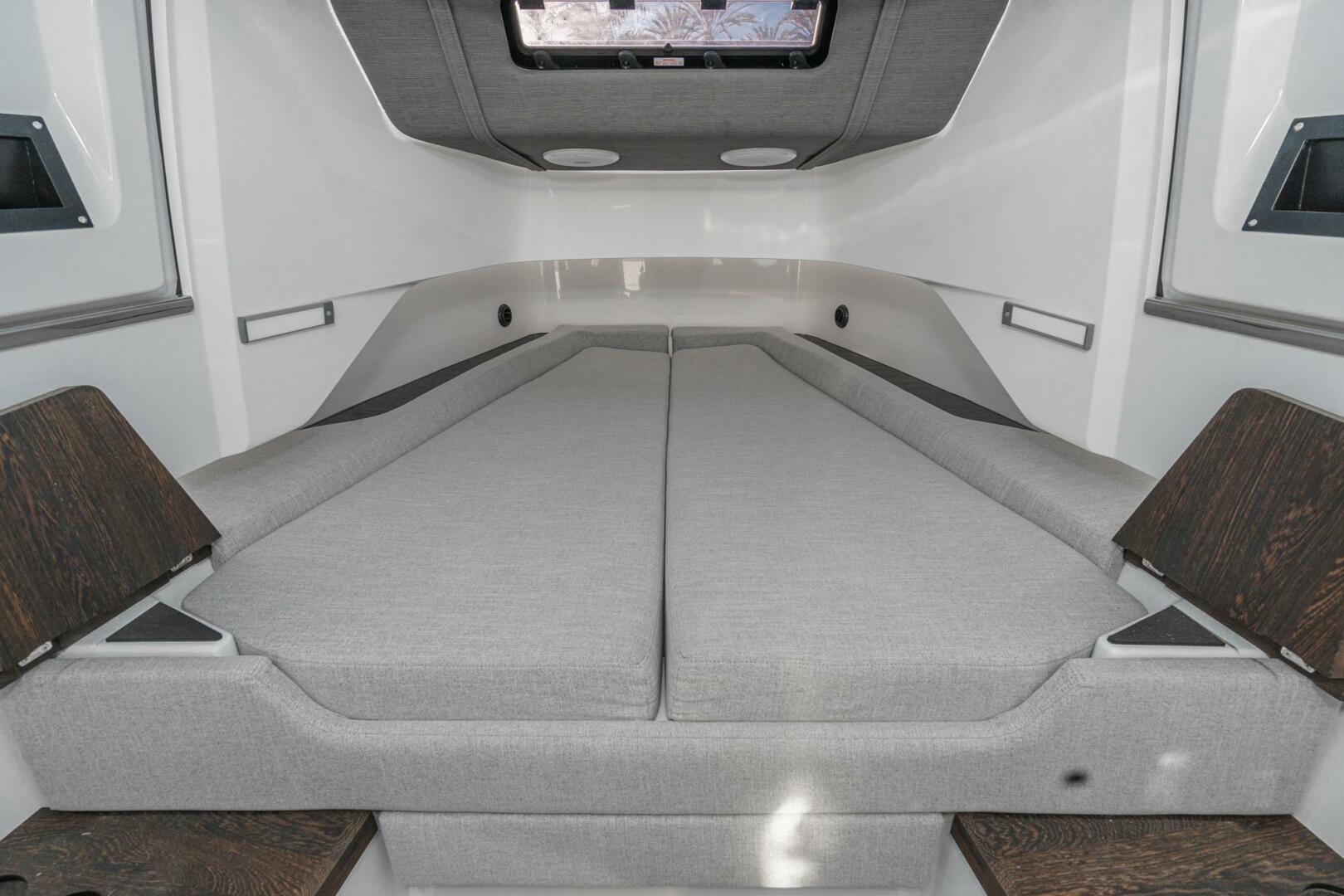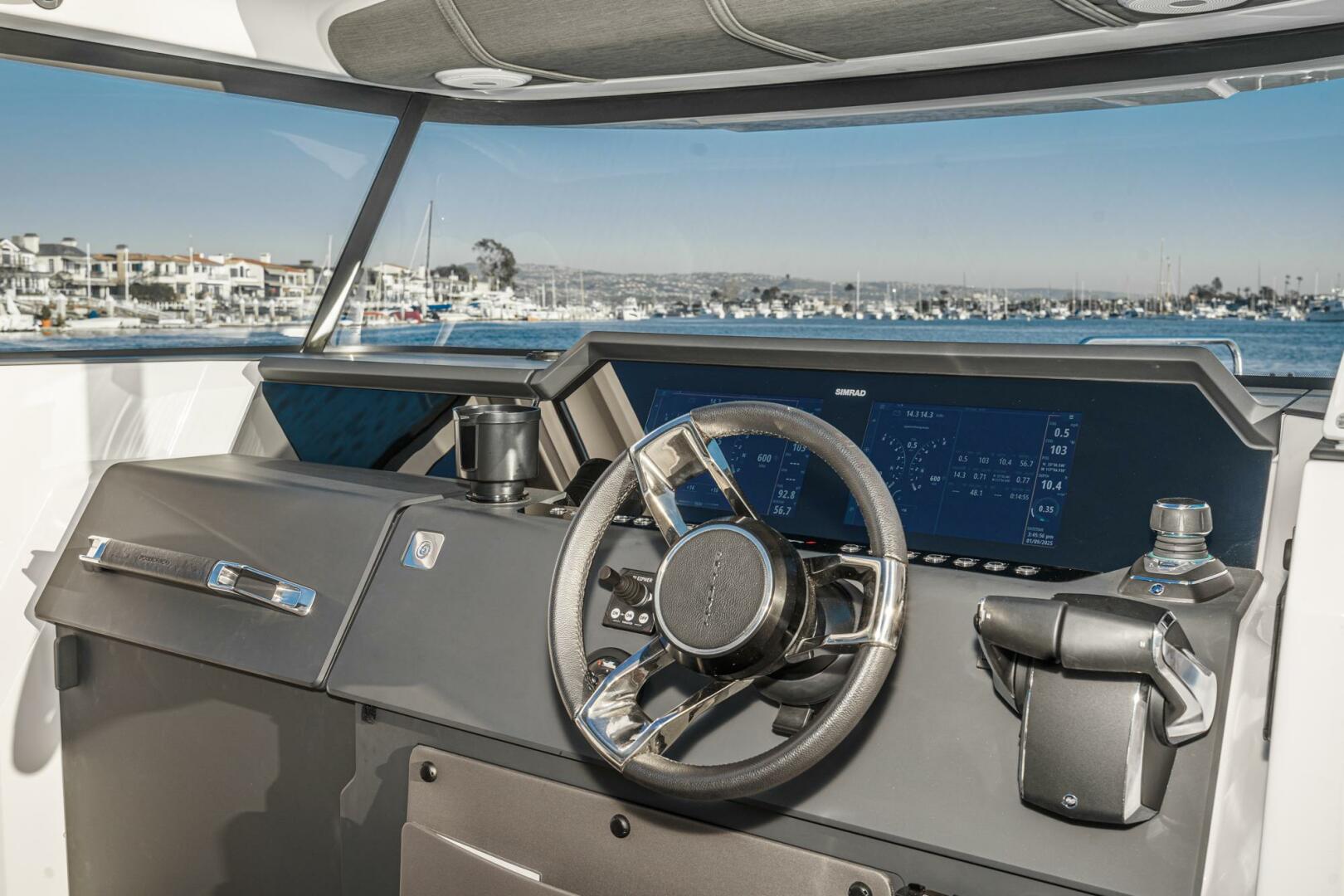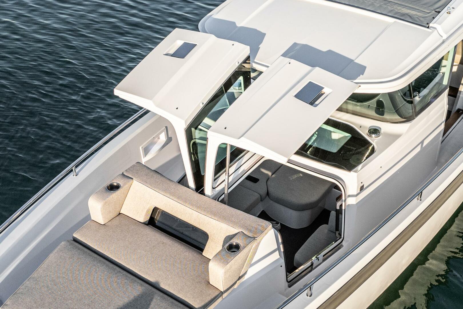 2023 37XC Cross Cabin with Mediterrana interior, removable solar panels, Mercruiser joystick with position hold, aft wet bar, and roof rack. Transferrable engine warranties and flushed after every use.
