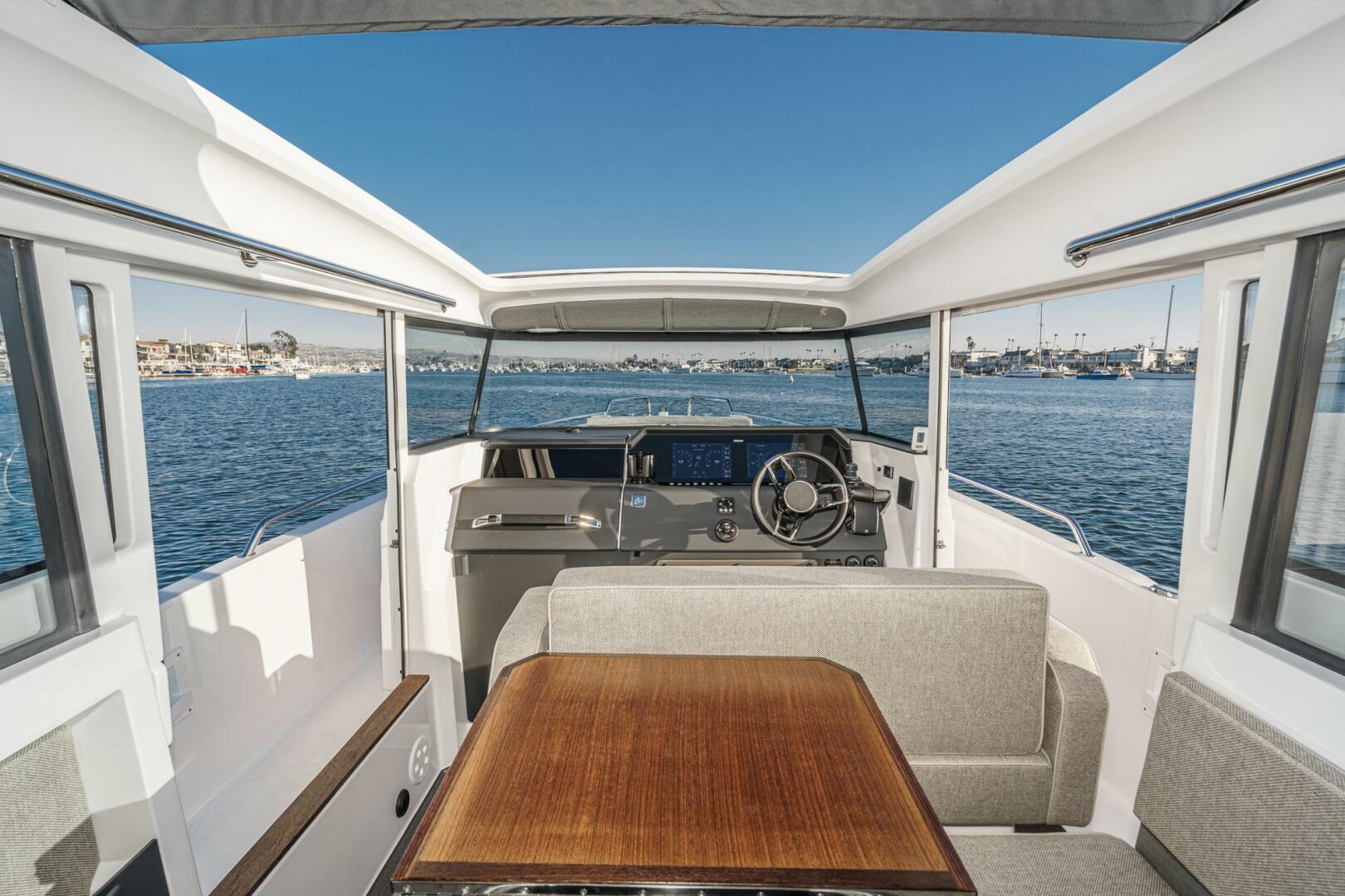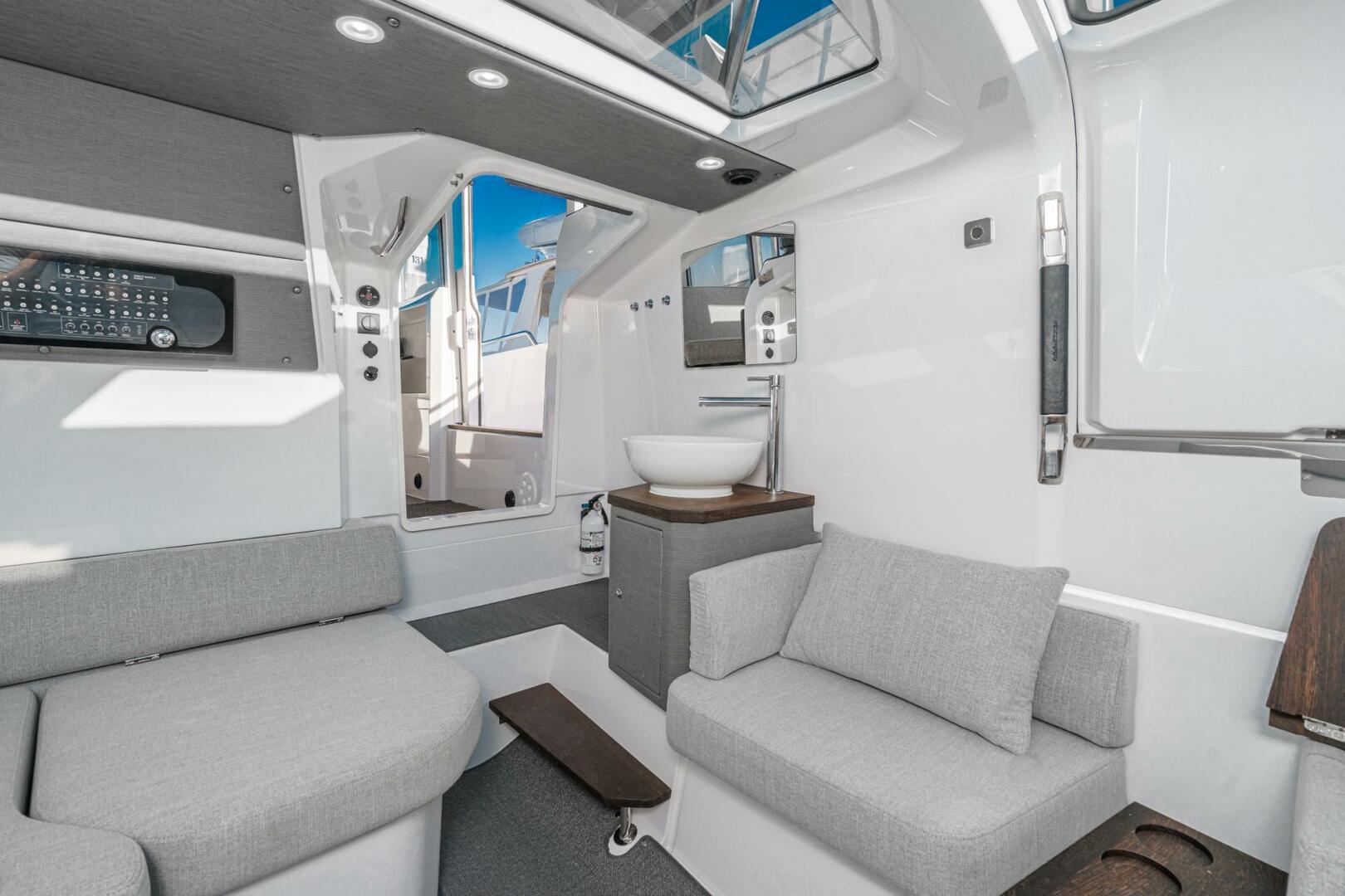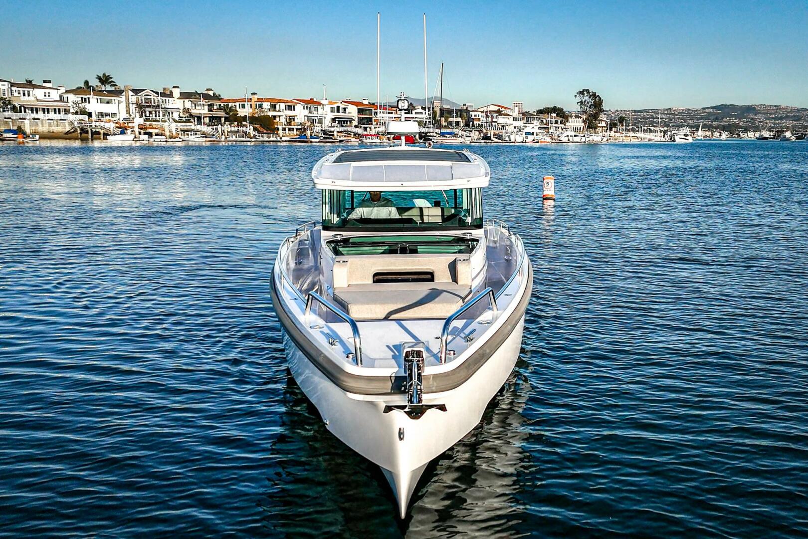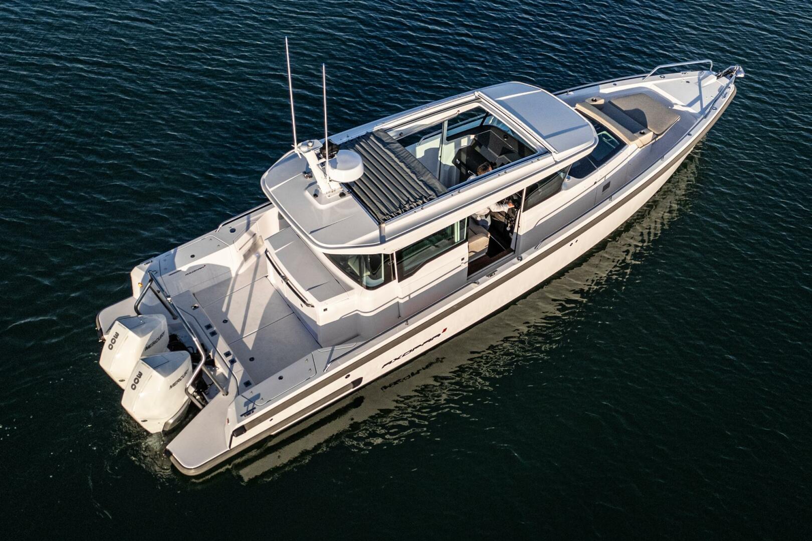 2023 37XC Cross Cabin with Mediterrana interior, removable solar panels, Mercruiser joystick with position hold, aft wet bar, and roof rack. Transferrable engine warranties and flushed after every use.