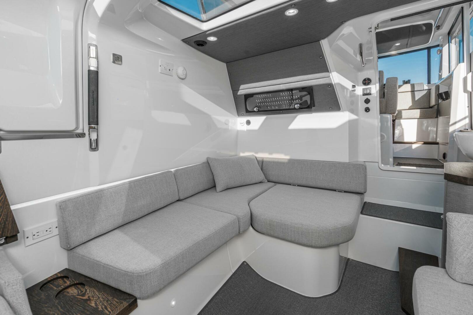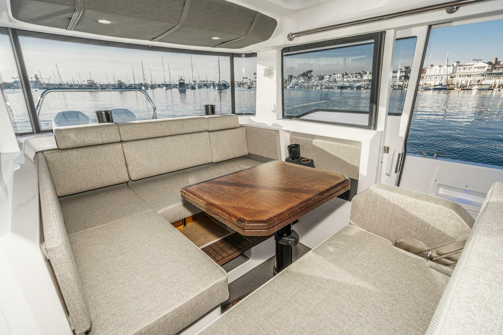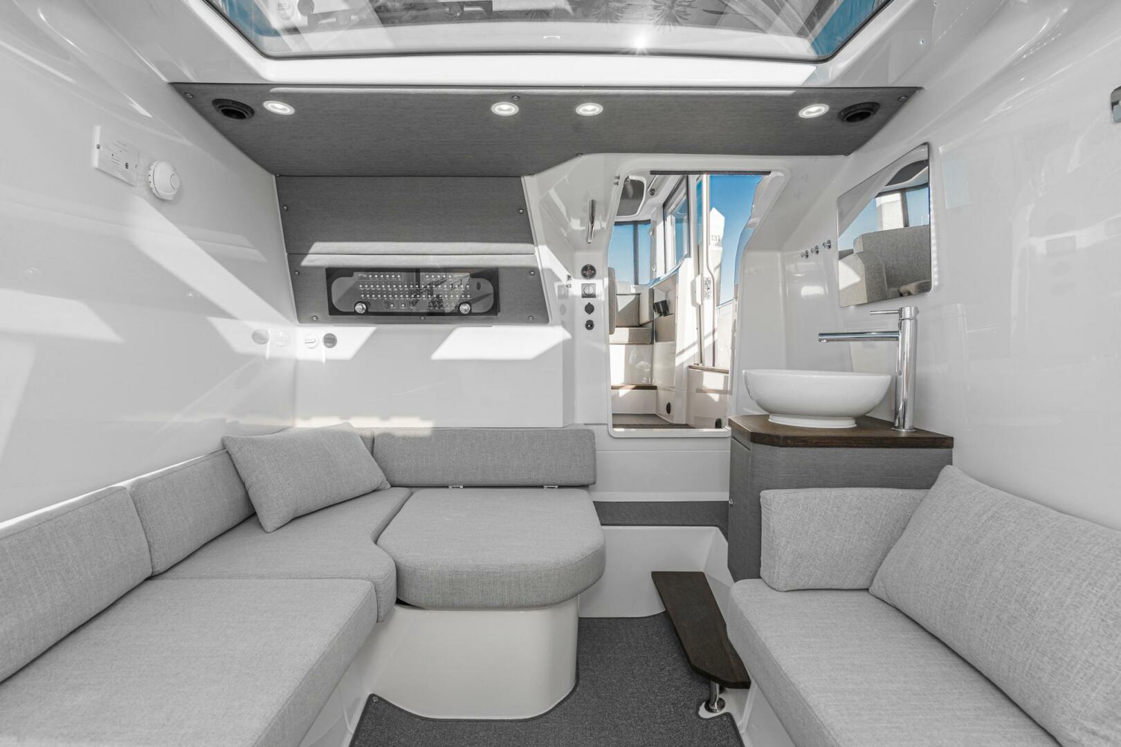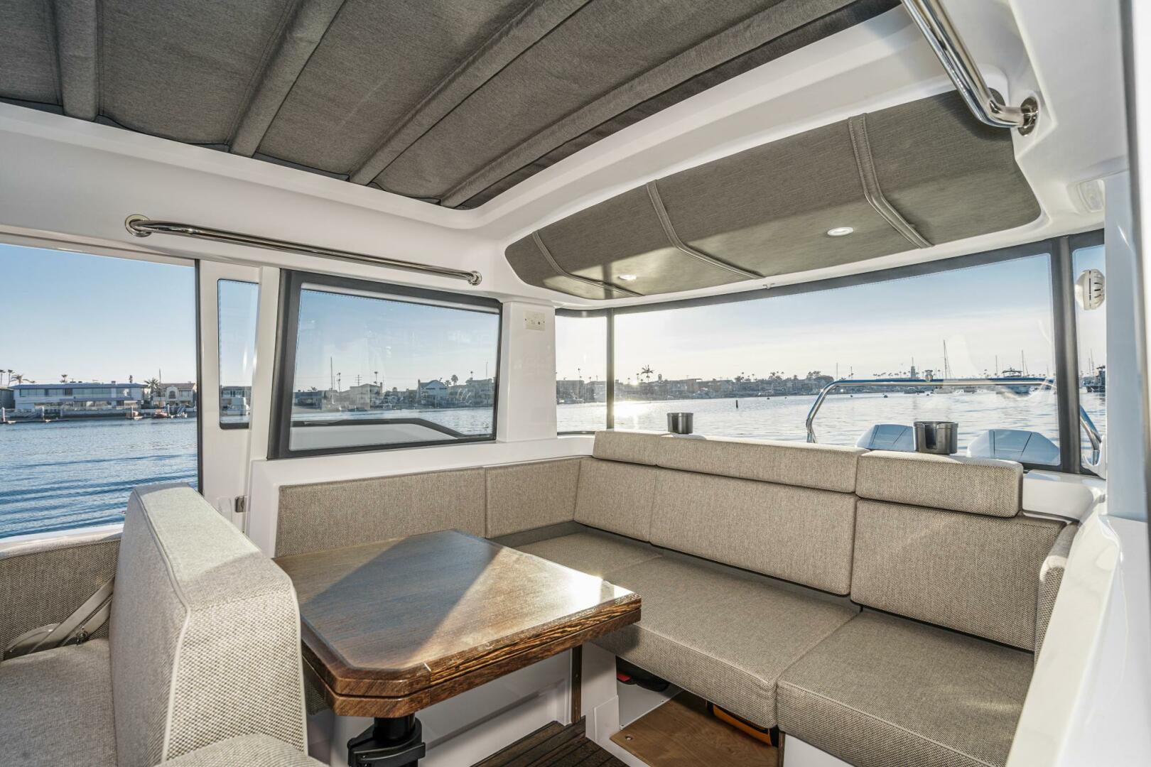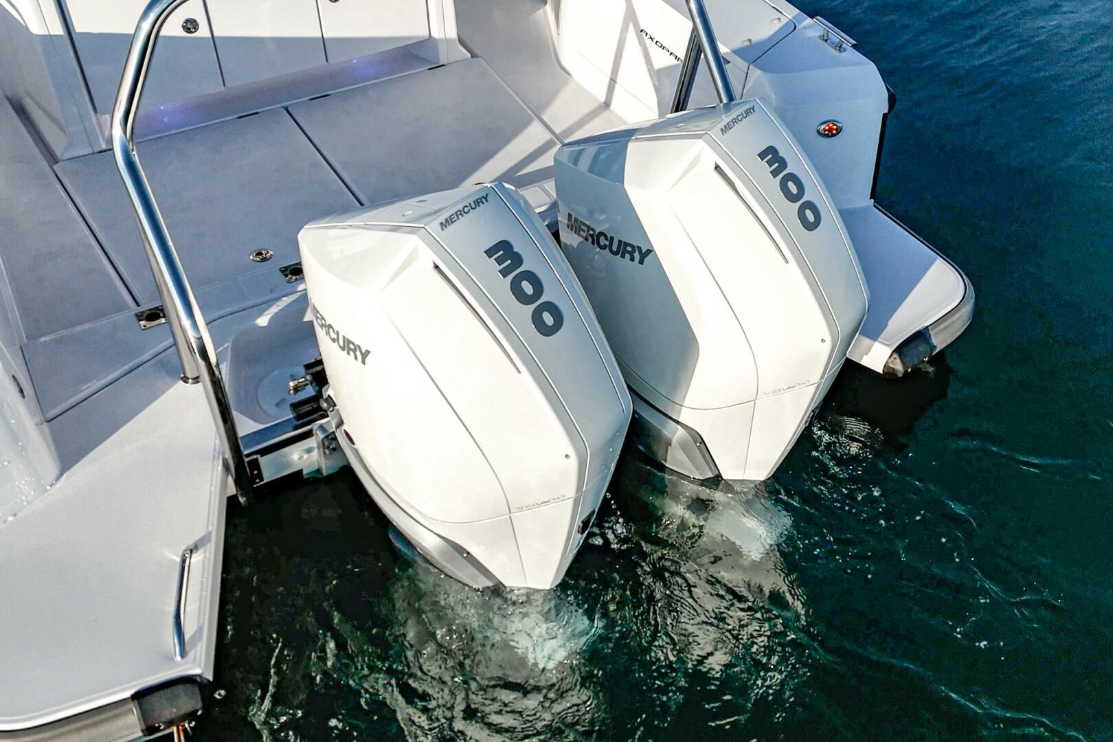 2023 37XC Cross Cabin with Mediterrana interior, removable solar panels, Mercruiser joystick with position hold, aft wet bar, and roof rack. Transferrable engine warranties and flushed after every use.