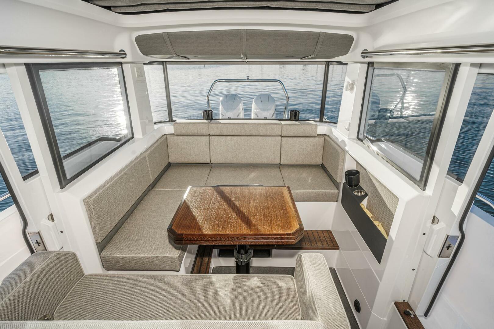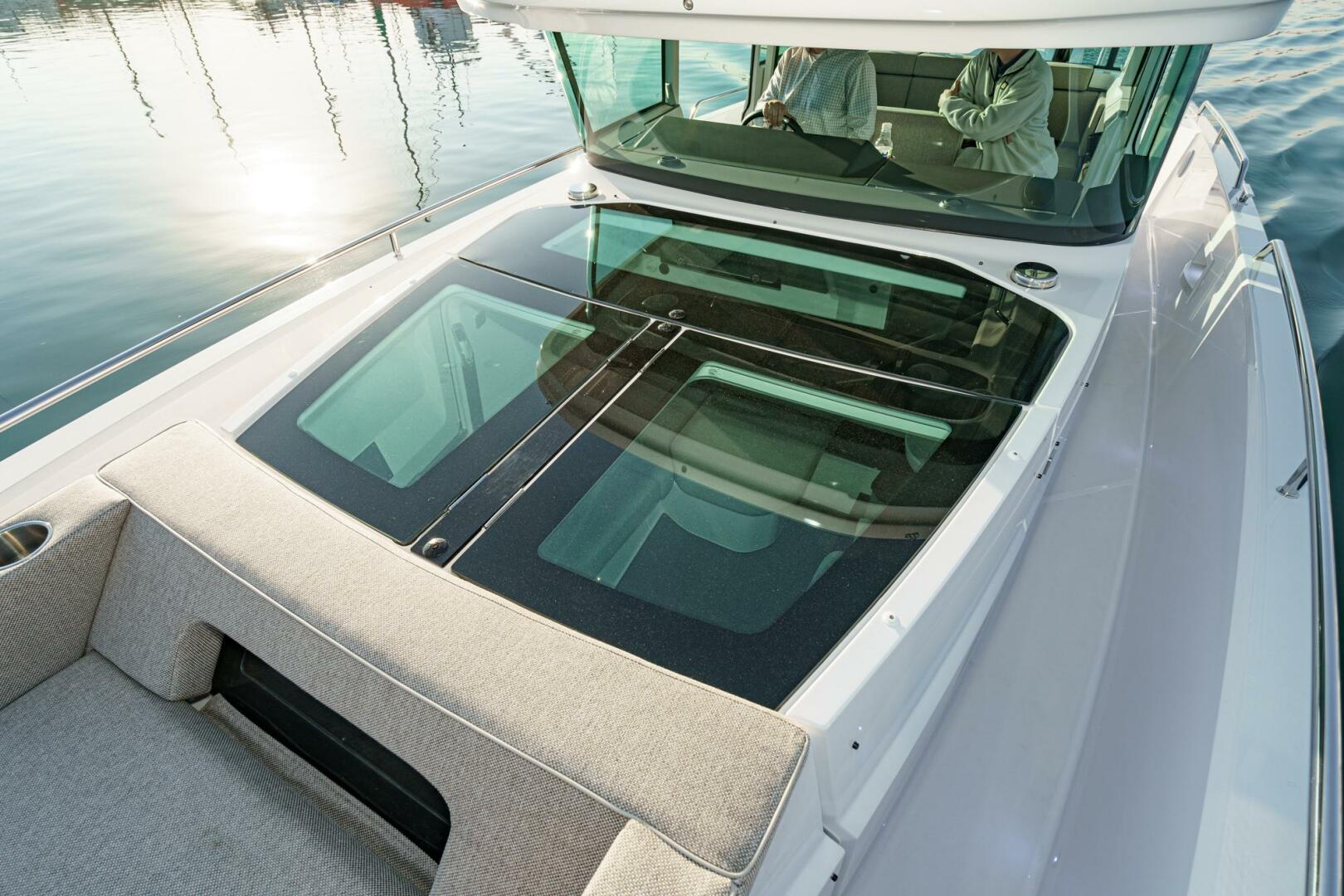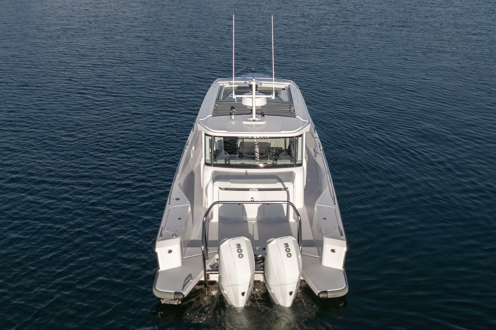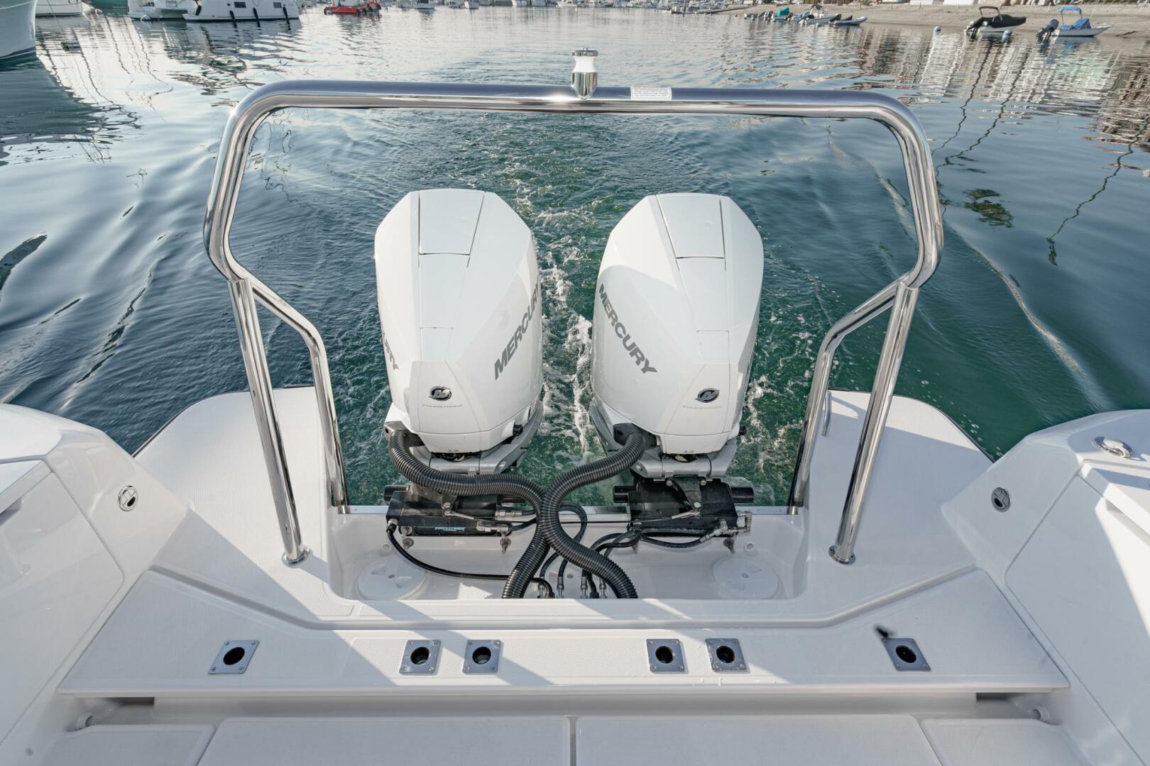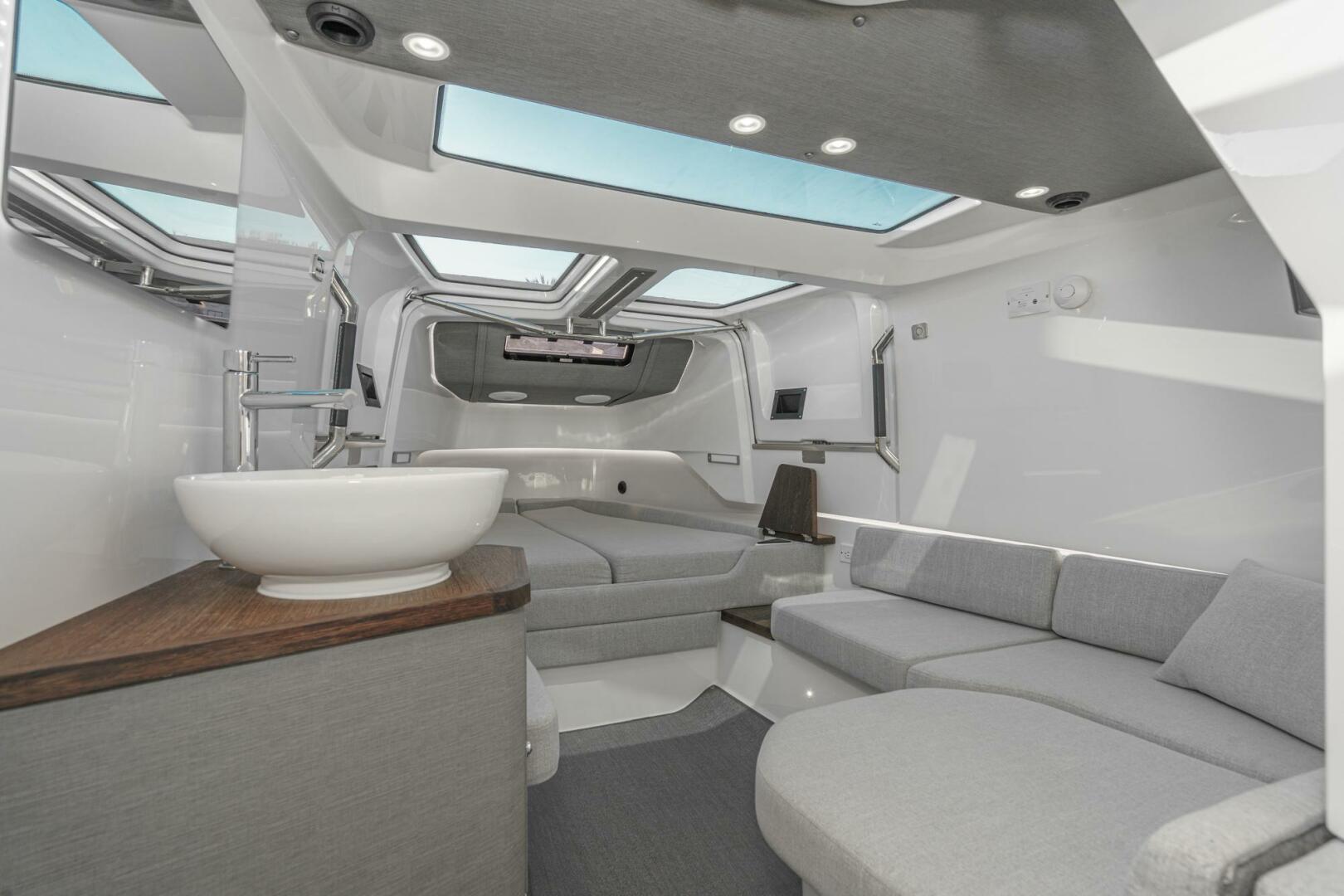 2023 37XC Cross Cabin with Mediterrana interior, removable solar panels, Mercruiser joystick with position hold, aft wet bar, and roof rack. Transferrable engine warranties and flushed after every use.