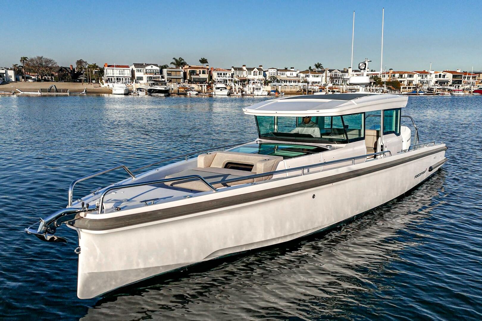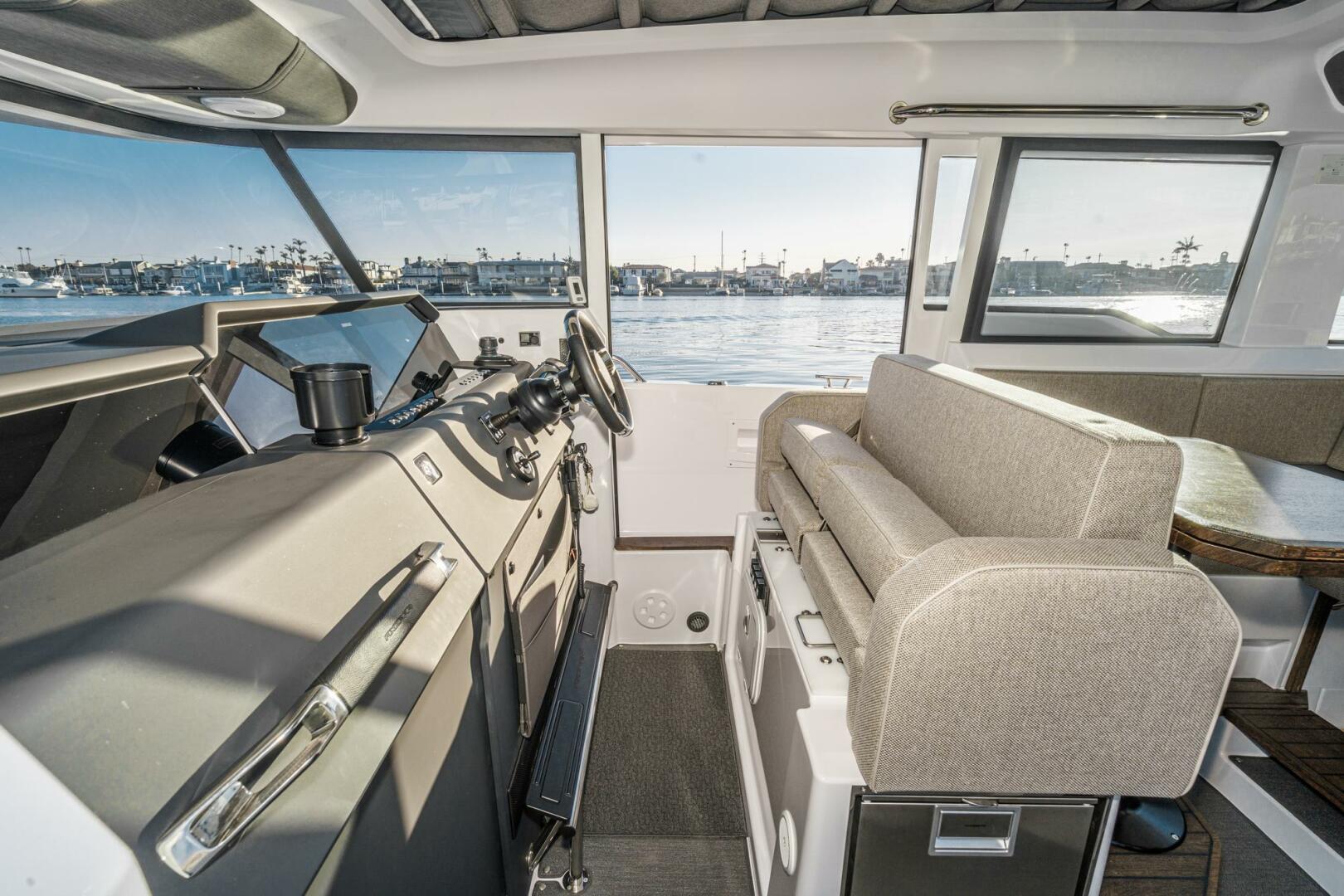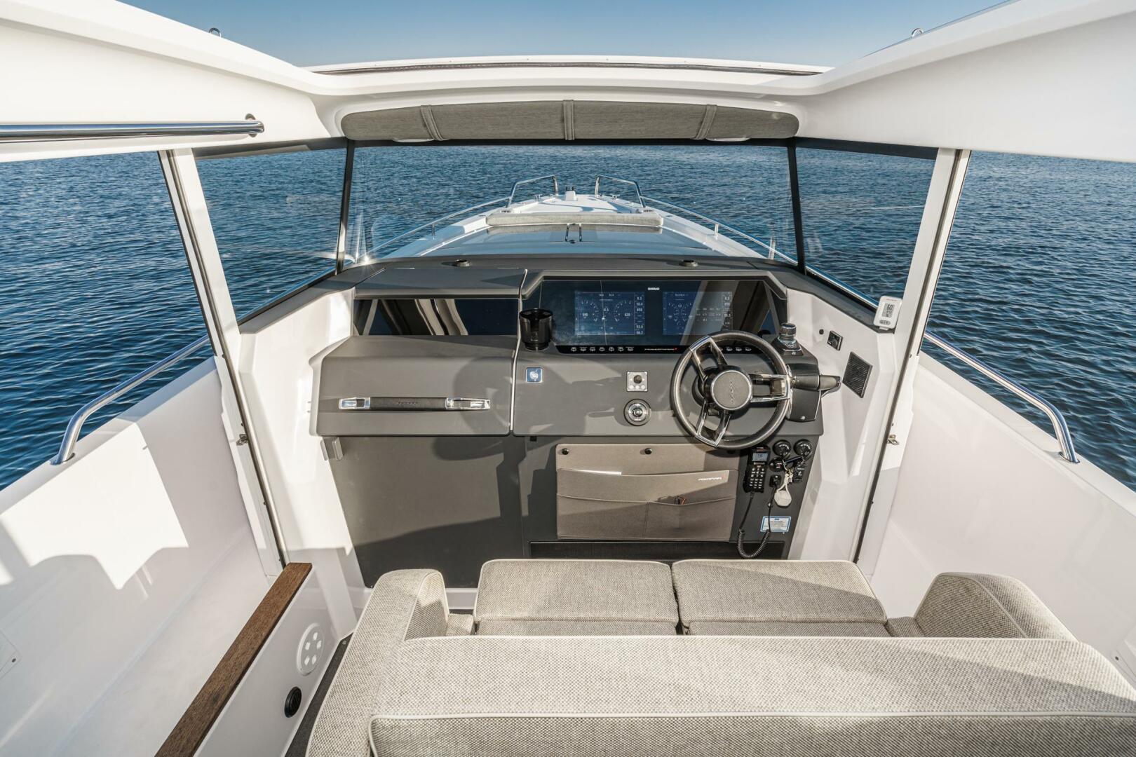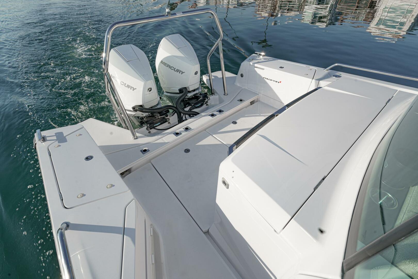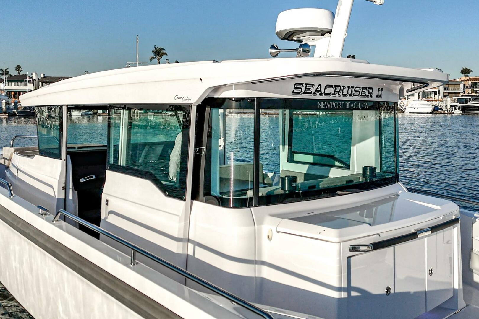 2023 37XC Cross Cabin with Mediterrana interior, removable solar panels, Mercruiser joystick with position hold, aft wet bar, and roof rack. Transferrable engine warranties and flushed after every use.