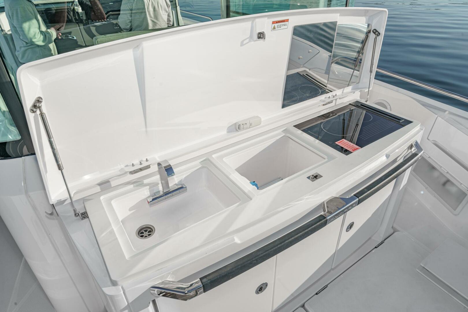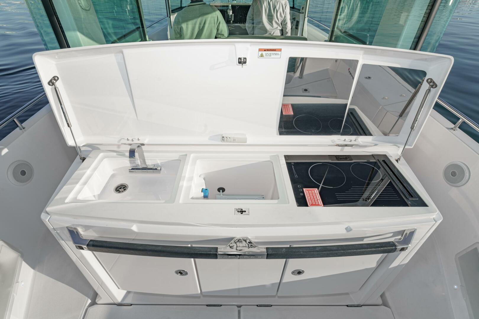 2023 37XC CROSS CABIN with the aft wet bar option including BBQ, sink & top loading refrigerator. Opening sunroof, foredeck sunshade, roof rack for kayaks & accessories, & removable solar panels with Victron charging monitor. Engines were fresh water flushed after every use, utilizing the quick connect flush system. Transferrable engine warranties, vessel held in LLC. Owner moving to a larger boat. On display. Call for details.