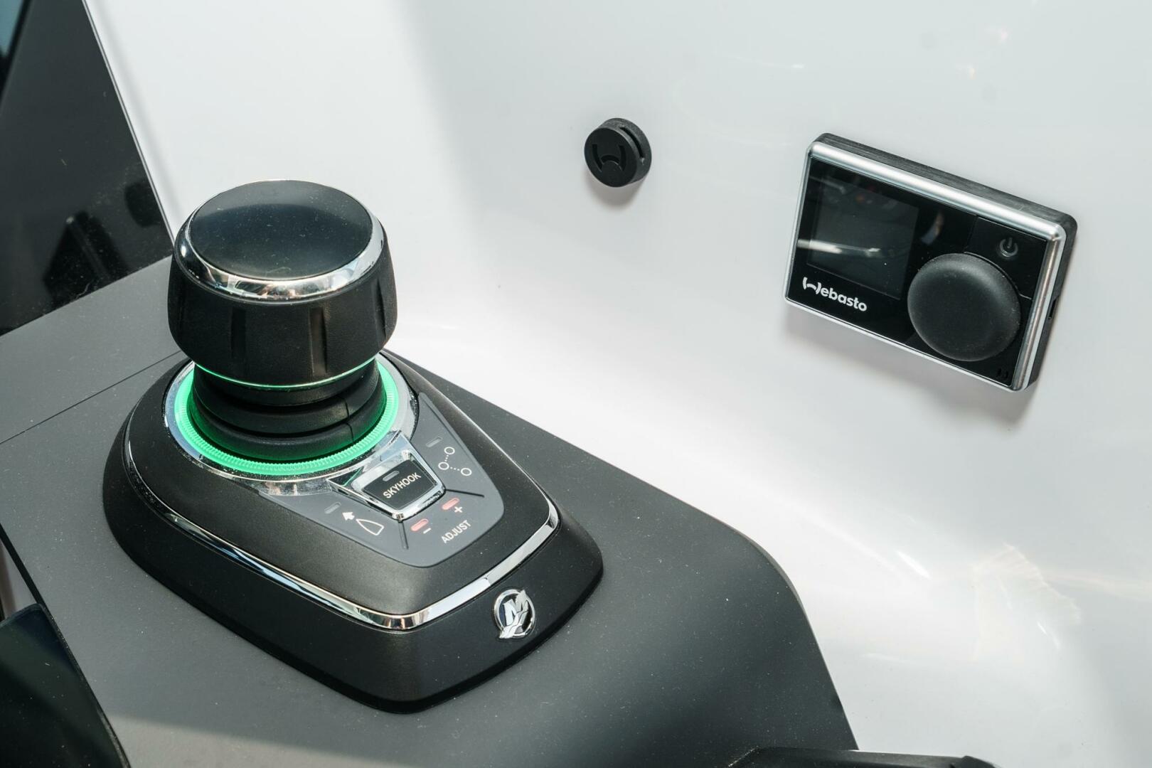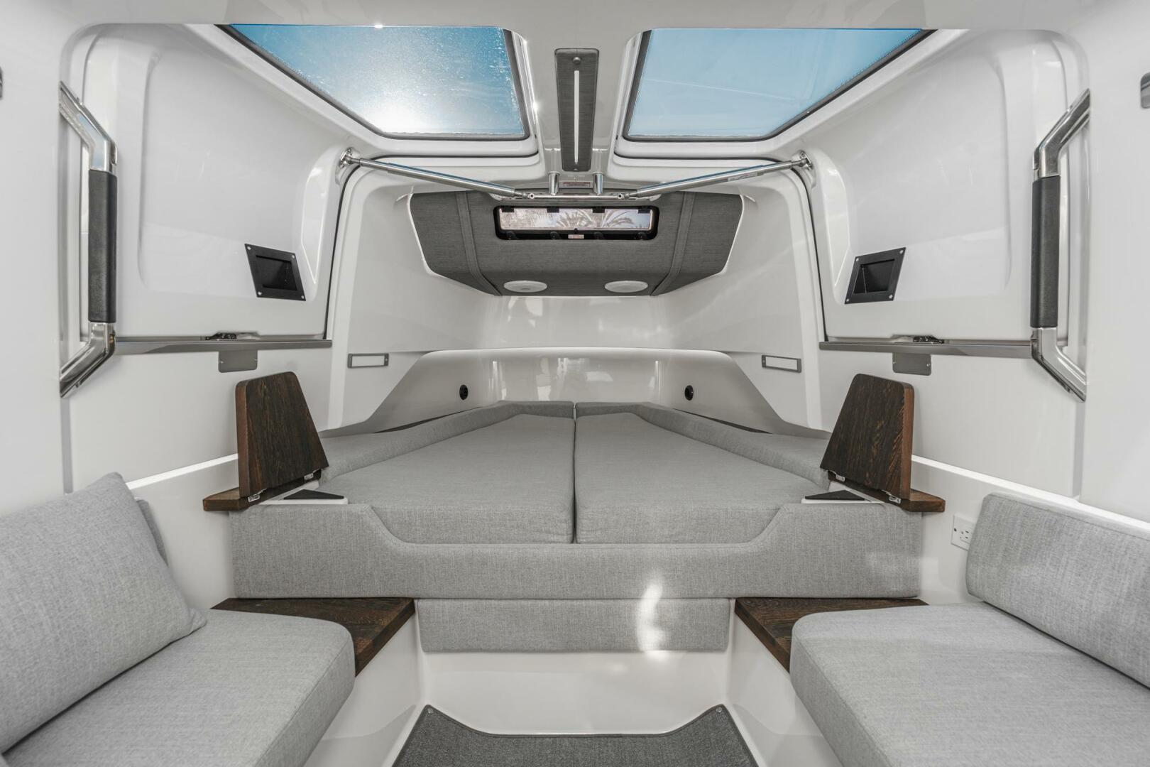 The Mediterranean model interior features cloth upholstery and bench seat at helm instead of bucket seats. Rigged for removable solar panels which are removable and mount on the roof top. The upholstery consists of exclusive and subtle yet stylish detailing with accentuated patterns and a structured feel of marine fabrics, compliment by contrast-colored pillows and piping details. The fabric keeps the interior and lounging areas at comfortable temperatures, even on the warmest summer days.