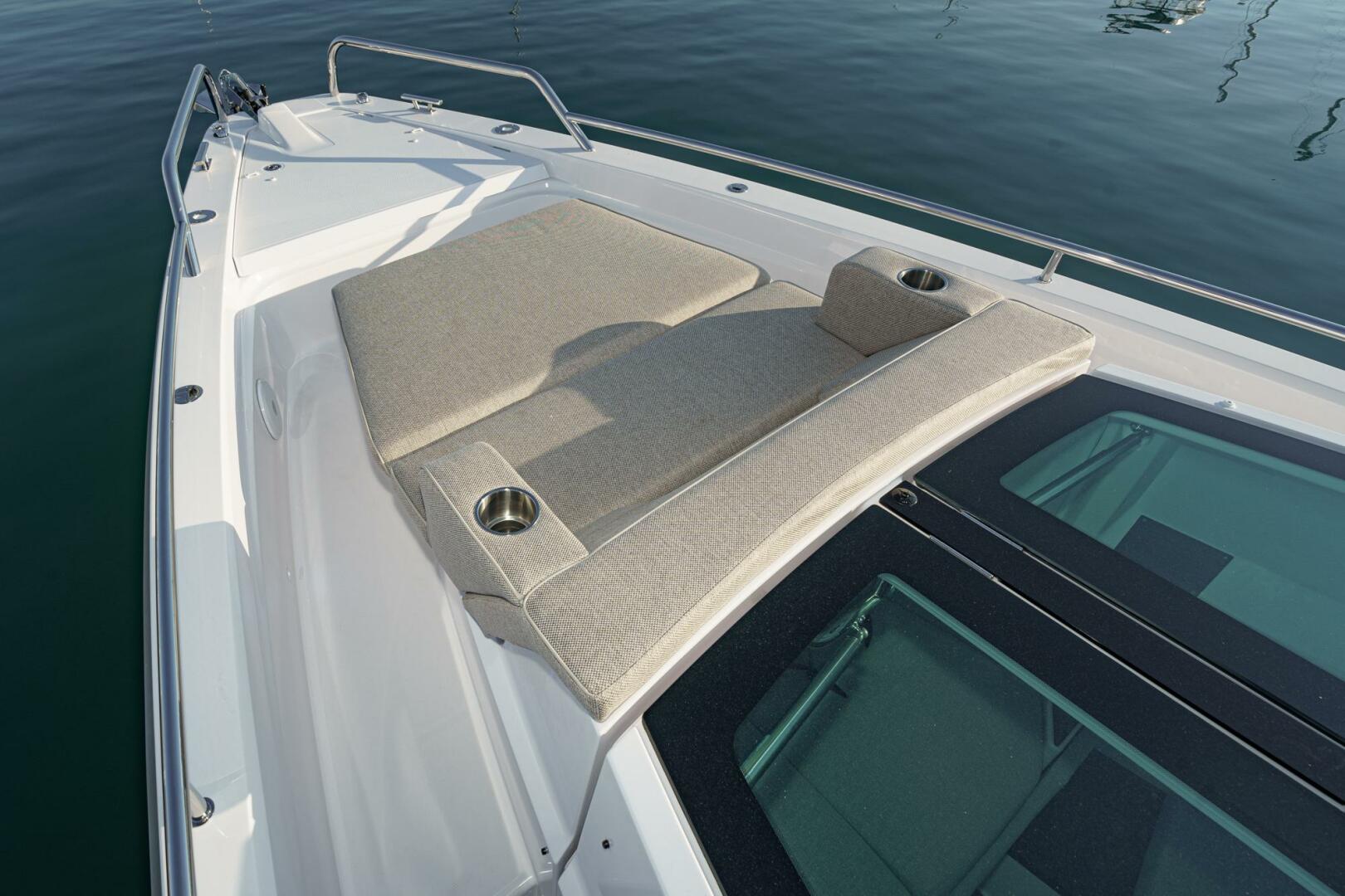- Extended foredeck seating with cupholders, fixed armrests and storage