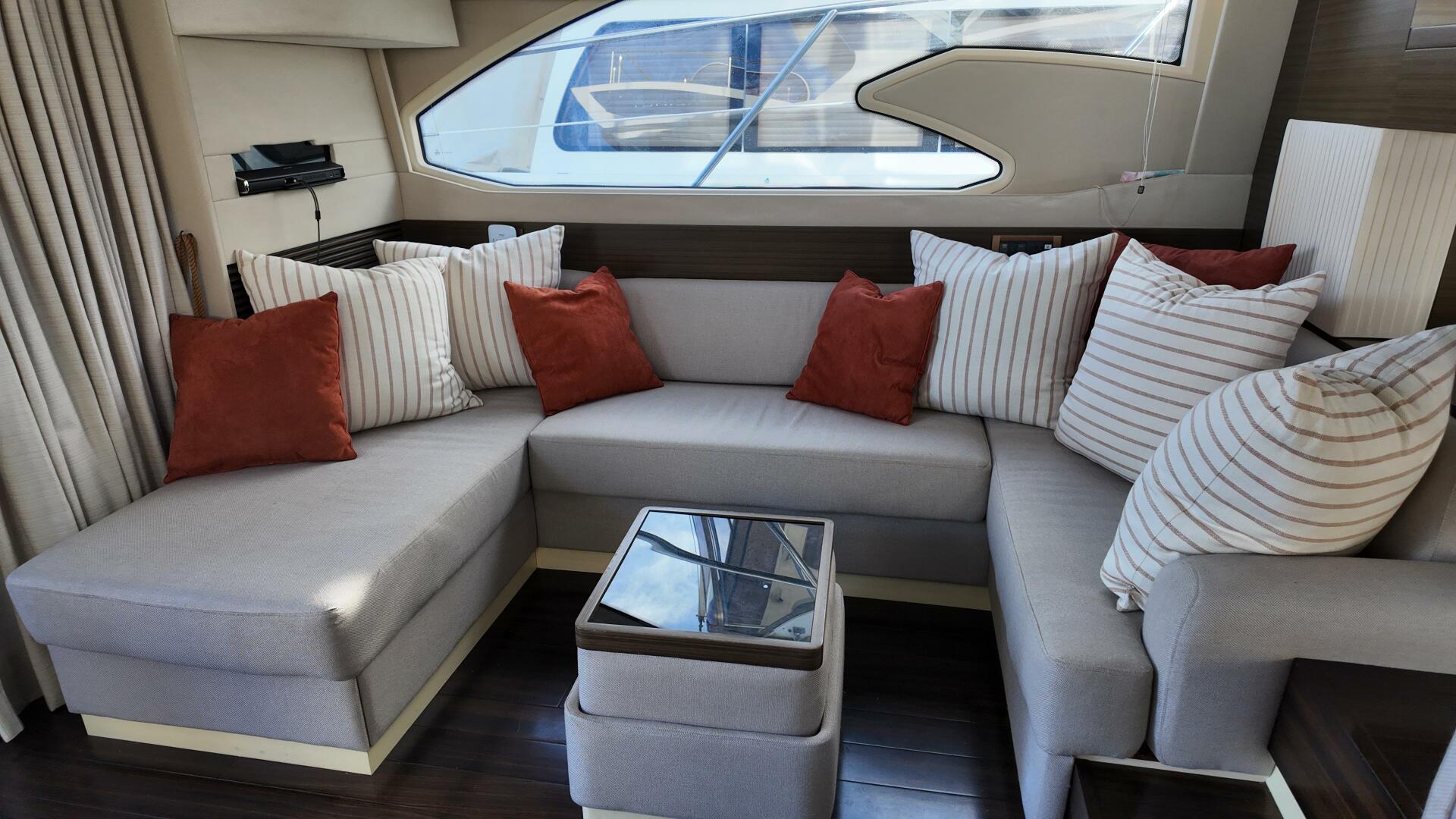 Return to the cockpit, and enter the sliding door into the salon, with U-wrap around sofa to port, and cabinetry to starboard with a built-in retractable smart TV.