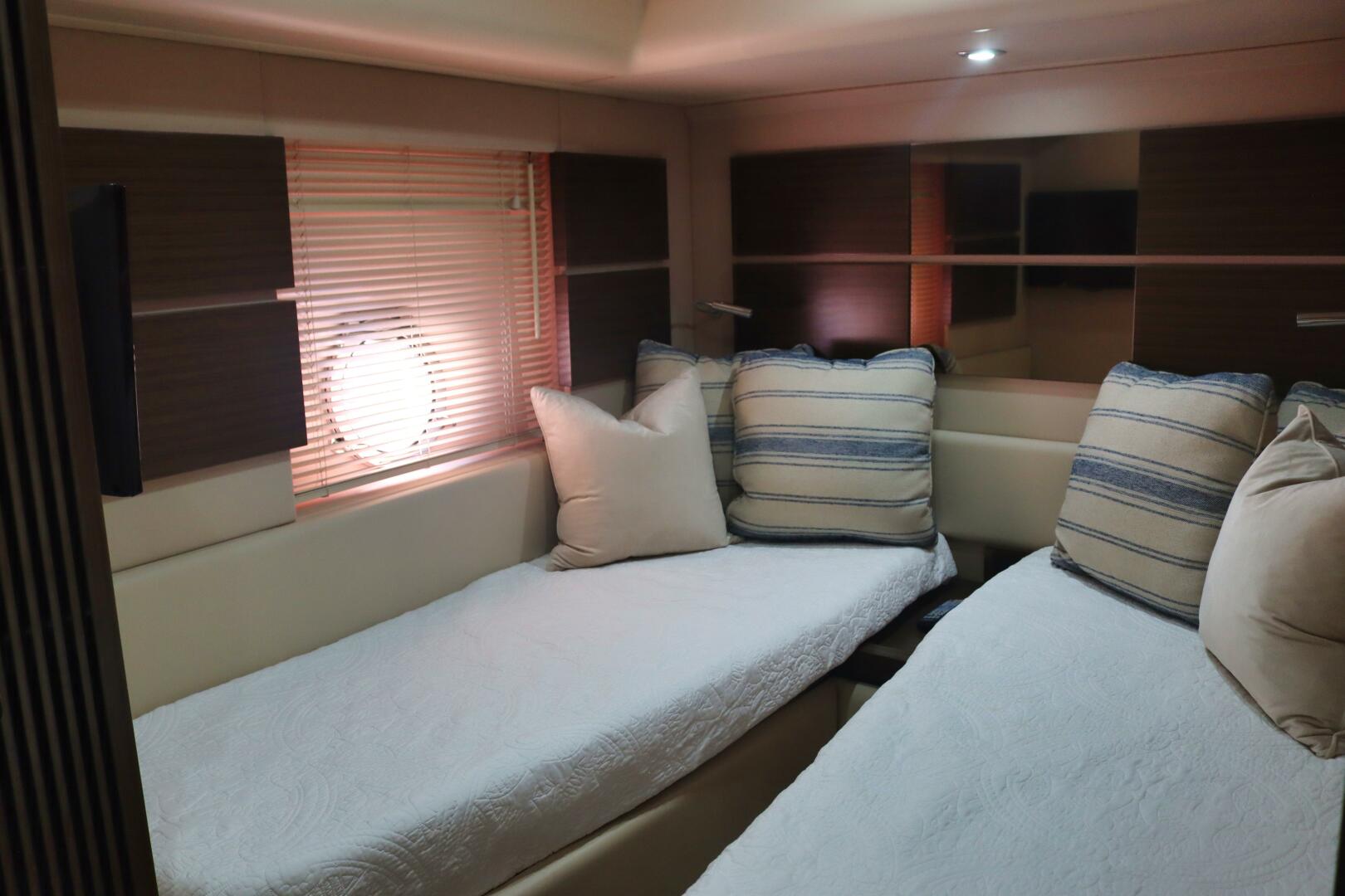 This yacht is equipped with V-Drives, not pods. Yet, the motors are integrated with the thrusters via a joystick which utilizes computer control of the shifters, RPM, and thrusters to maneuver the boat for docking in a similar single-point-of-control fashion as pods.