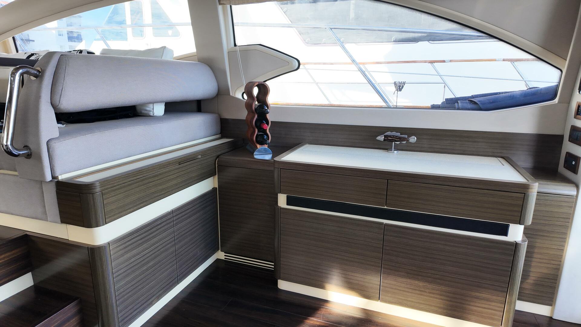 Going forward, the gallery is to port, and another settee to starboard, which includes the helm seat which can be electrically positioned either for piloting or for use at the settee.