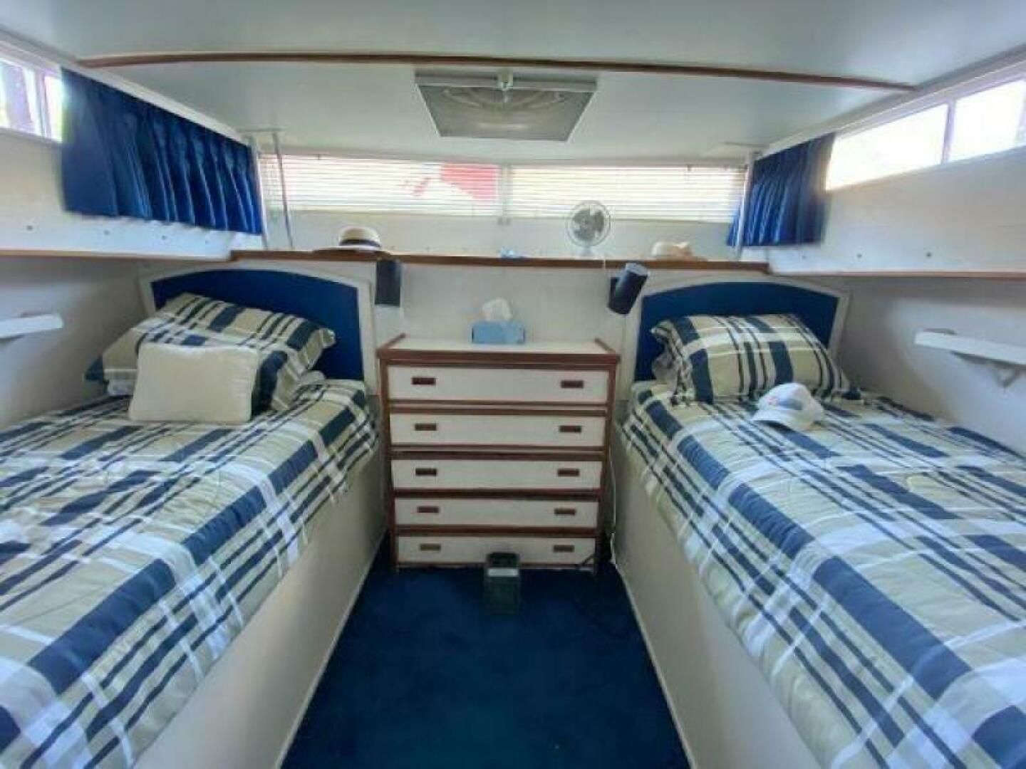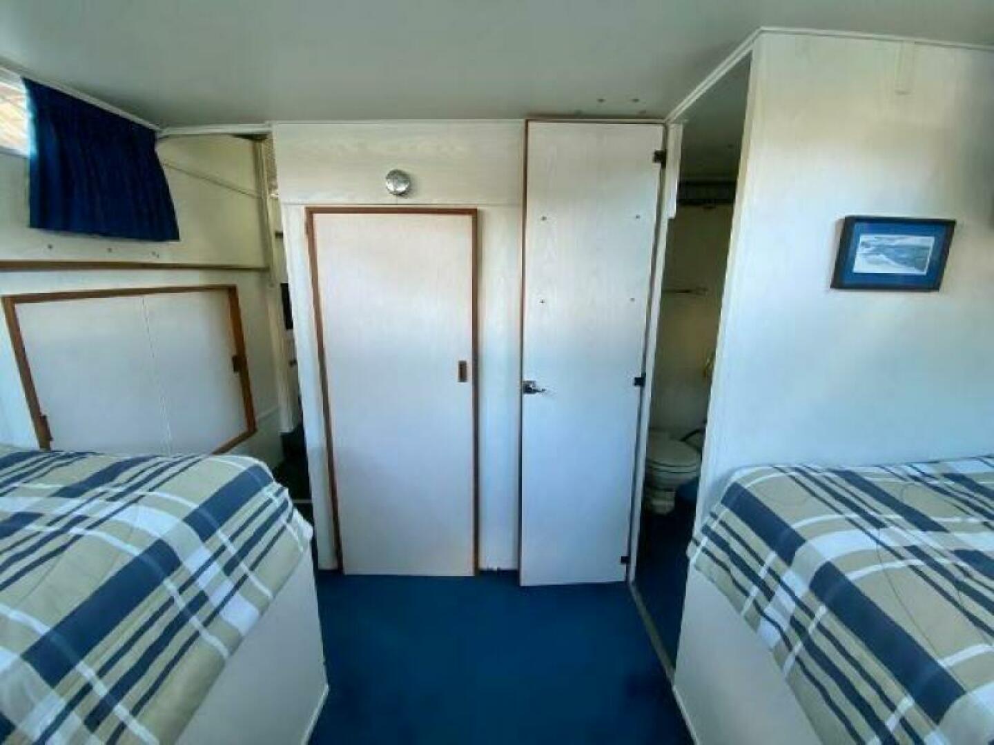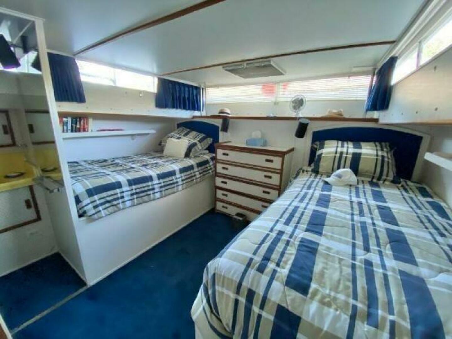 Stateroom accommodations include a Forward Stateroom that sleeps 2 adults and Aft Cabin with twin single beds. Forward and aft heads both equipped with Vacuflush flush toilets.