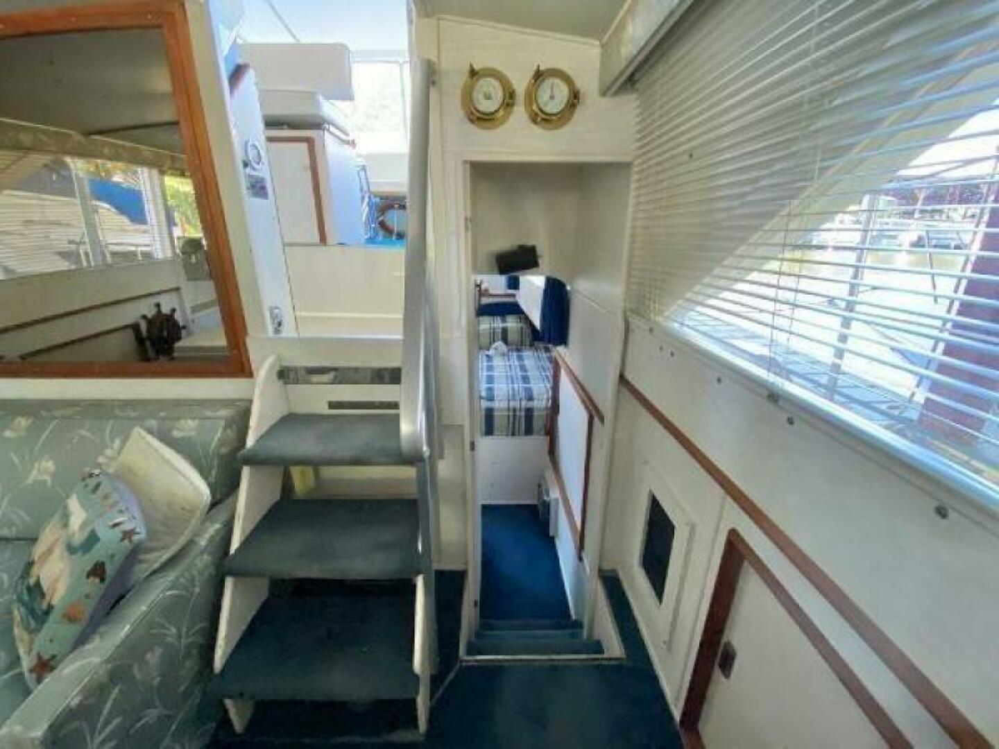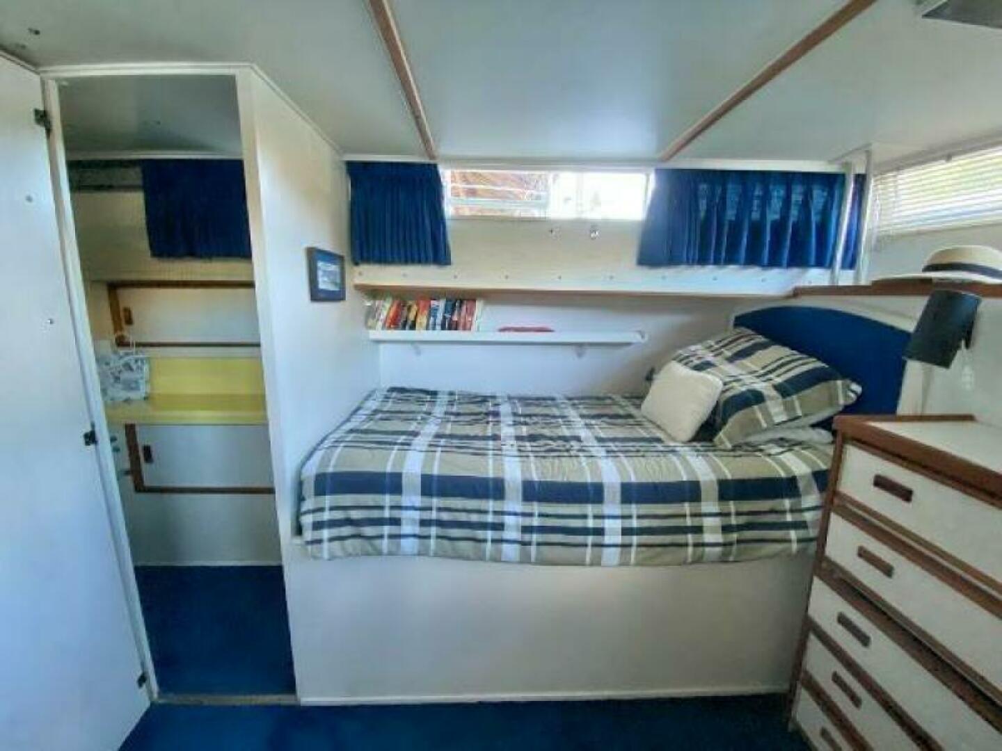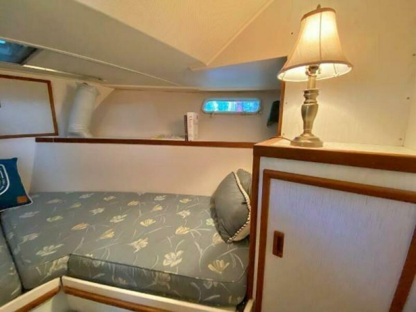 Stateroom accommodations include a Forward Stateroom that sleeps 2 adults and Aft Cabin with twin single beds. Forward and aft heads both equipped with Vacuflush flush toilets.