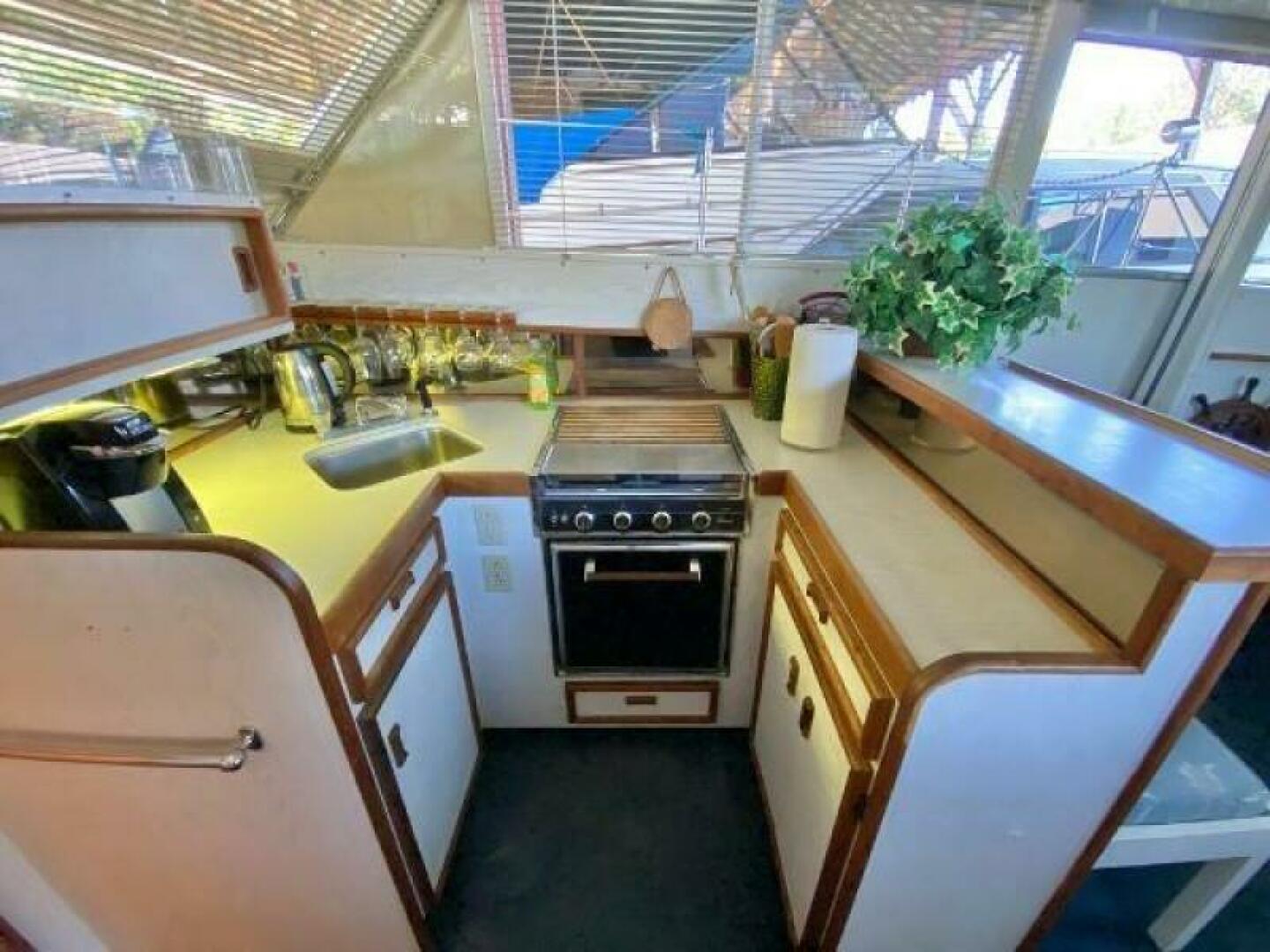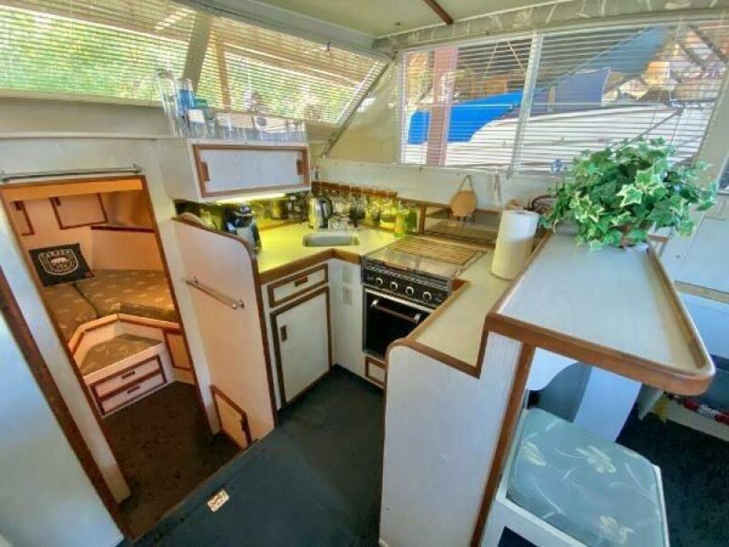Below deck this yacht provides an amazing 2 stateroom and 2 head layout, separated by a spacious salon and galley. The large galley features a fridge with separate freezer and icemaker, sink, 3 burner stove and oven, and microwave. The salon has beautiful views through the large side windows and forward windshield.