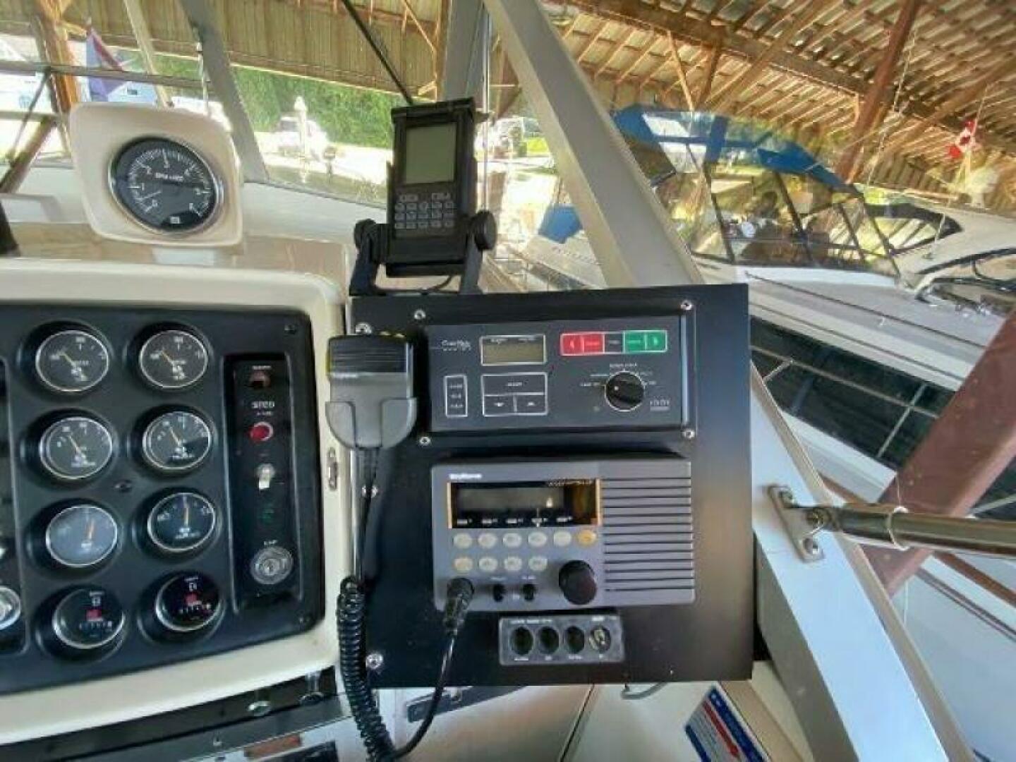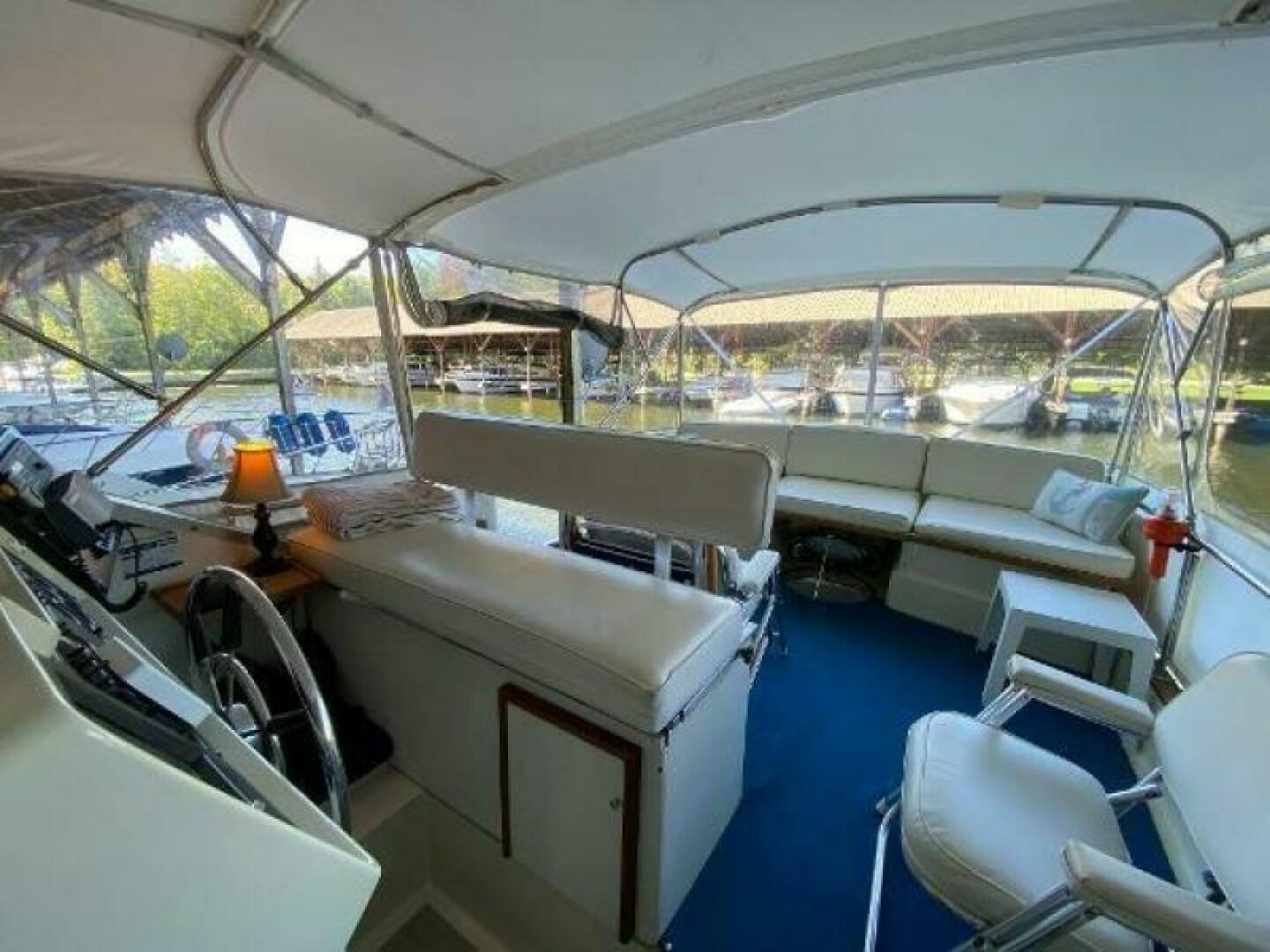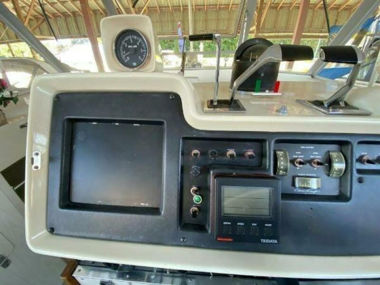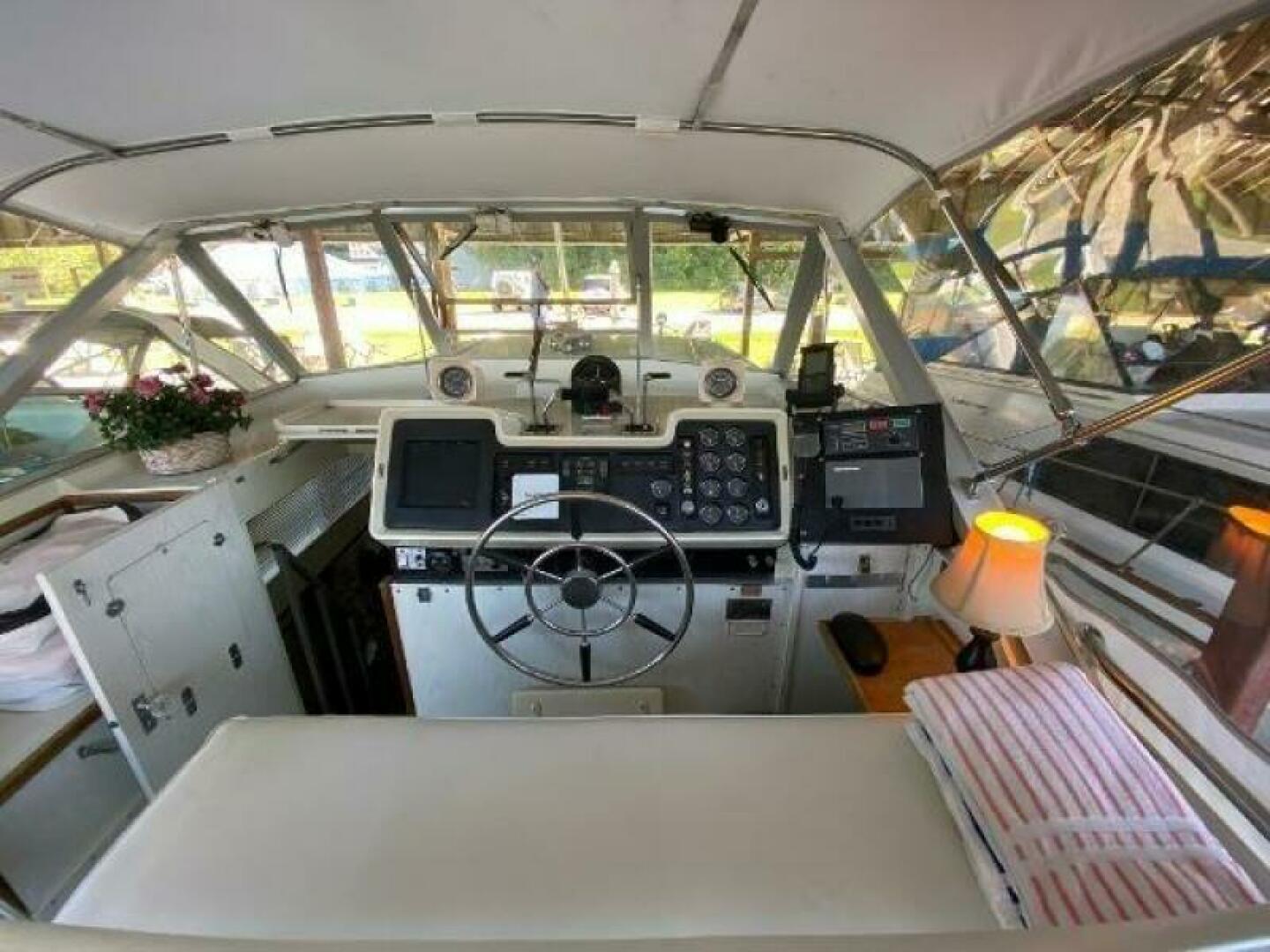 The cockpit is equipped with a full canvas enclosure and plenty of seating for friends and family. The helm includes a Raytheon VHF, ComNav Autohelm, all gauges, and eclectic windlass controls.