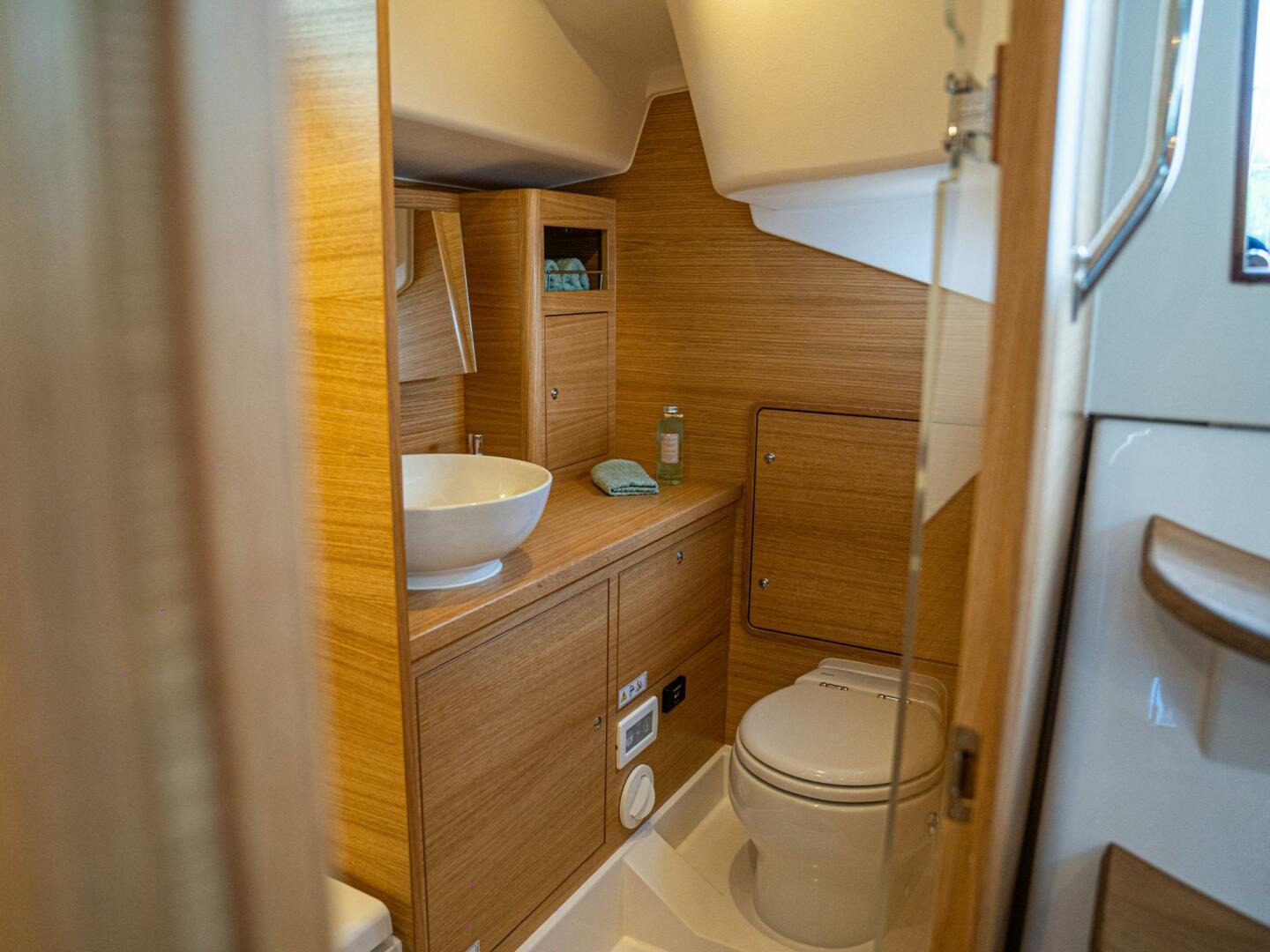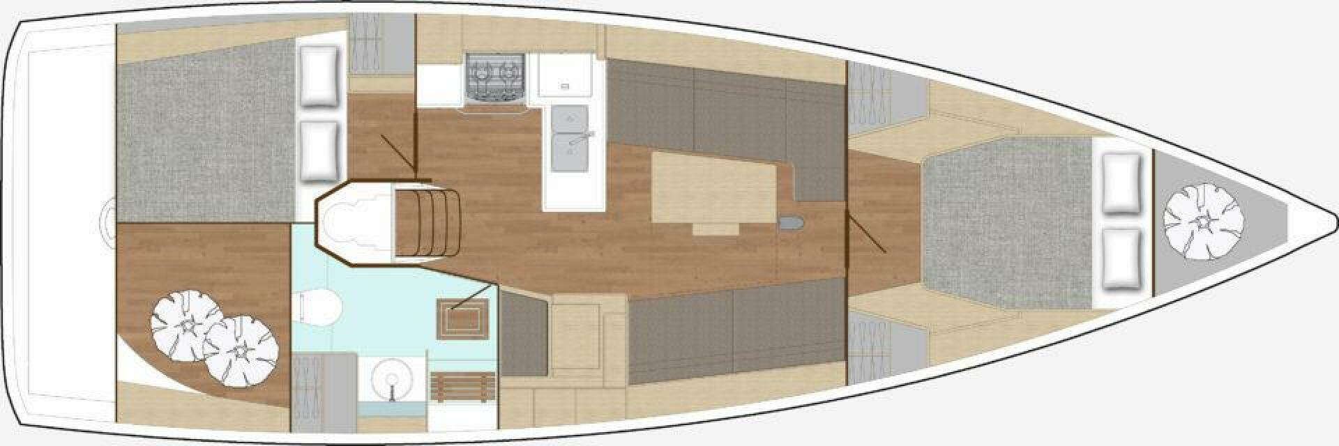 The two cabin layout has a head compartment with separate shower compartment and features a forward-facing navigation station with full length sofa.