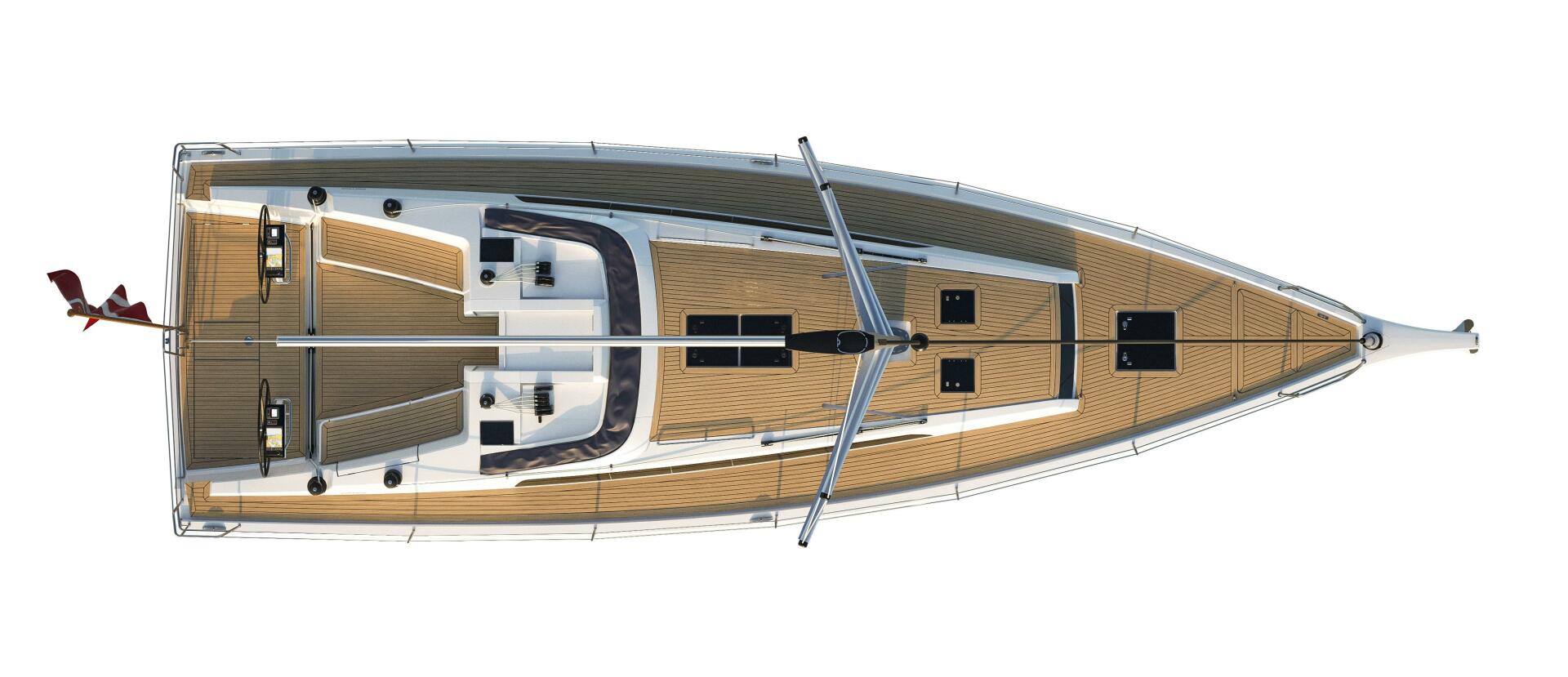 The X4³ has an optional bathing platform with a large removable bathing ladder. The bathing platform can easily be lifted using a simple rope mechanism. Adjustable foot-chocks integrated into the lazarette hatches ensure the helmsman may enjoy a perfect steering position, with a sense of security as well as a clear view forward during maneuvers and close sailing situations.