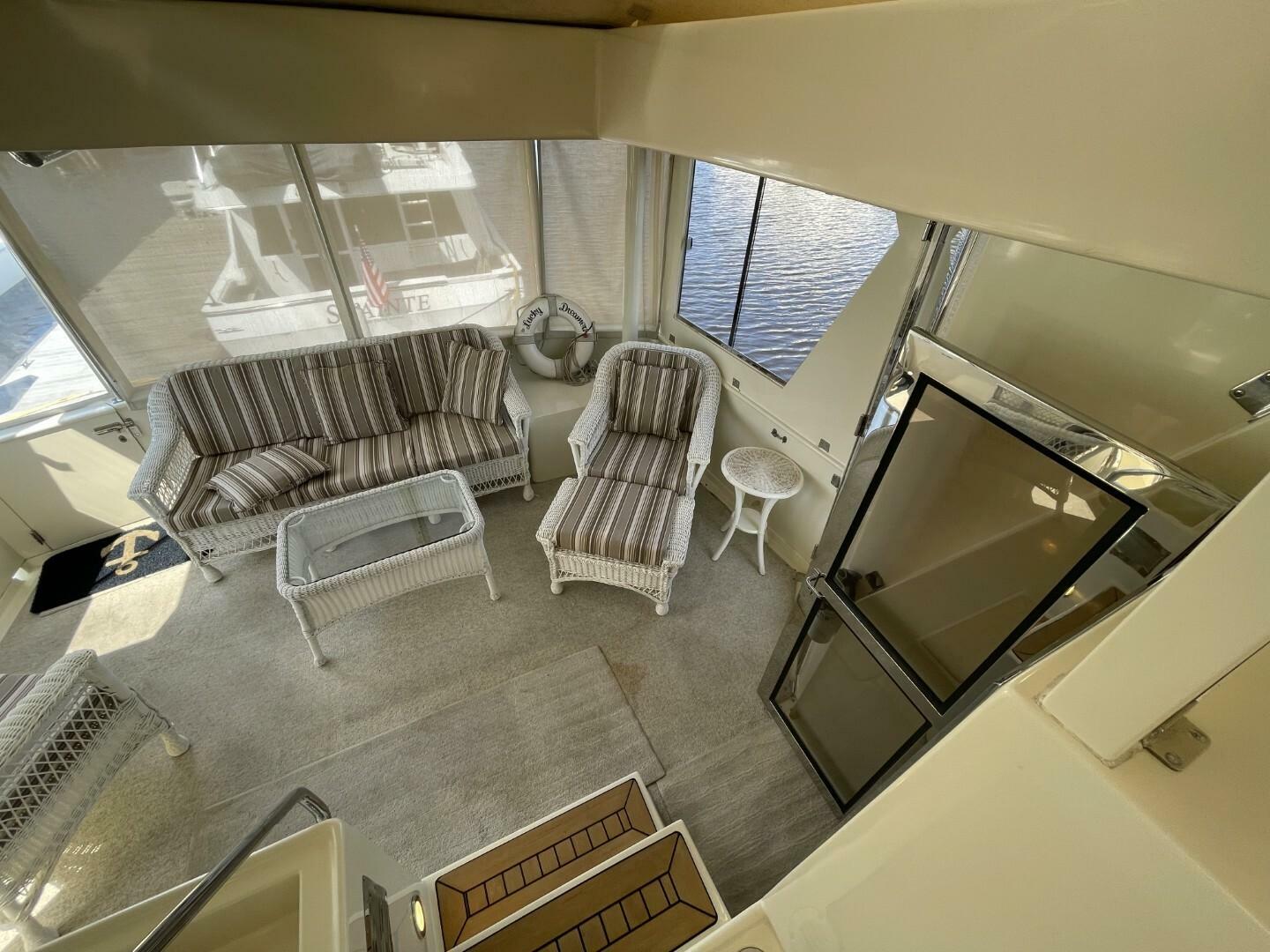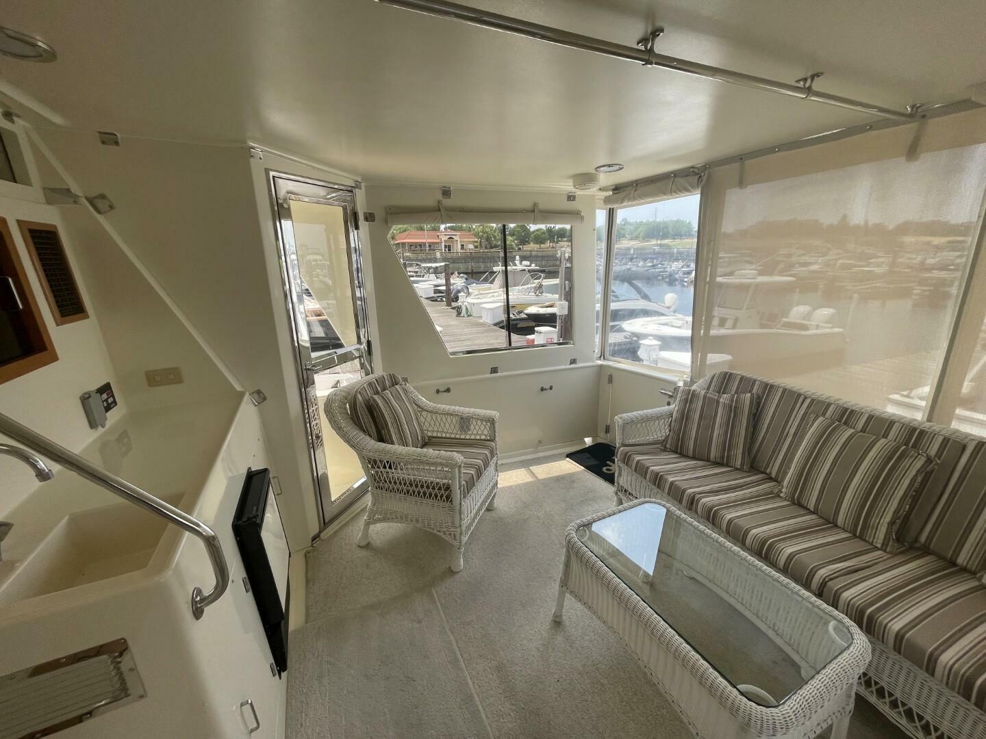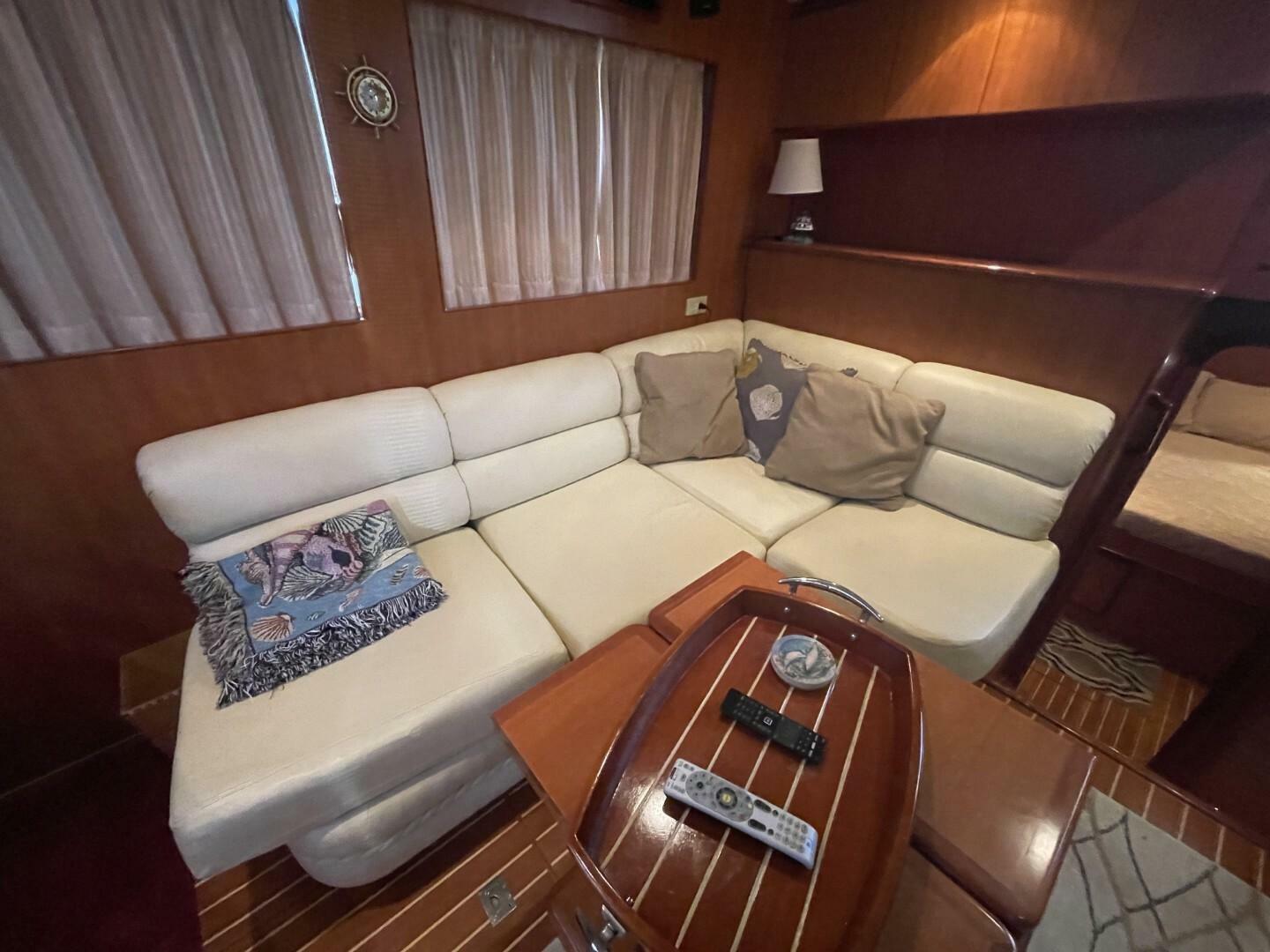 From fully enclosed sundeck enter into bright salon with sofa on starboard and storage on port side.