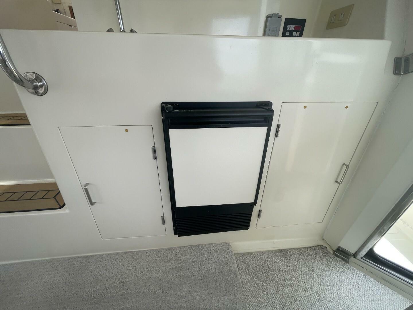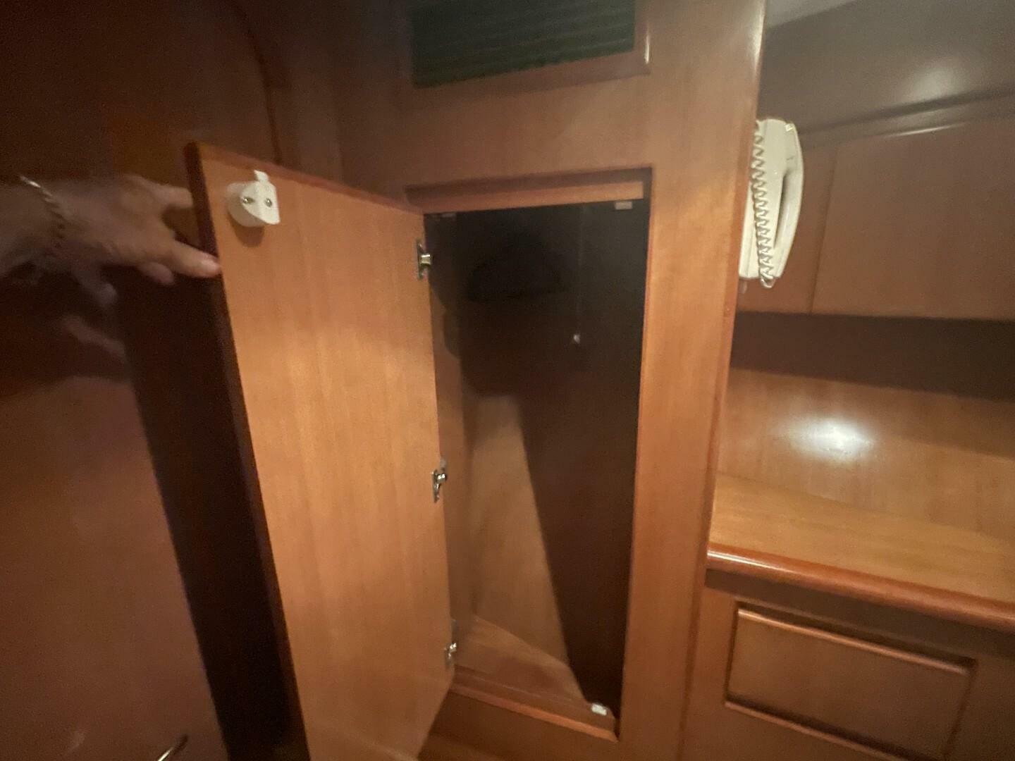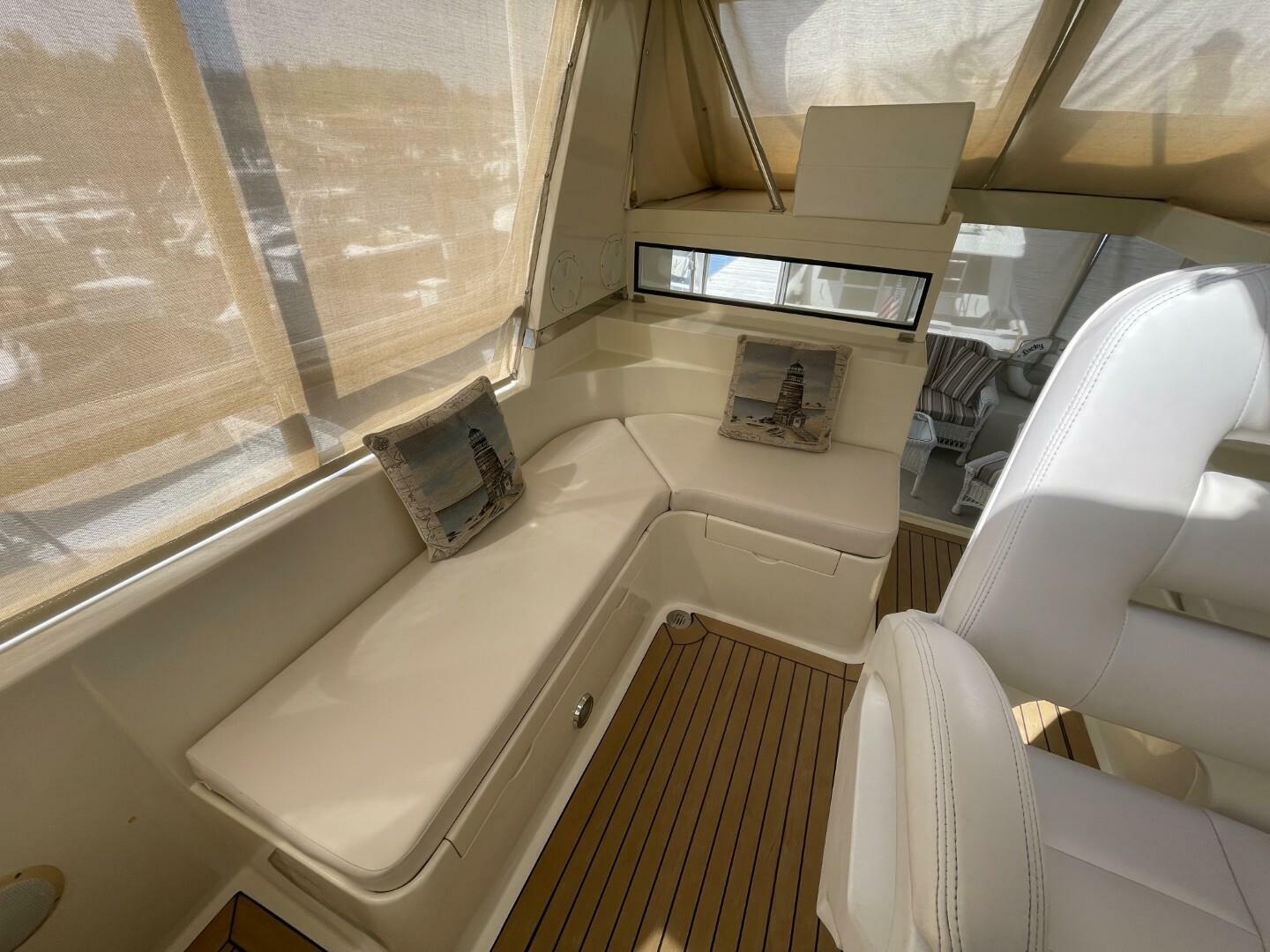 From fully enclosed sundeck enter into bright salon with sofa on starboard and storage on port side.