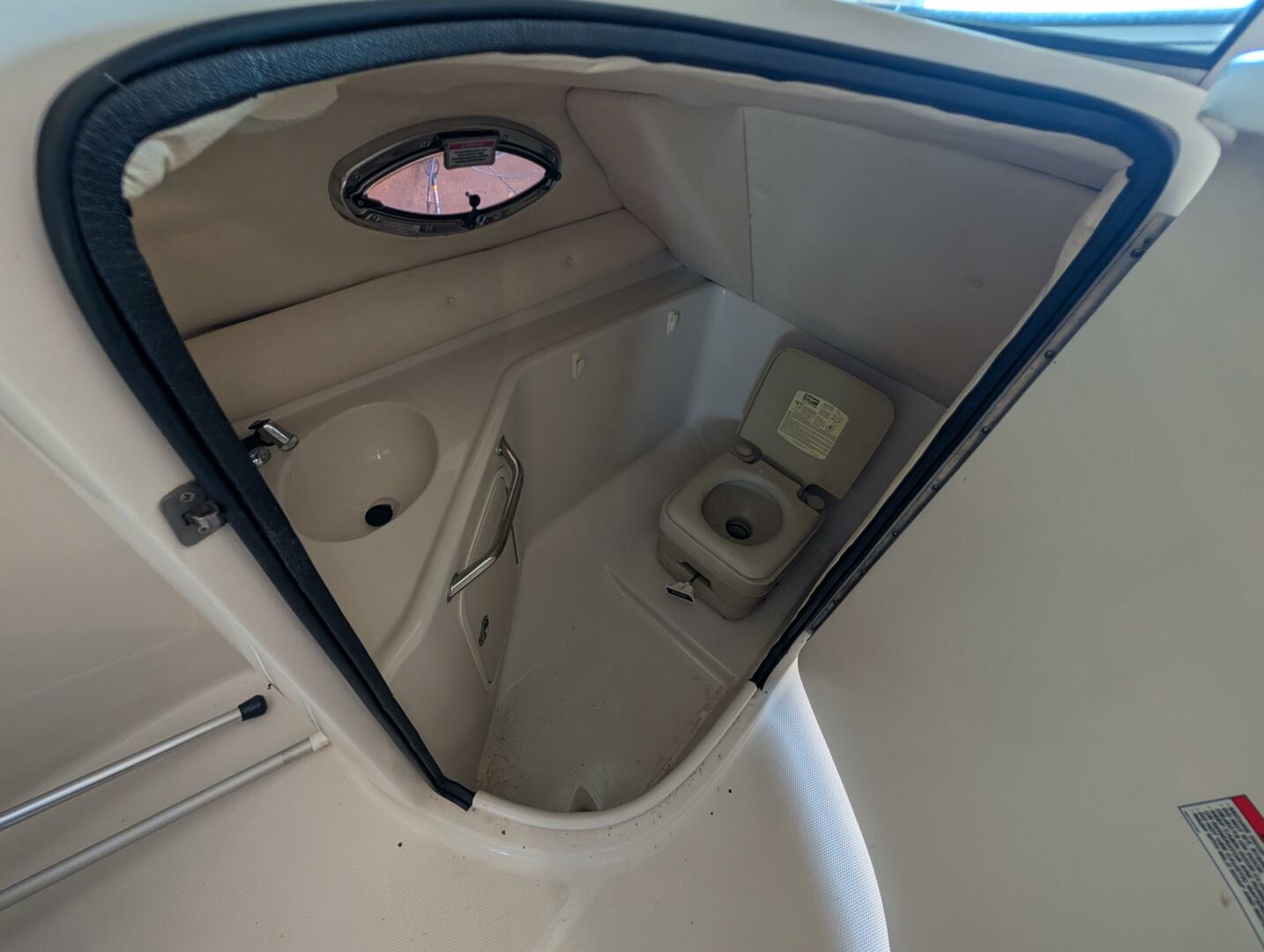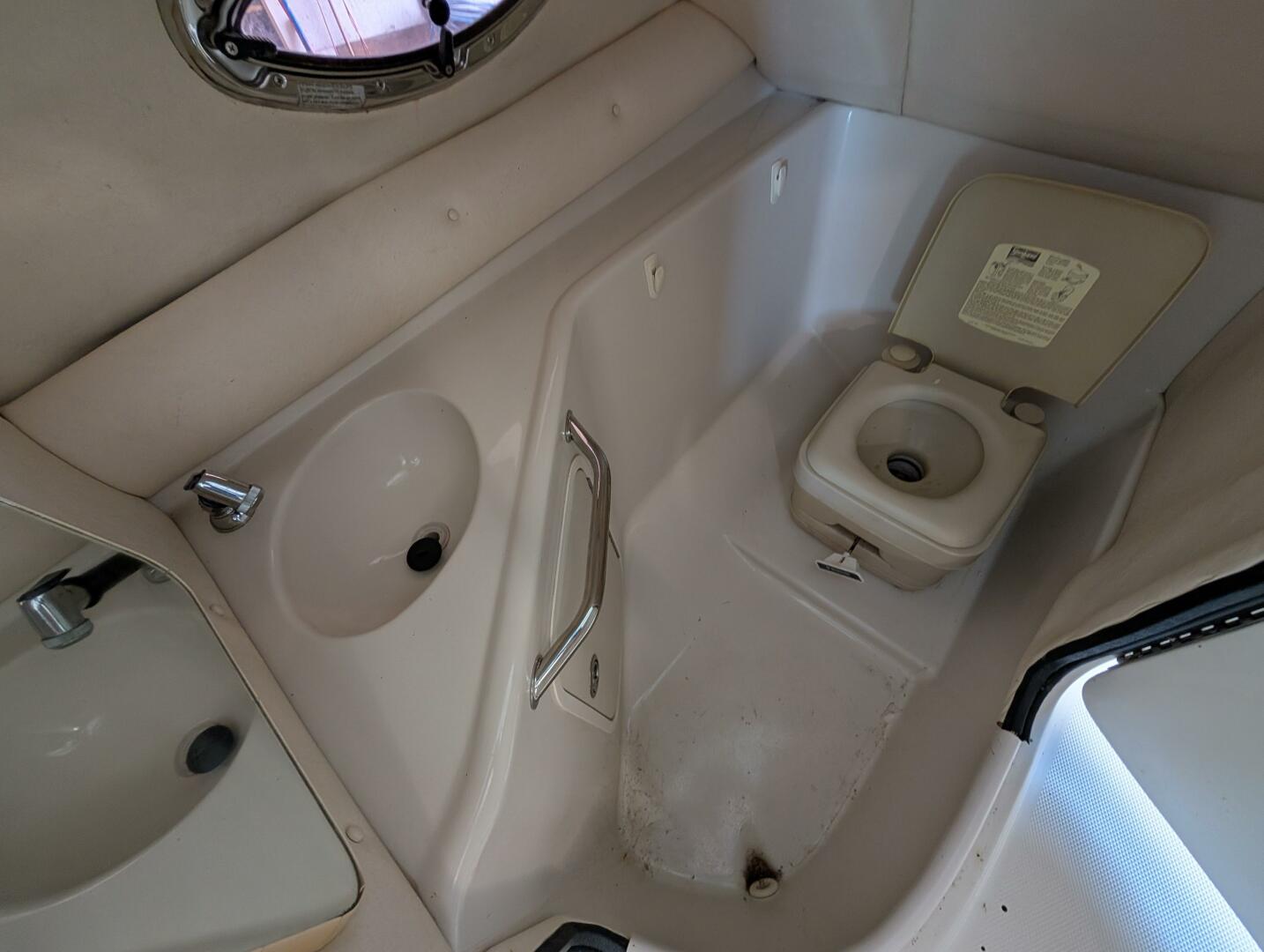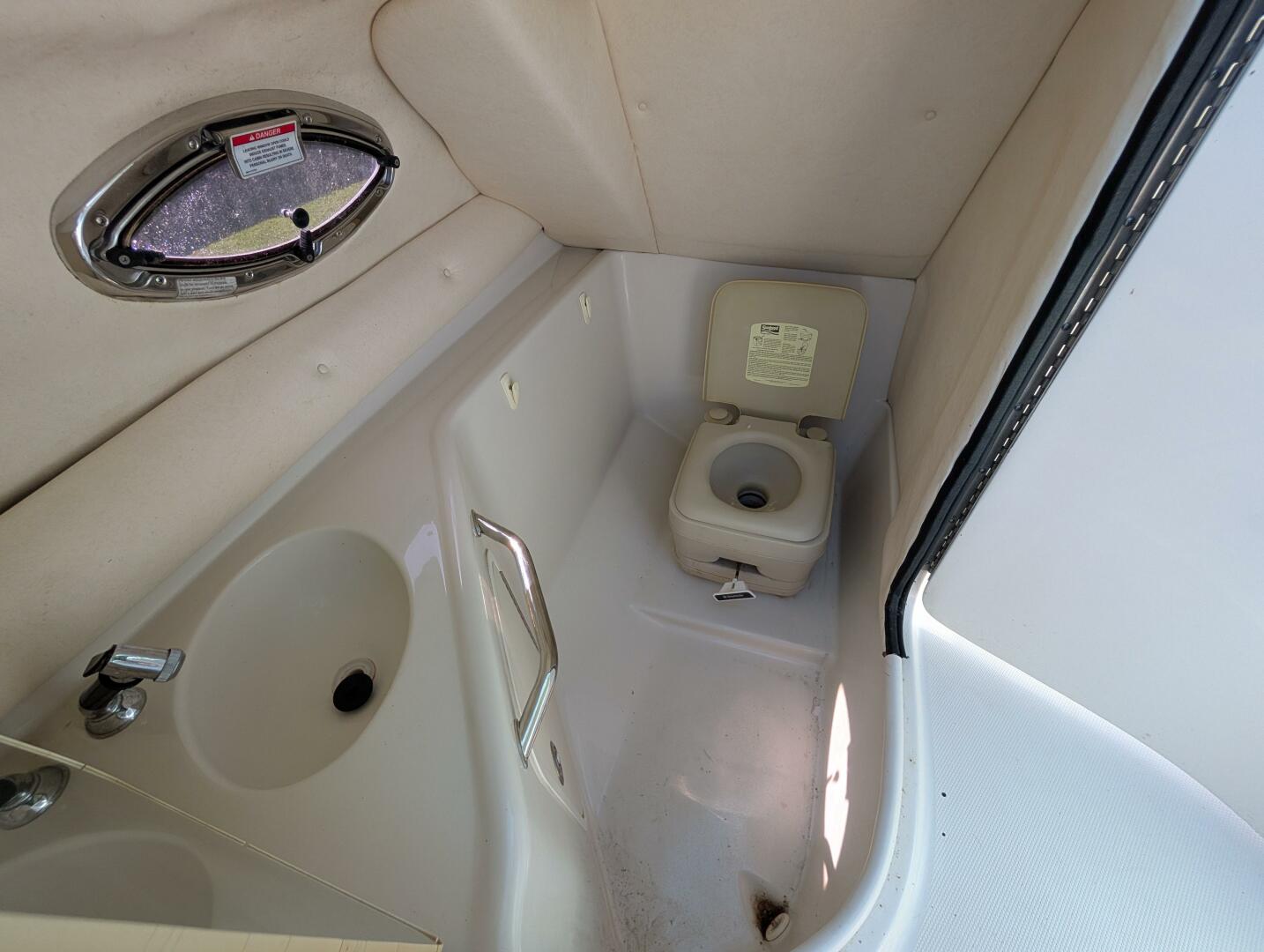 Enclosed Head: Portside compartment with sink, faucet, holding tank