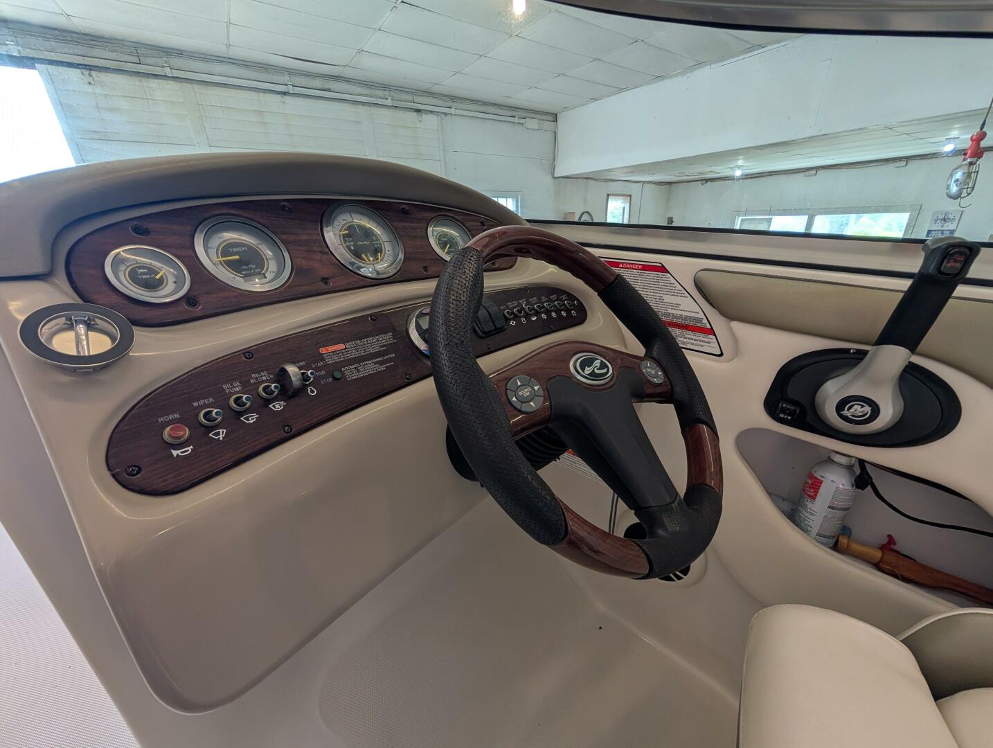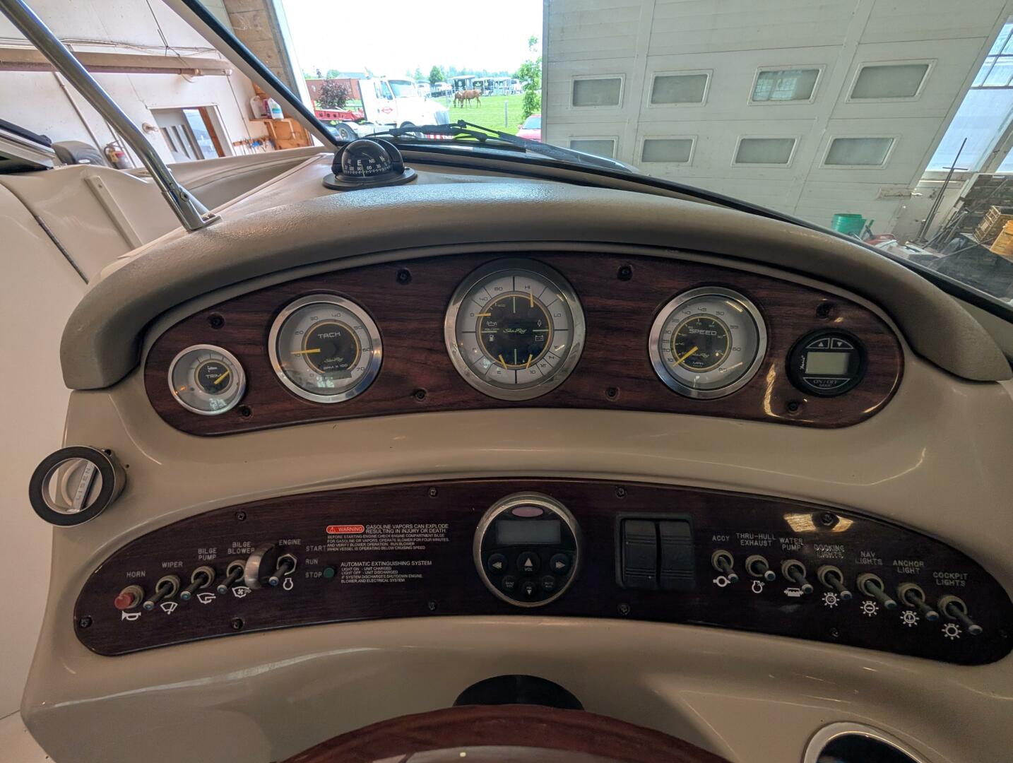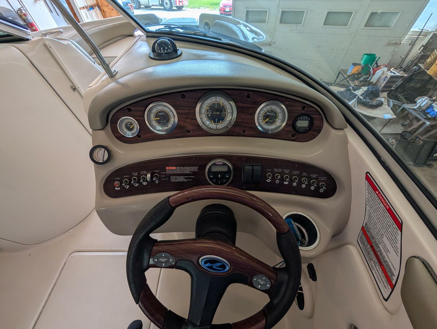Helm: Original Sea Ray analog gauge cluster with trim, tach, fuel, volt, speed, oil pressure, temp