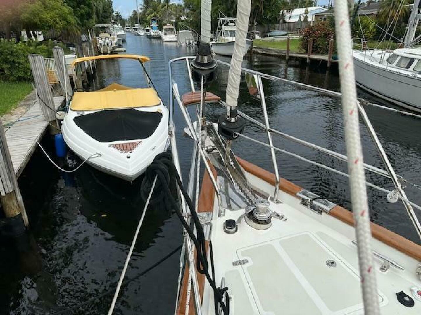 Last Love has a sleek profile with an ICW compatible rig. With a 6' shoal draft, she is also perfect for island cruising. The easily handled Solent rig is complete with a Yankee and a self-tacking jib. The fully enclosed, spacious cockpit can easily accommodate a crew of six and the helm has a full complement of electronics. The stern features a walk-up transom and stainless steel dinghy davits.