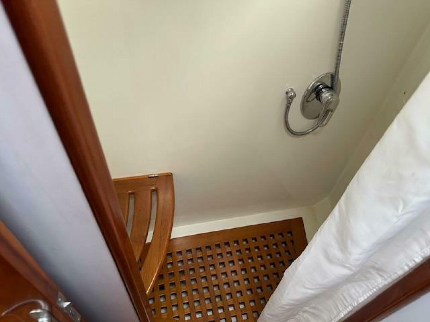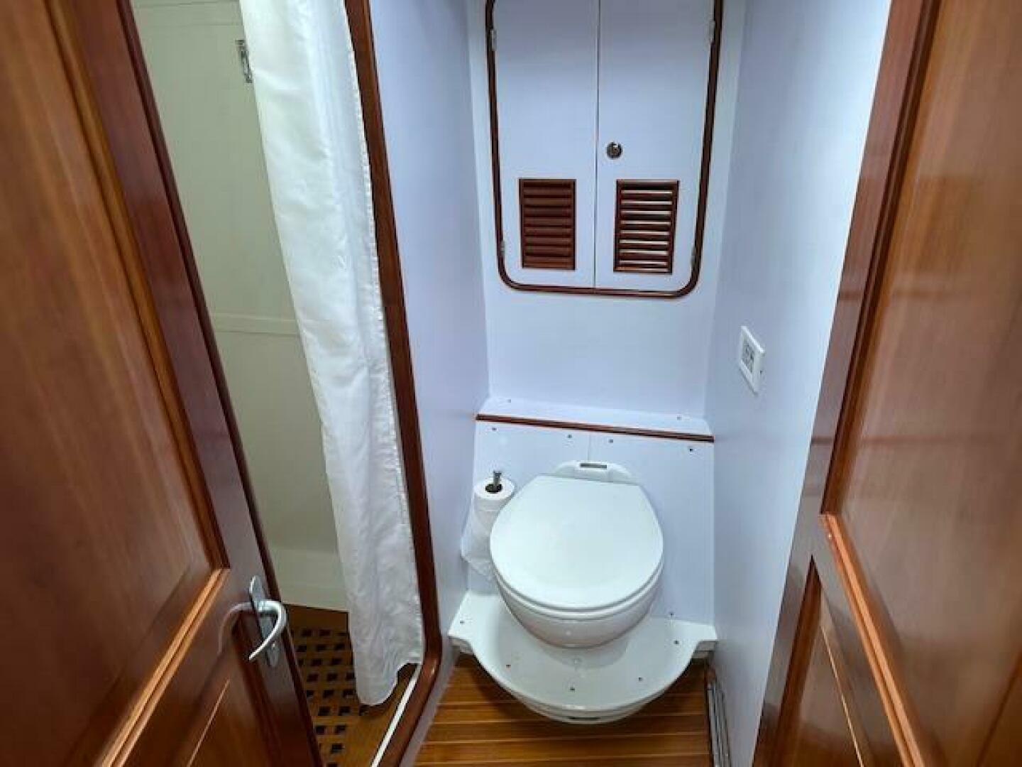 - The head has a electric marine toilet, storage lockers and an ensuite shower stall