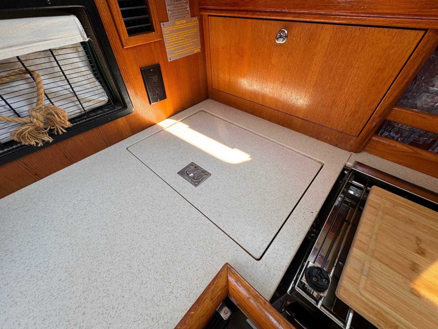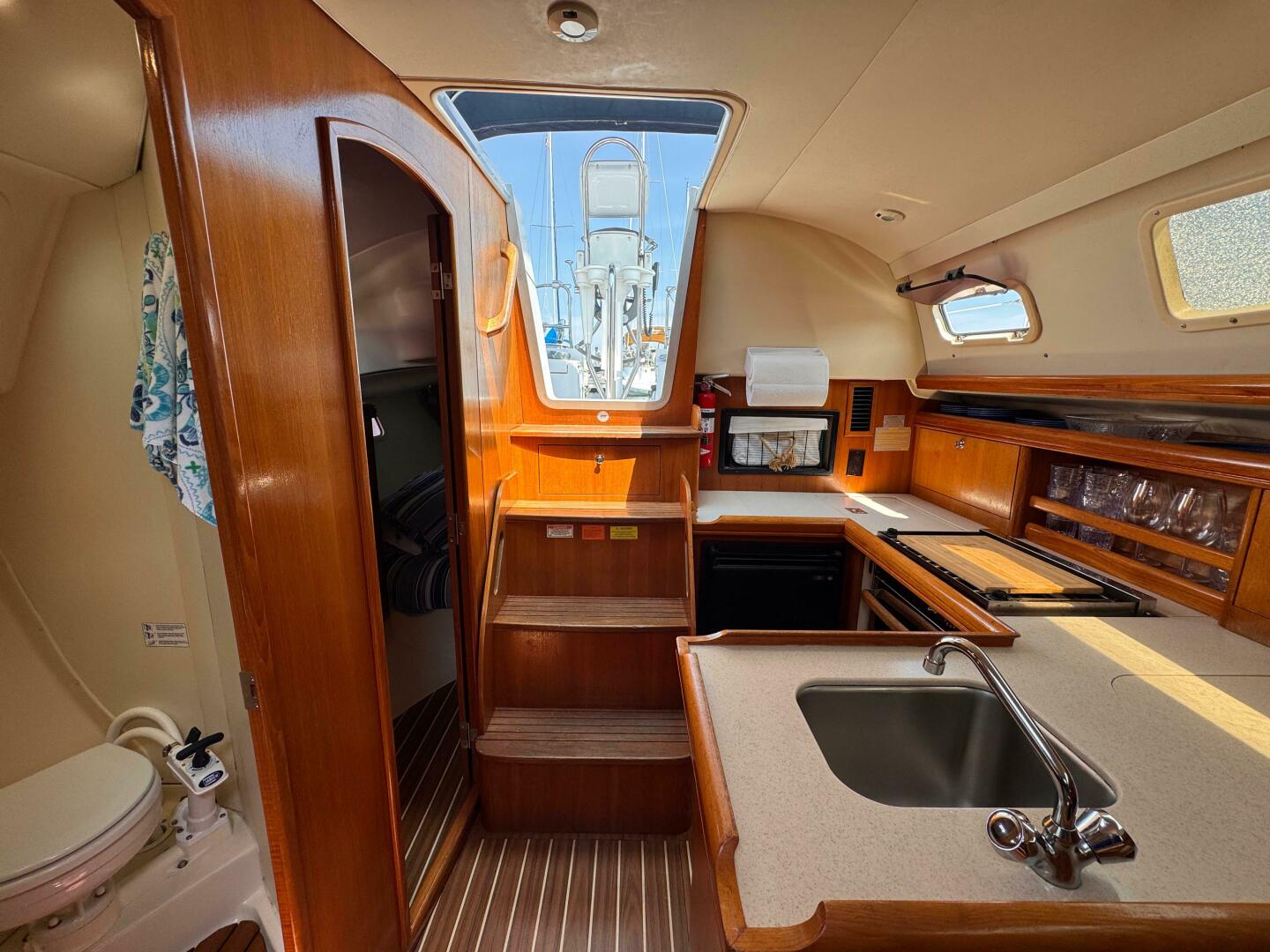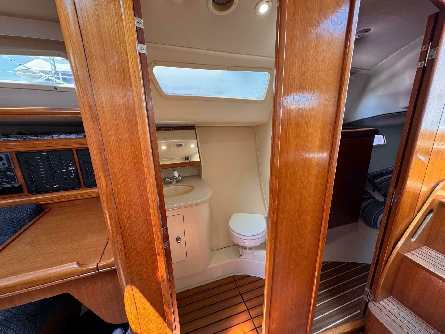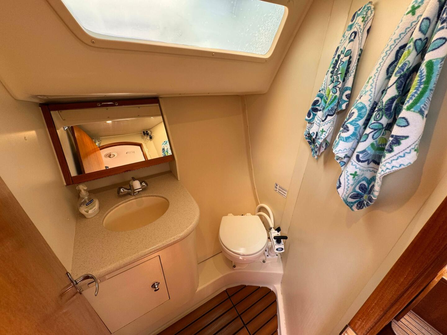 - Enclosed Head – With vanity, shower, and marine toilet