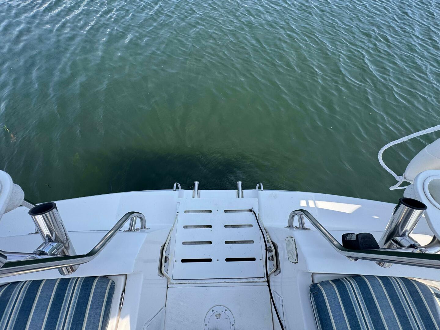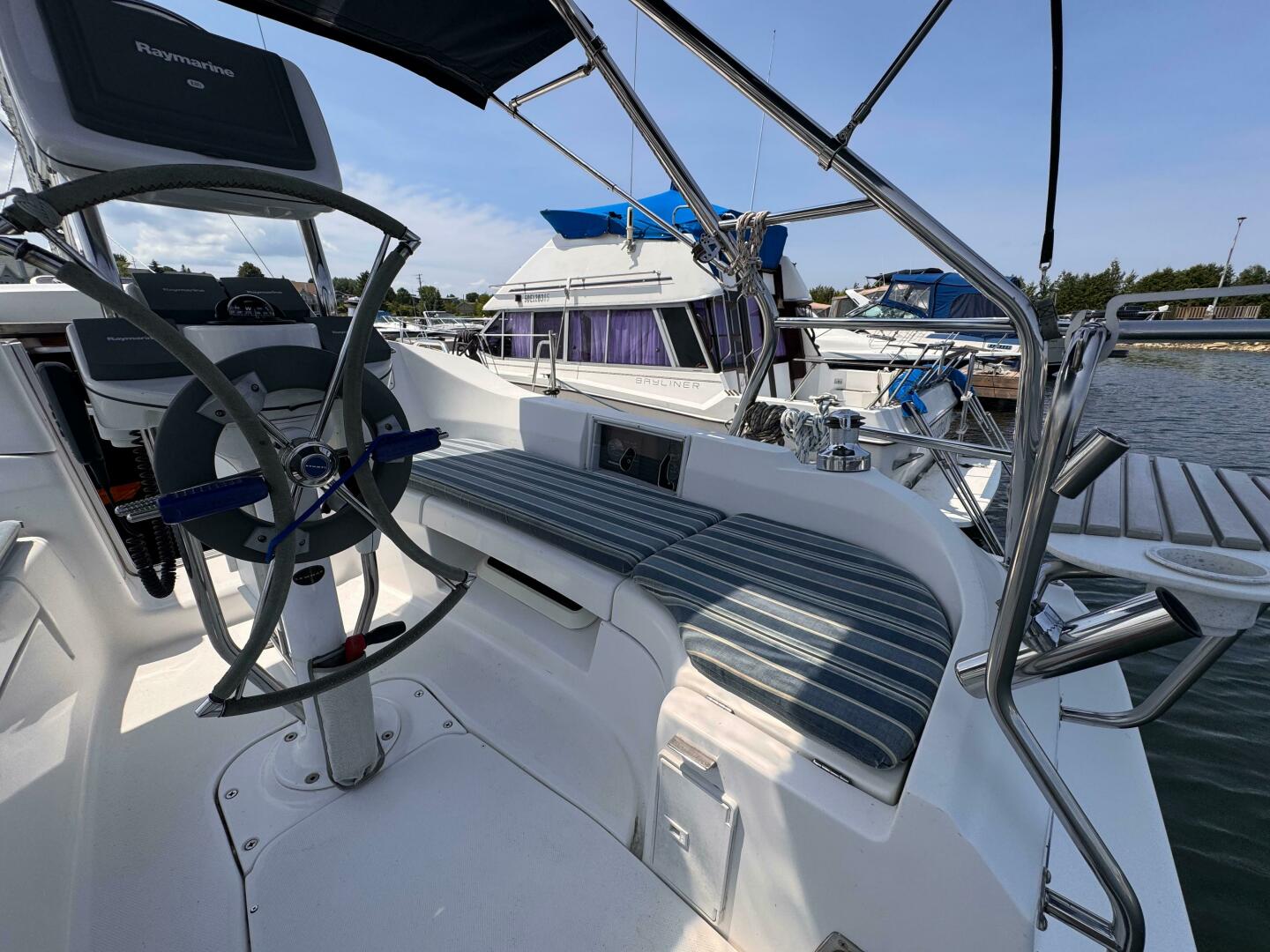 - Spacious Cockpit – With pedestal steering, folding wheel, and walk-through transom