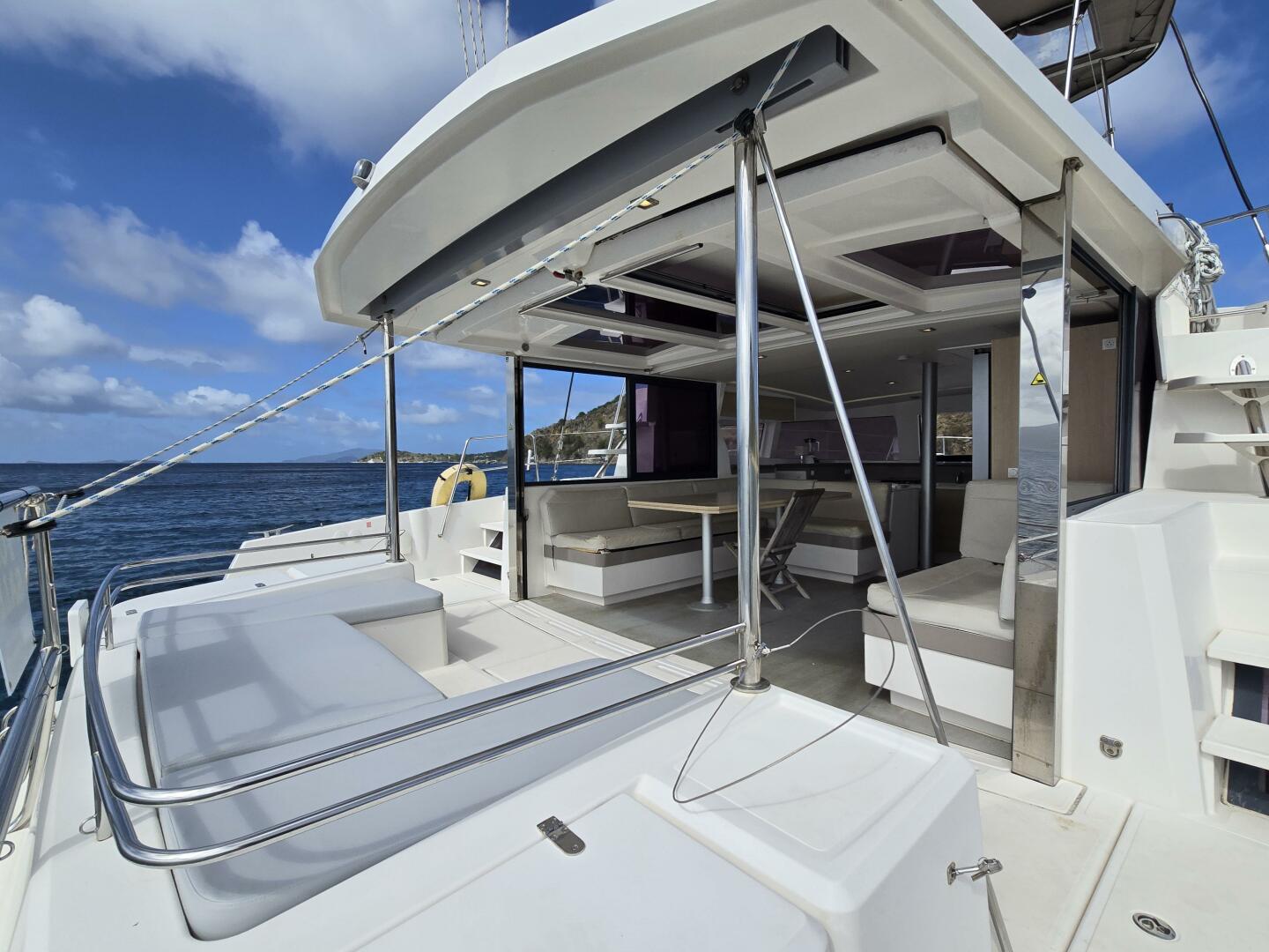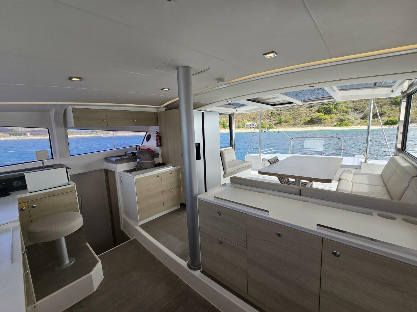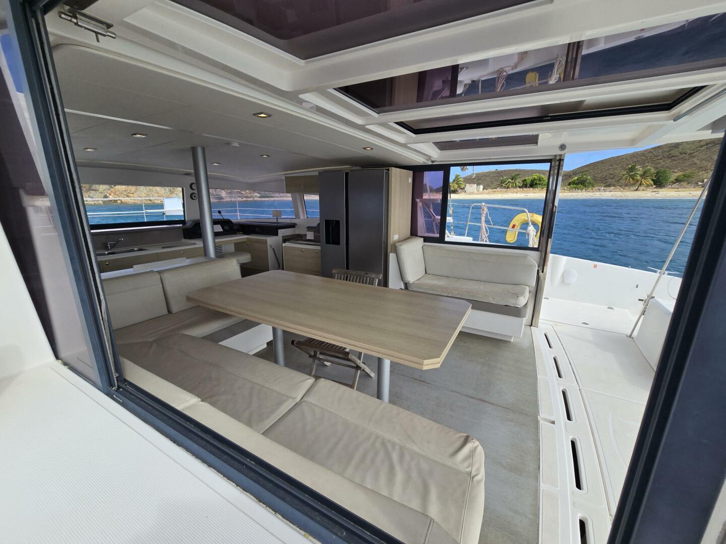 The garage-style aft door is genuinely innovative and transforms the layout—opening the saloon up into the cockpit in a way that few boats can match.
