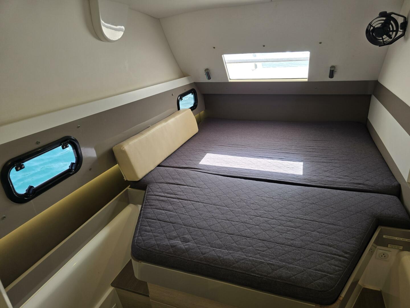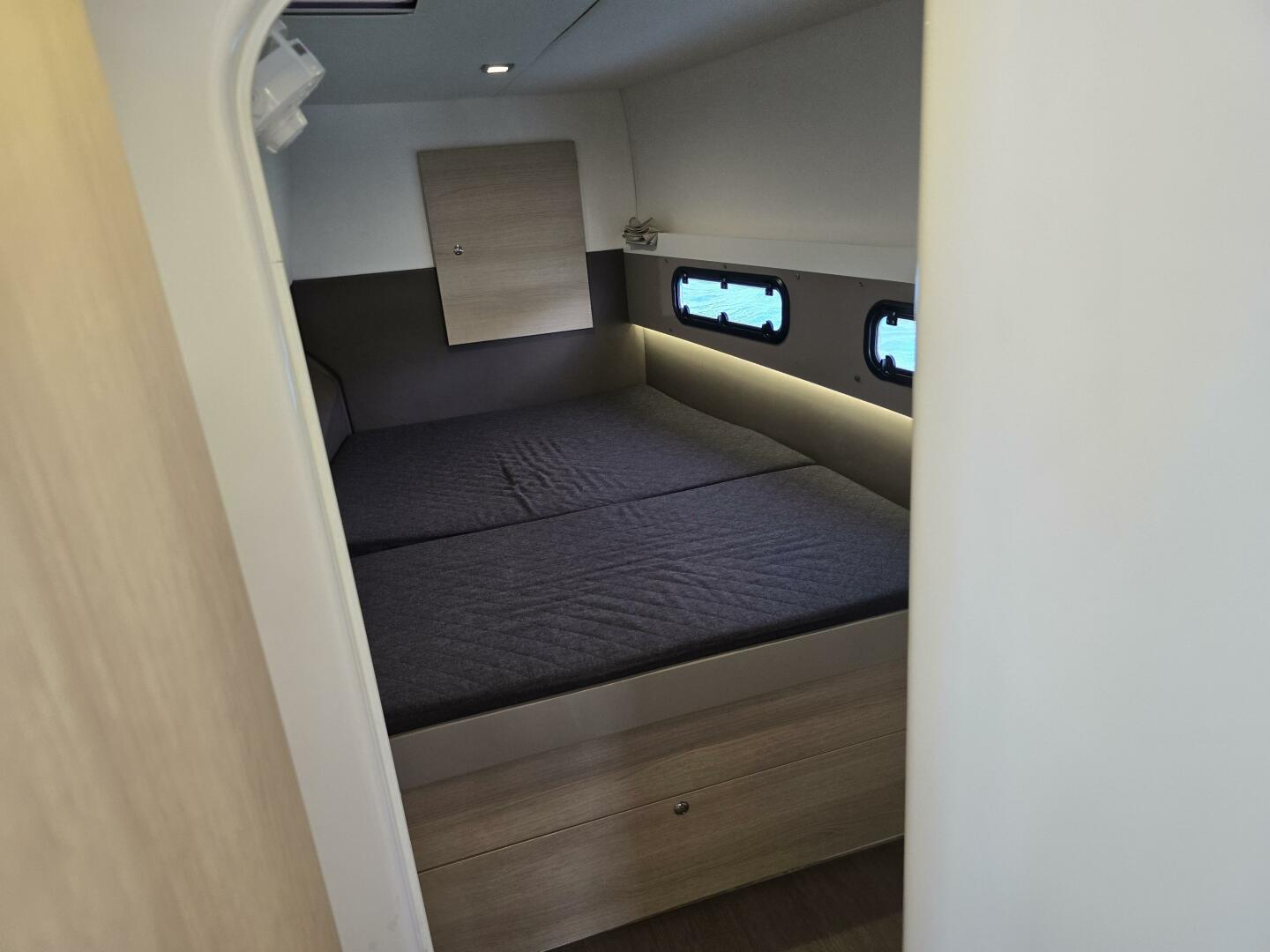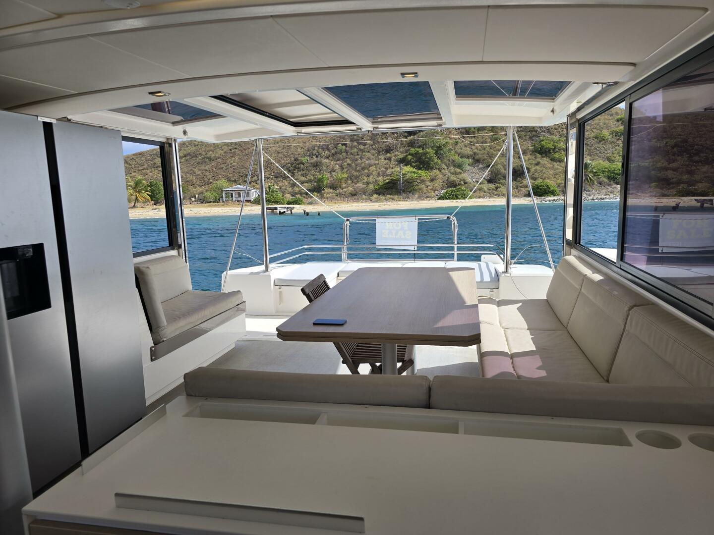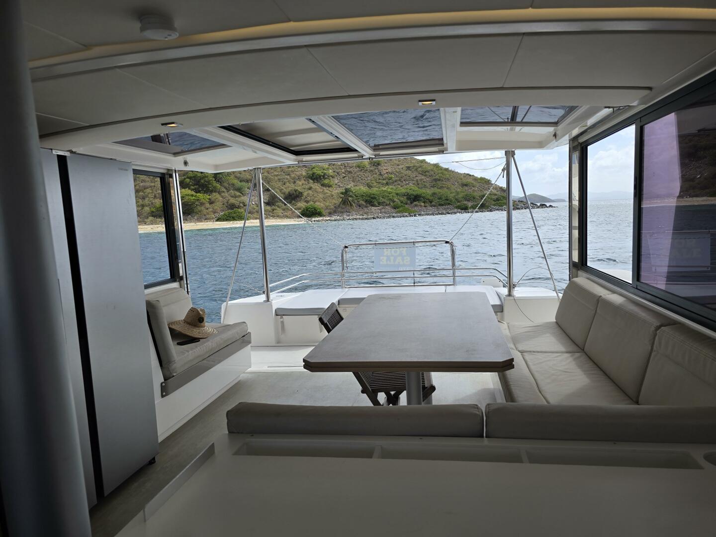 The garage-style aft door is genuinely innovative and transforms the layout—opening the saloon up into the cockpit in a way that few boats can match.