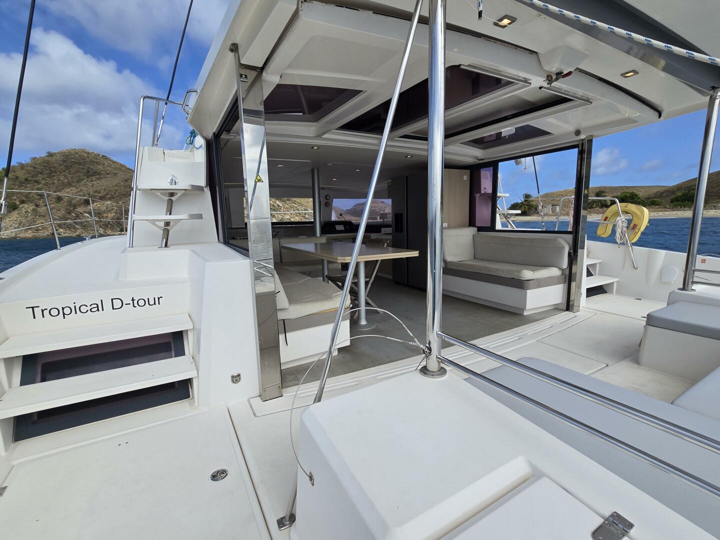 "Tropical D Tour" has typical cosmetic wear from her time in charter: the interior cushions are due for a refresh and the floor shows signs of traffic, but the cabins remain in good condition.