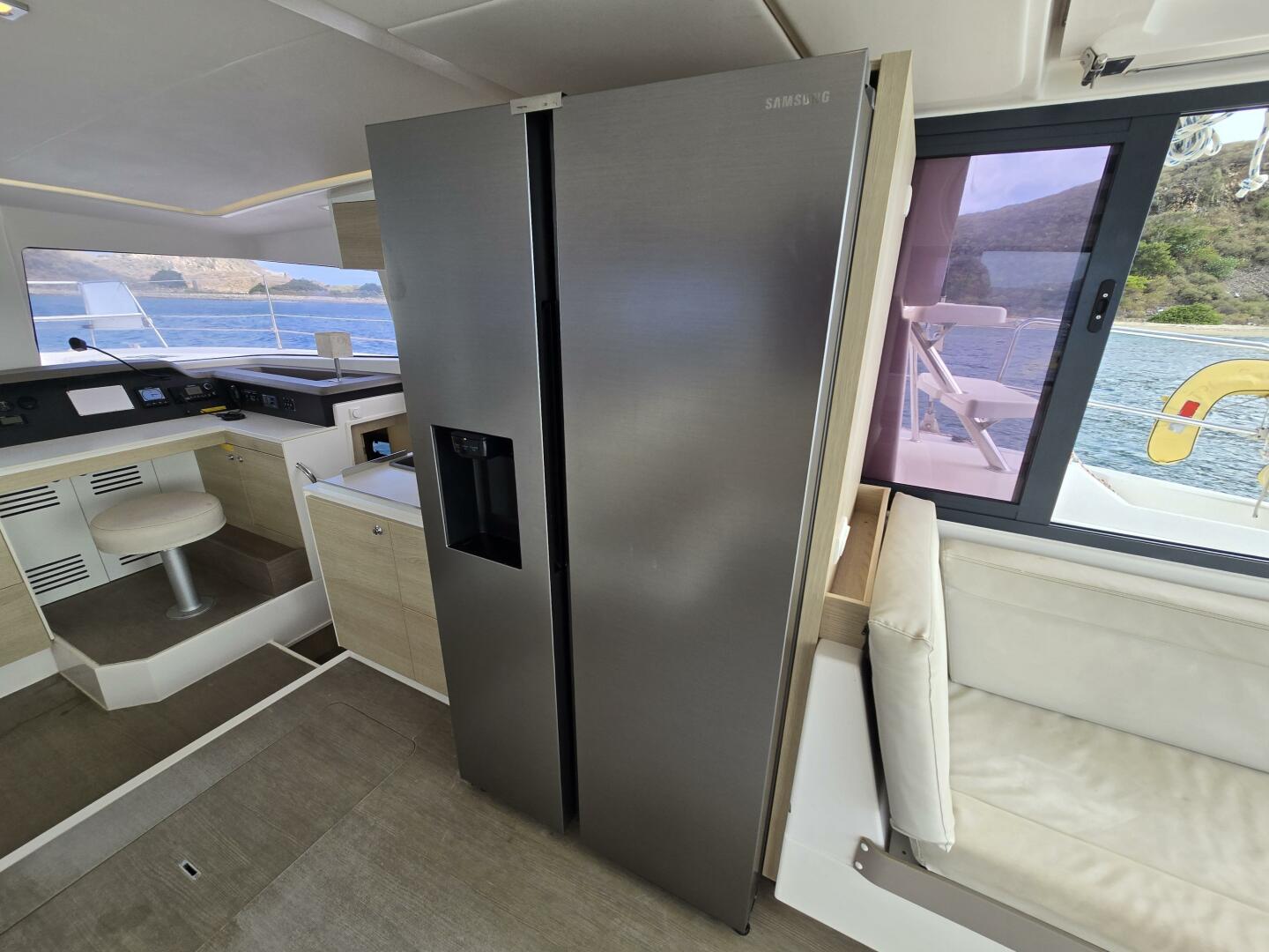 | Notable Upgrades: 2025 upgrades include new running rigging, a brand-new Samsung American-style fridge freezer with chilled water and ice, and recovered cushions on the flybridge and transom. Fully equipped with generator, solar panels, A/C, and a watermaker for total cruising autonomy. |