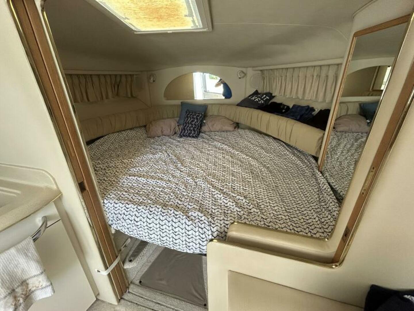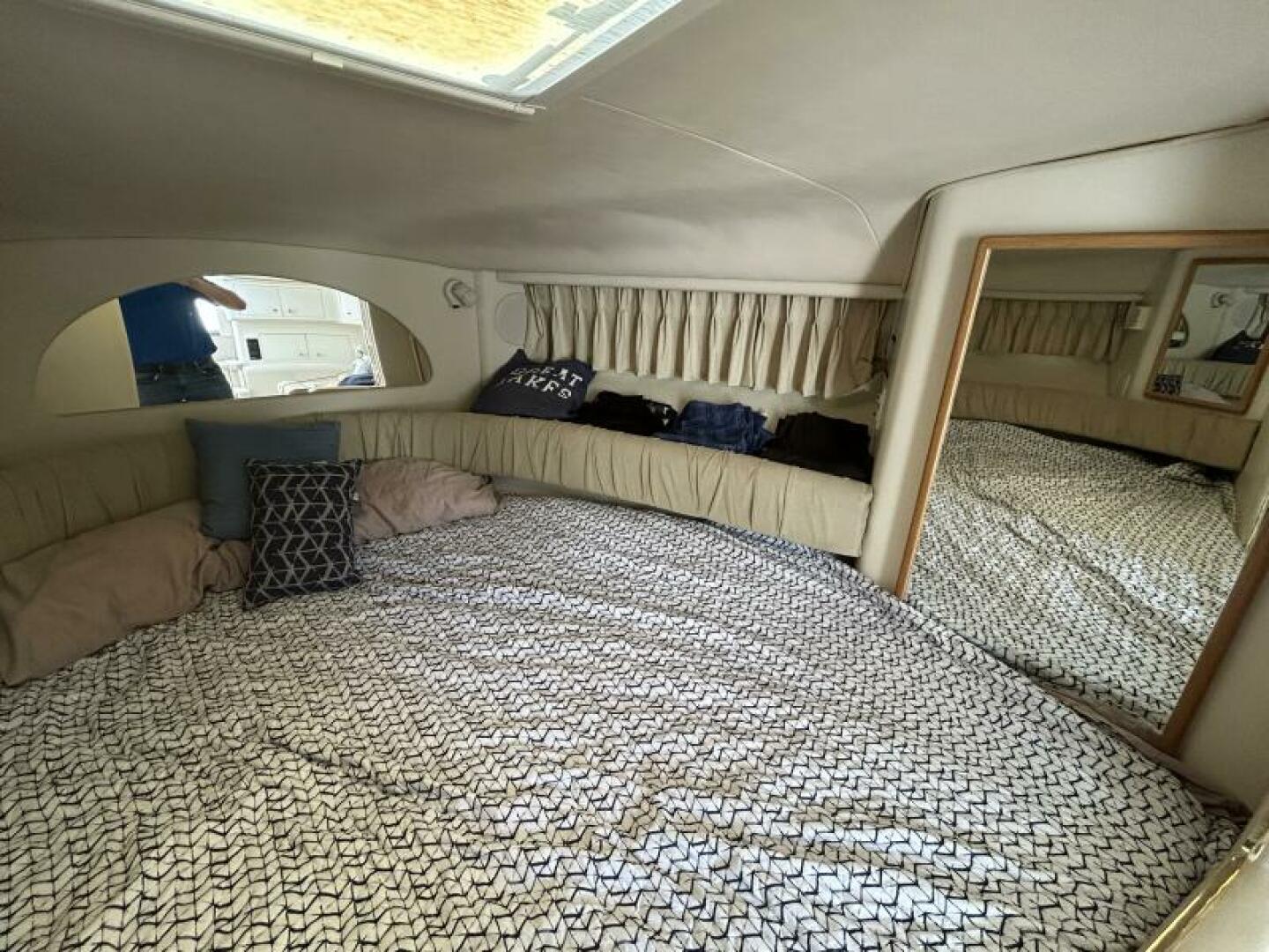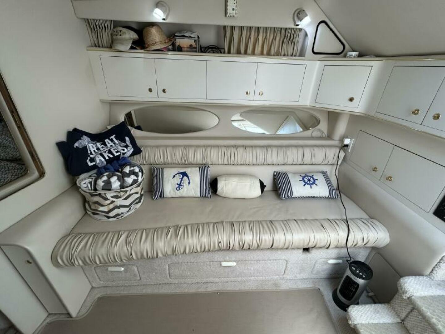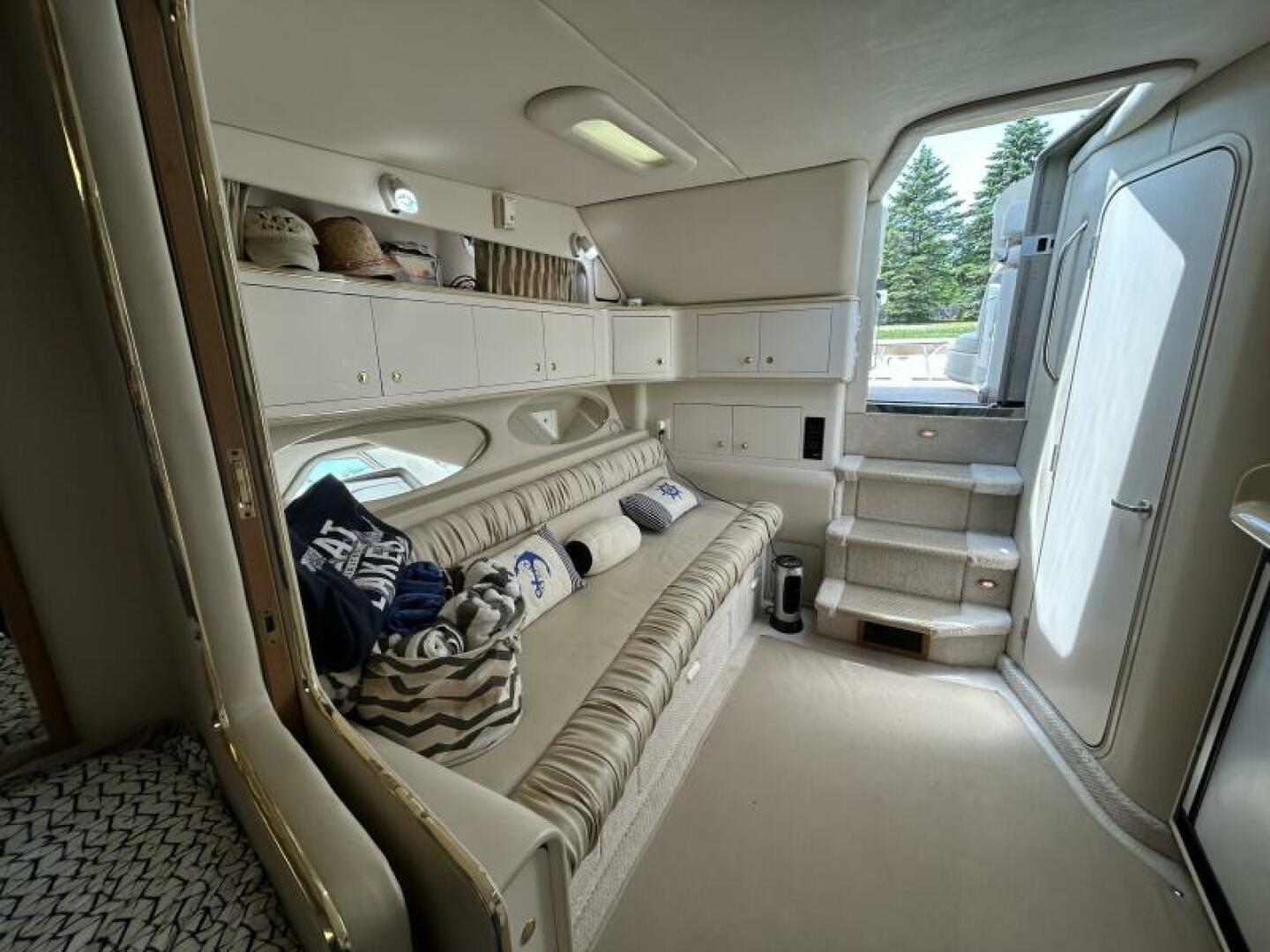 The large cockpit is ideal for entertaining or sport fishing. The helm area includes a double captain’s seat, companion seating, and clear sight lines for easy handling. This boat offers a deep-V fiberglass hull for smooth handling in open water, wide beam provides exceptional deck and cabin space, Generator, shore power, and marine air for full off-grid comfort, built on the same robust platform as the Sea Ray 340, with added fishability.