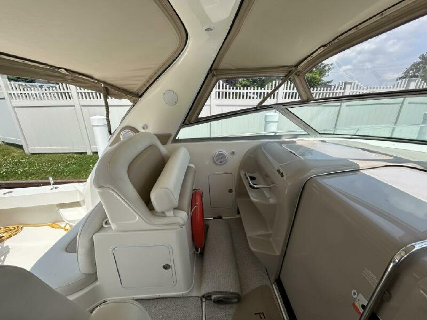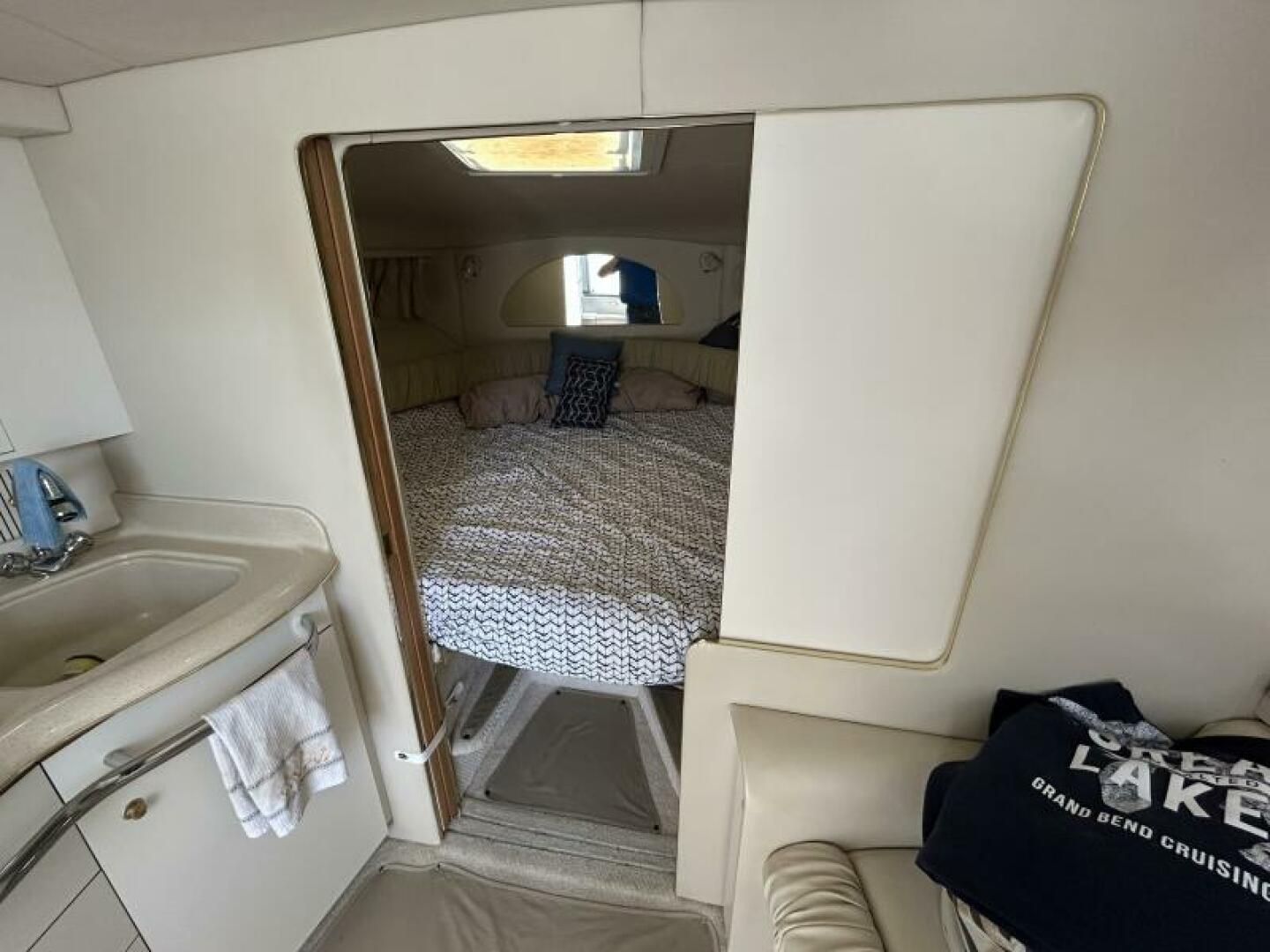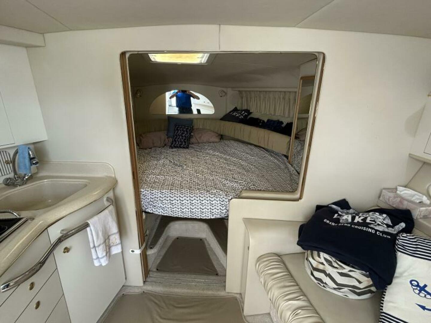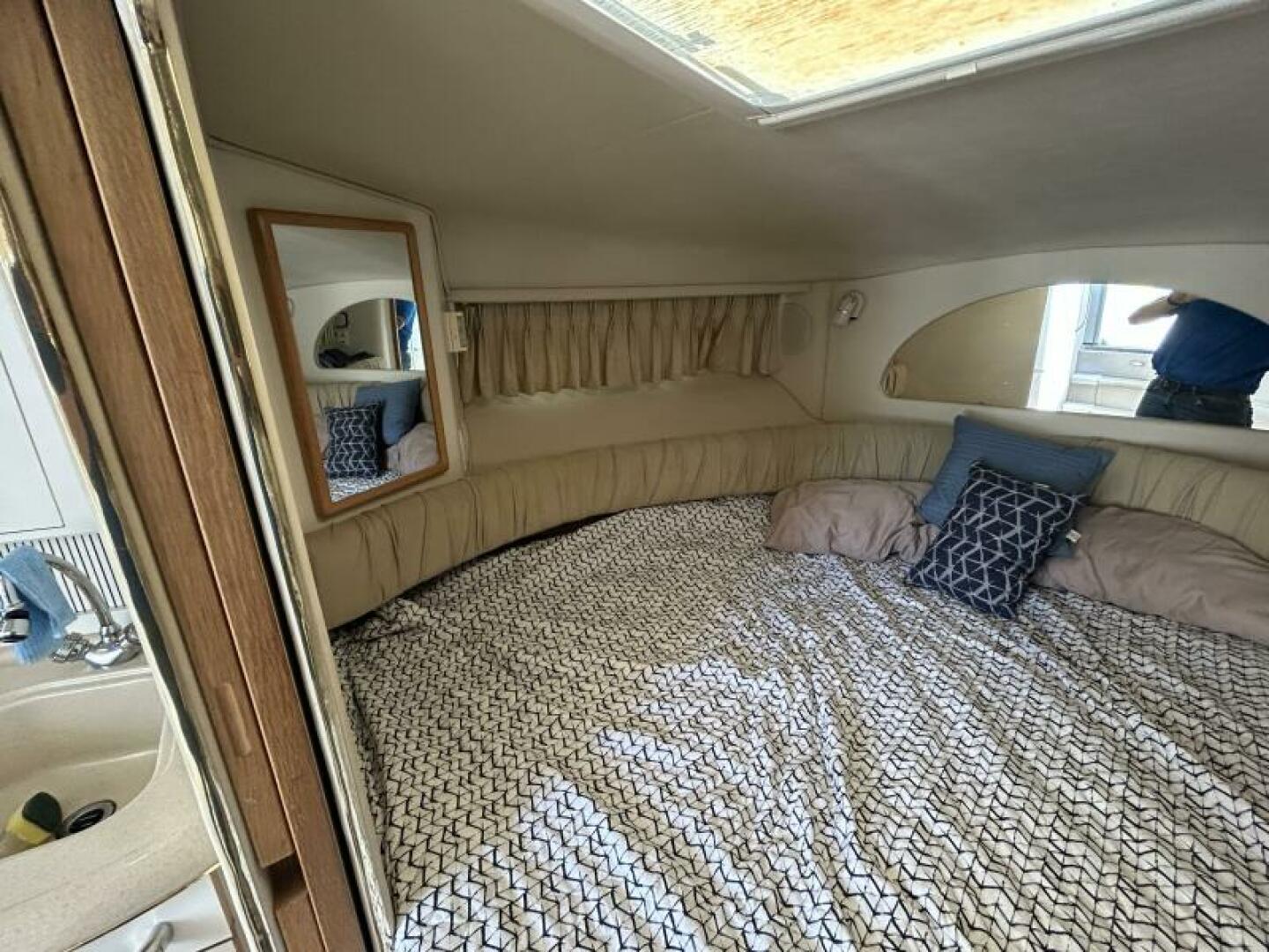 The large cockpit is ideal for entertaining or sport fishing. The helm area includes a double captain’s seat, companion seating, and clear sight lines for easy handling. This boat offers a deep-V fiberglass hull for smooth handling in open water, wide beam provides exceptional deck and cabin space, Generator, shore power, and marine air for full off-grid comfort, built on the same robust platform as the Sea Ray 340, with added fishability.