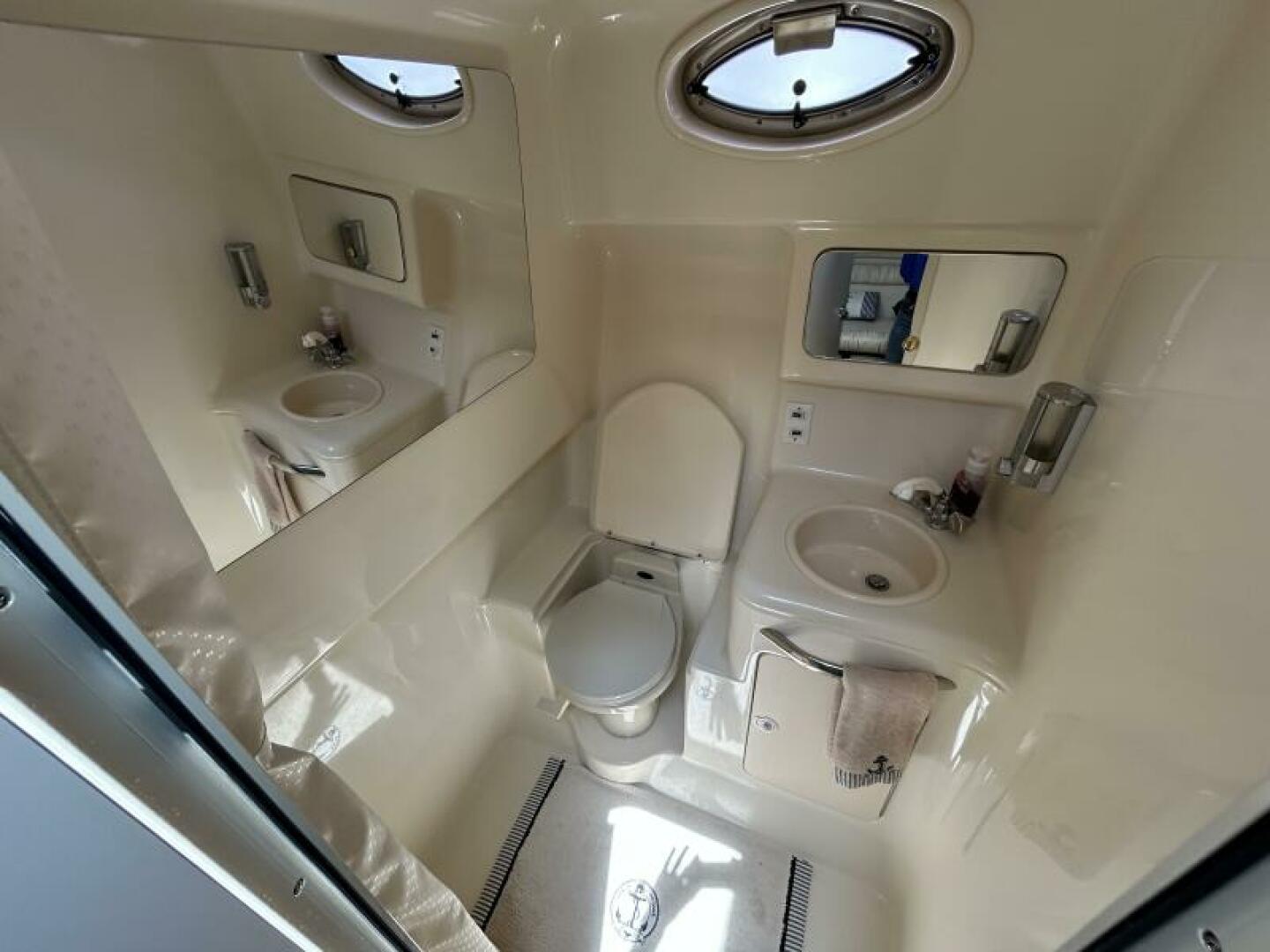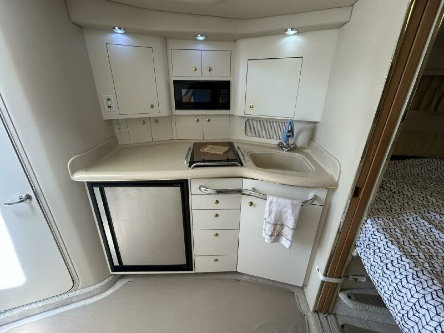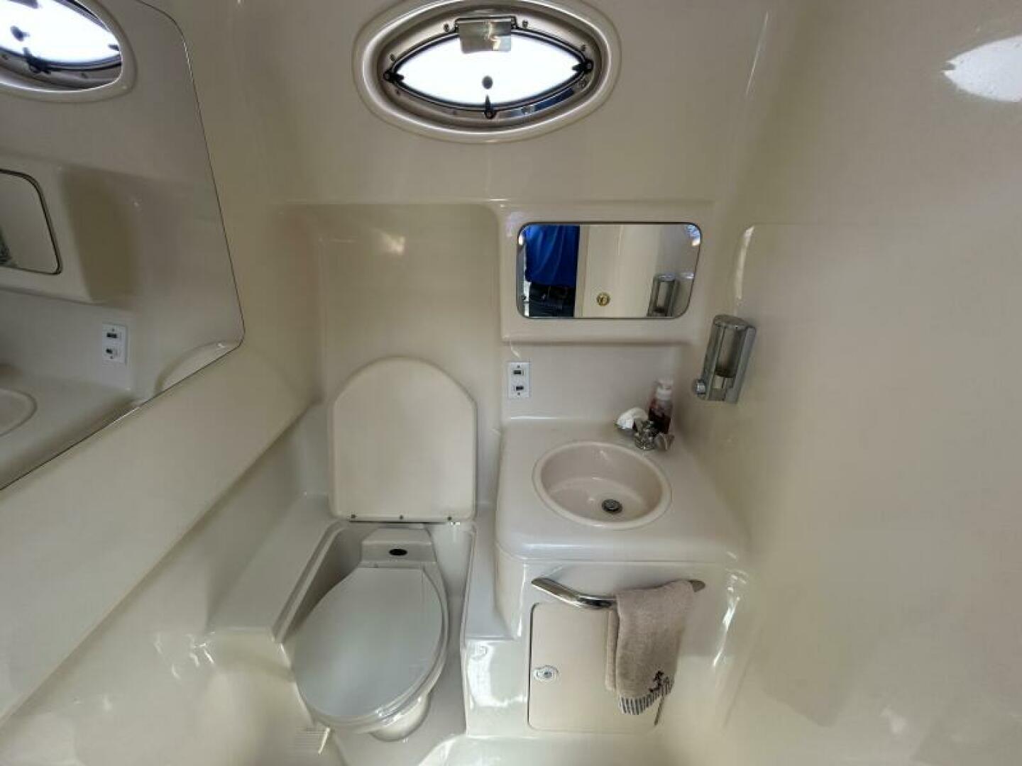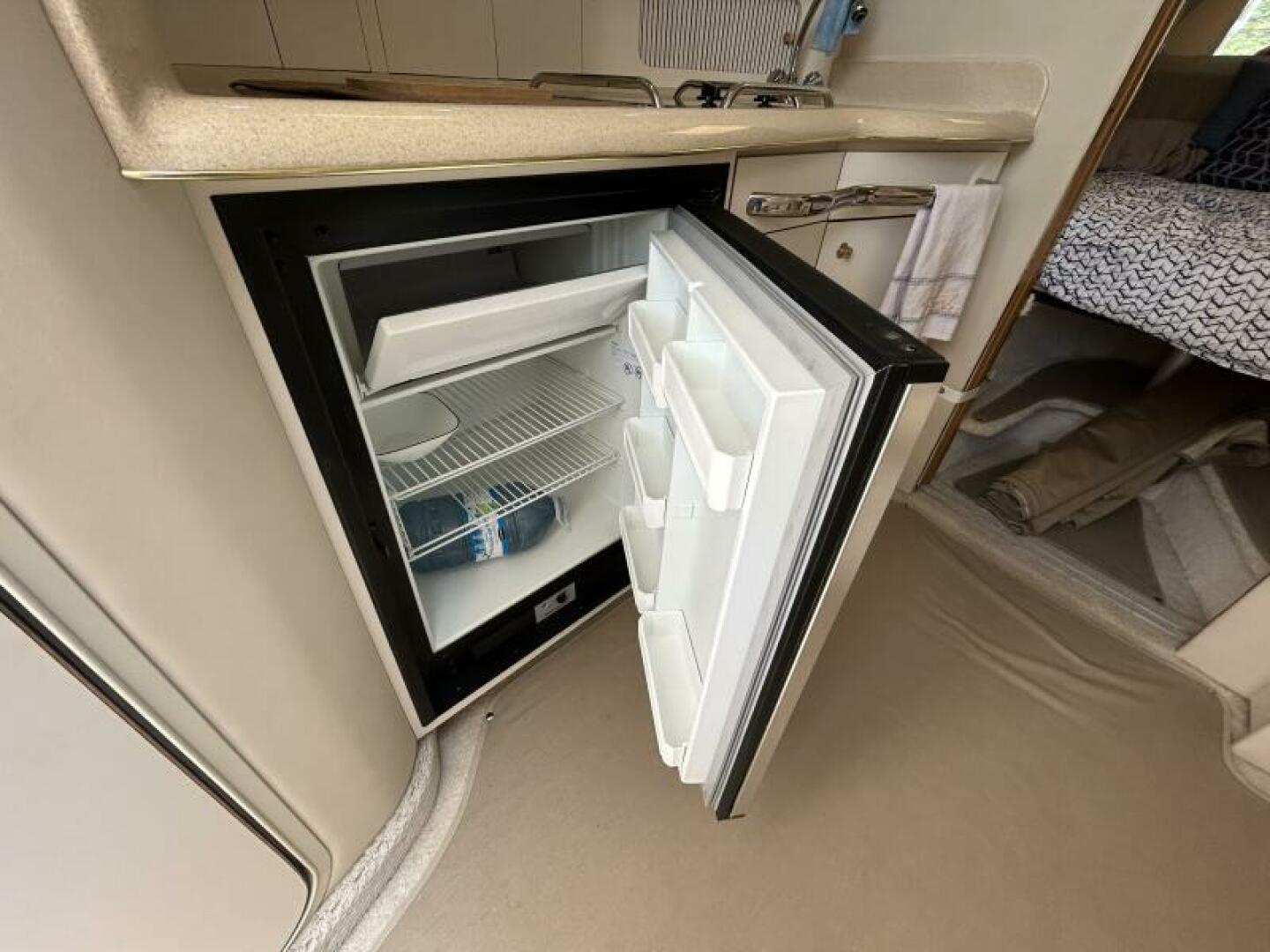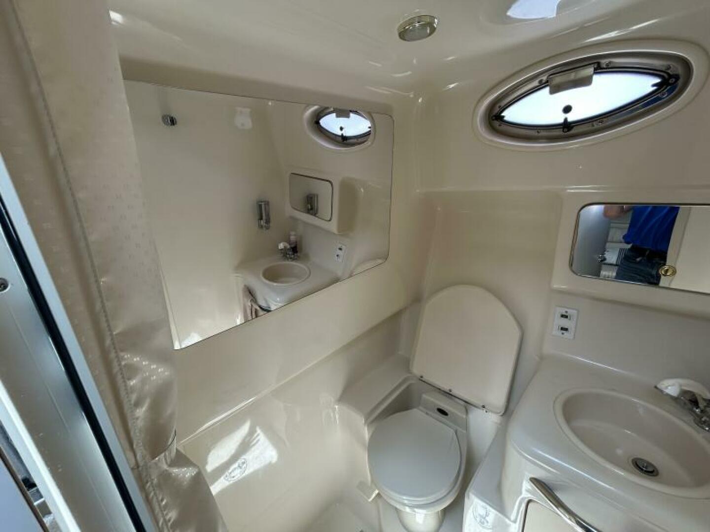 The large cockpit is ideal for entertaining or sport fishing. The helm area includes a double captain’s seat, companion seating, and clear sight lines for easy handling. This boat offers a deep-V fiberglass hull for smooth handling in open water, wide beam provides exceptional deck and cabin space, Generator, shore power, and marine air for full off-grid comfort, built on the same robust platform as the Sea Ray 340, with added fishability.