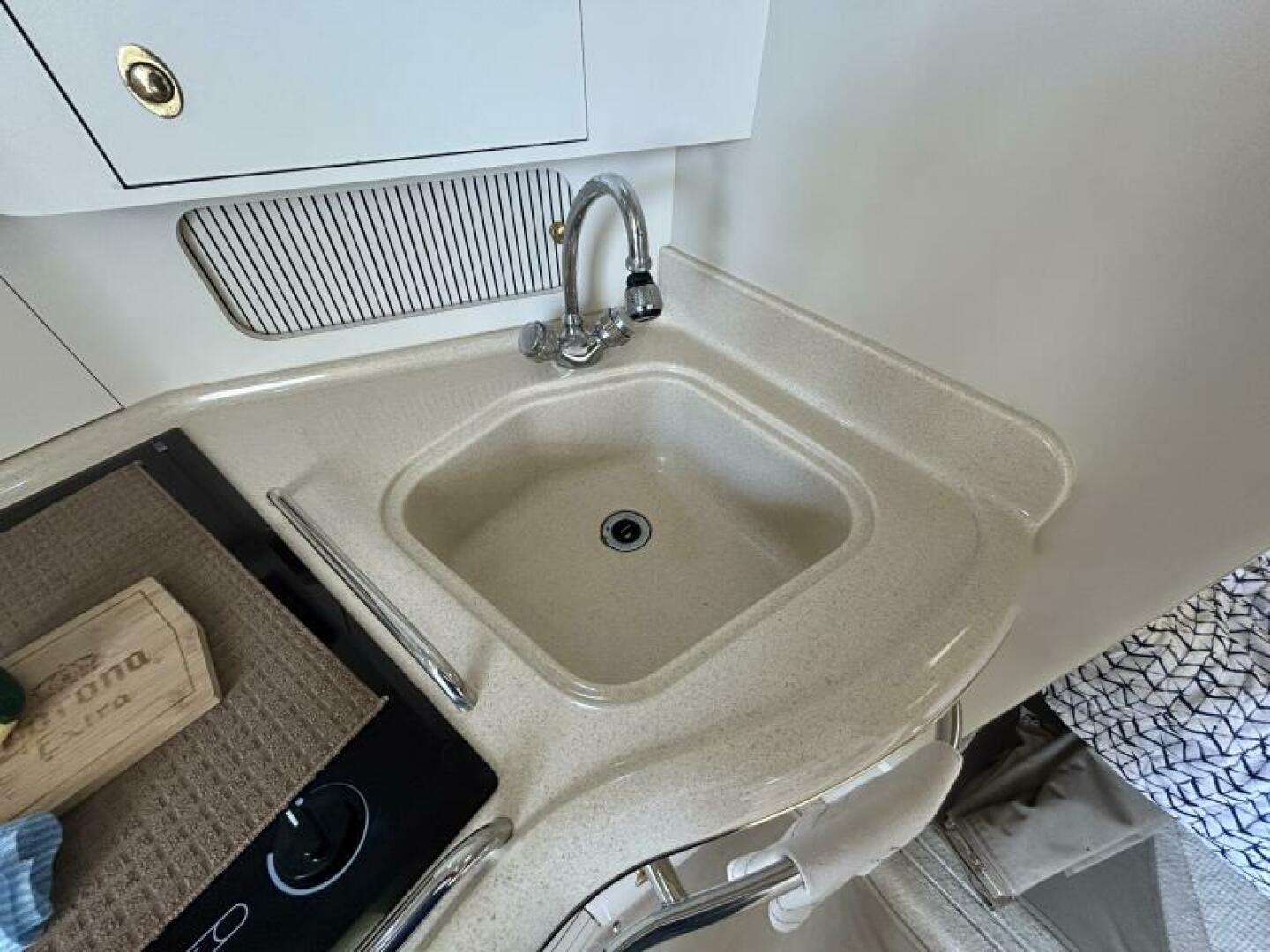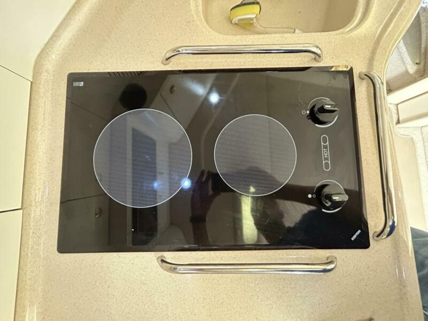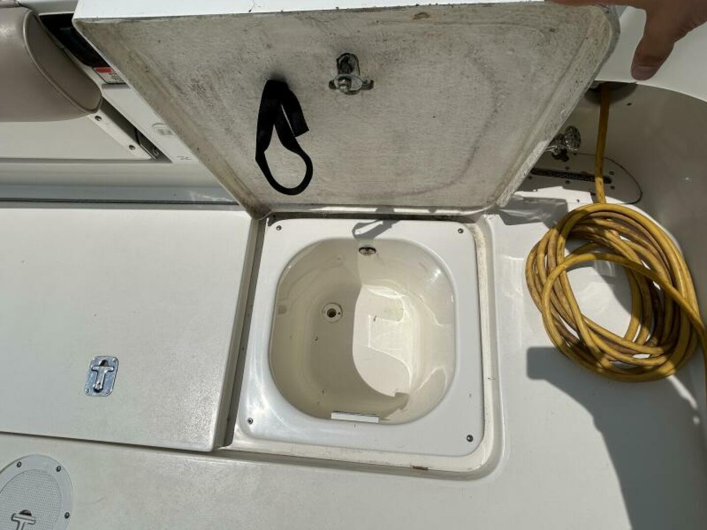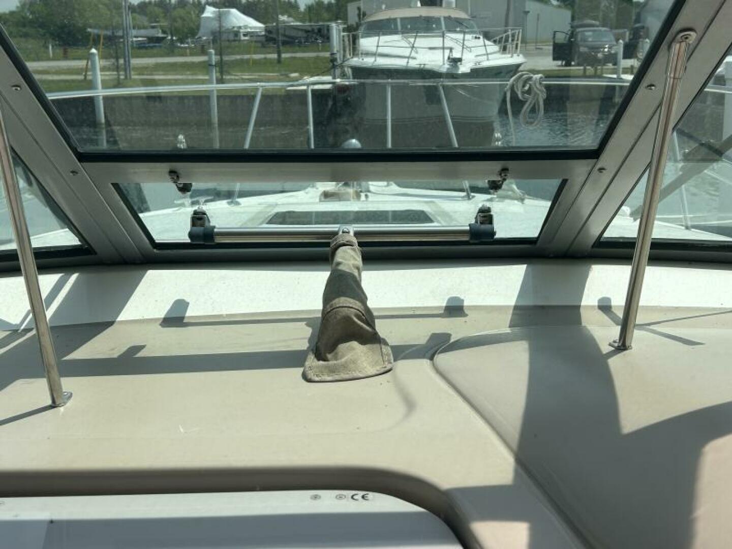 The large cockpit is ideal for entertaining or sport fishing. The helm area includes a double captain’s seat, companion seating, and clear sight lines for easy handling. This boat offers a deep-V fiberglass hull for smooth handling in open water, wide beam provides exceptional deck and cabin space, Generator, shore power, and marine air for full off-grid comfort, built on the same robust platform as the Sea Ray 340, with added fishability.