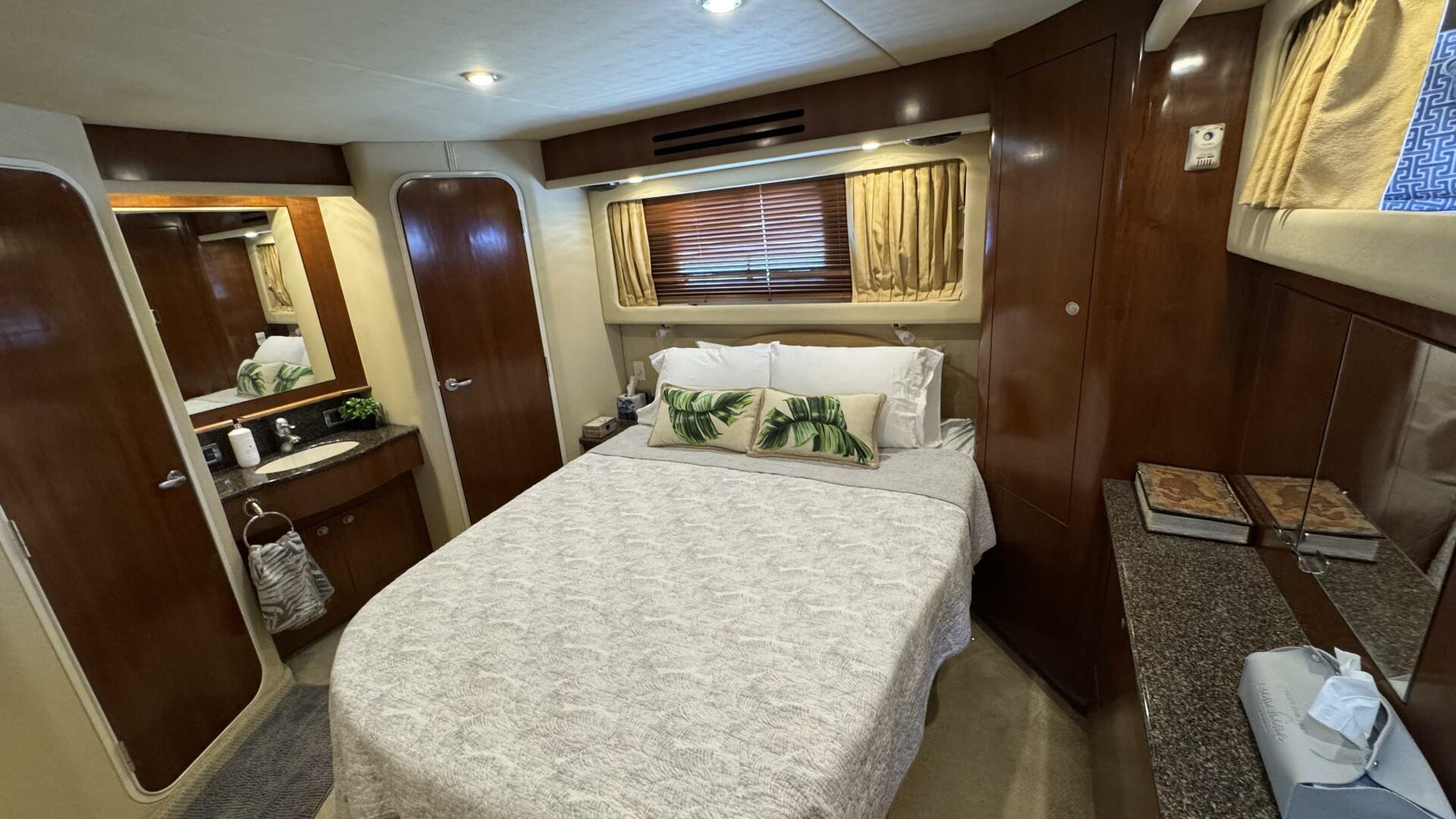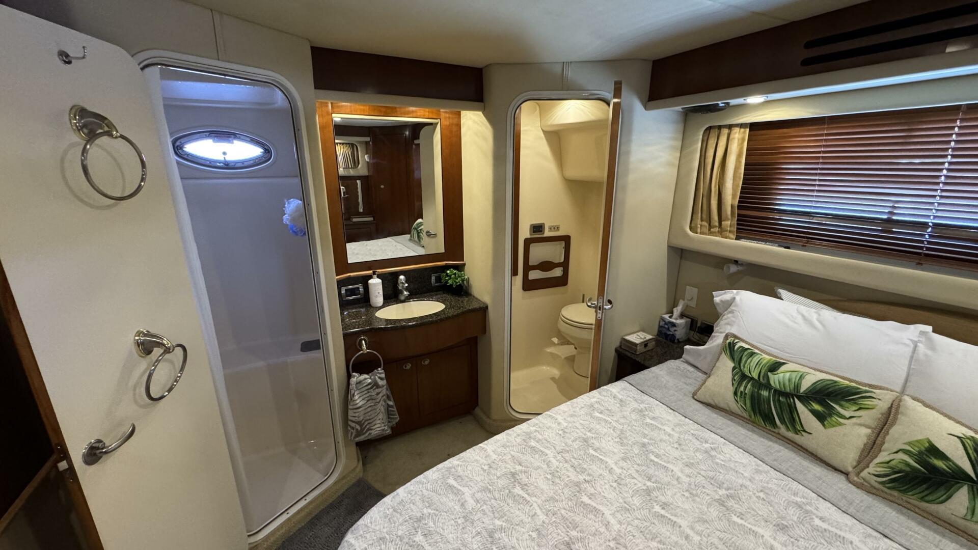 Aft-Cabin: Large Centerline Walk-Around Queen with Separate Head & Shower, Plus Vanity with Mirror.