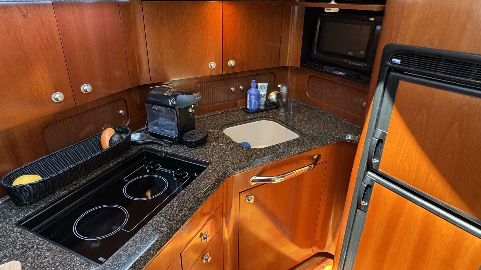 The full-featured lower galley offers Corian countertops, a recessed glass-top stove, Sharp convection microwave, full-size refrigerator, and washer/dryer combo.